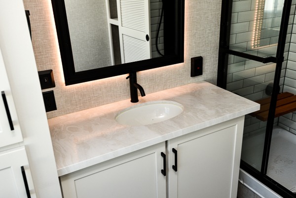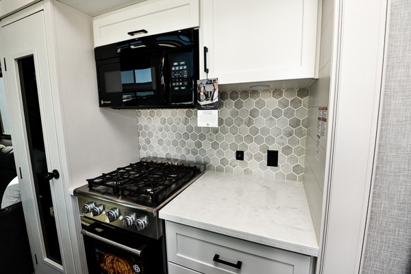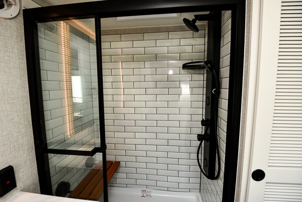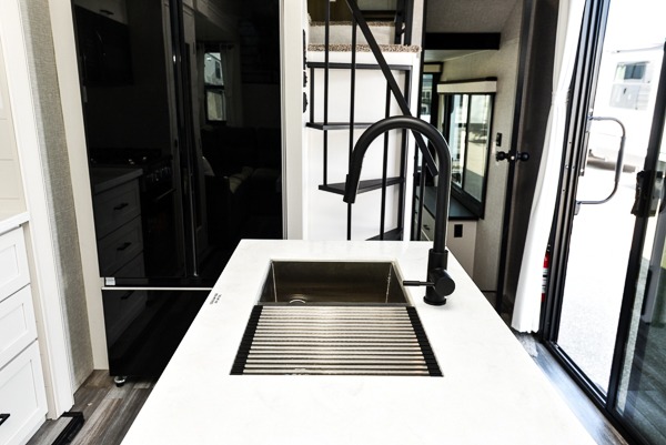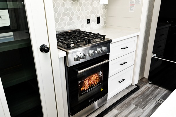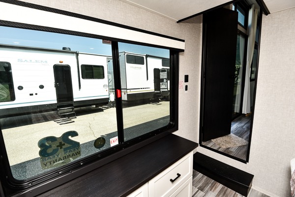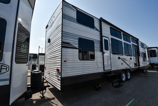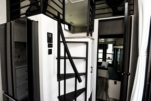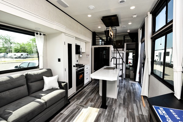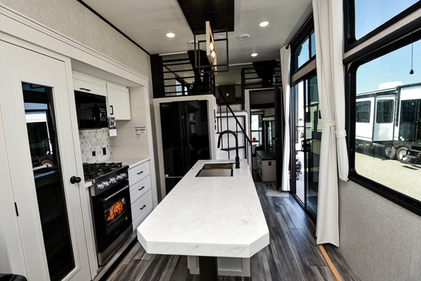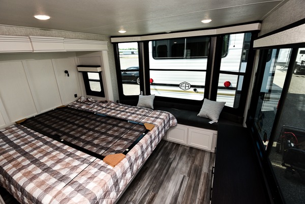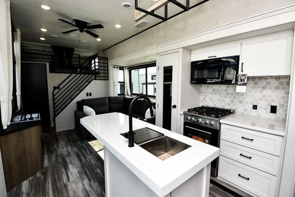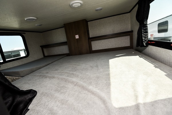Travel in comfort with your family. You will love having your own bedroom up front with a queen bed, a bench with storage below, plus a dresser and over head cabinet for your things. This unit comes with more space for everyone to sleep for instance the loft area, which has multiple bunk mats where three people can easily fit, or the sectional sofa with hide-a-bed situated in the living room, ideal for two. Also in the living area, you will be able to enjoy the entertainment center, plus, a ceiling fan will keep the air moving while the chef cooks delicious meals in the morning, and you all can dine at the kitchen island which includes bar stools. The Kitchen is also fitted with a residential fridge, microwave, four cooktop burner, sink and pantry perfect to cook with luxury and comfort. Finally, take a bath in the full rear bathroom.