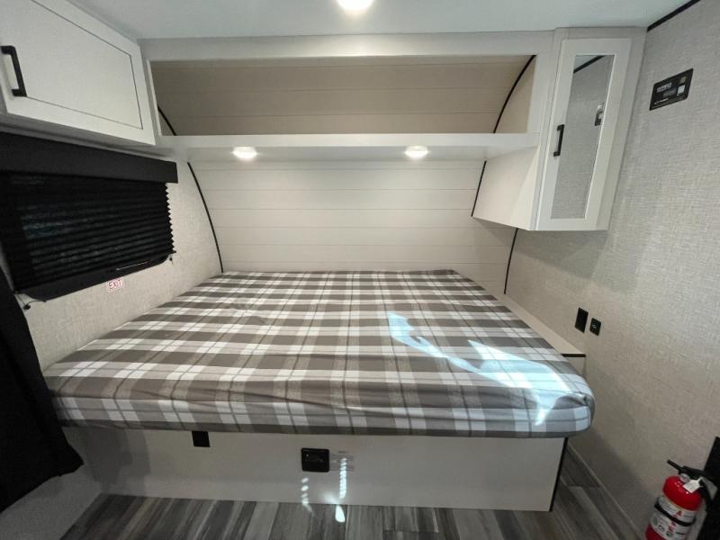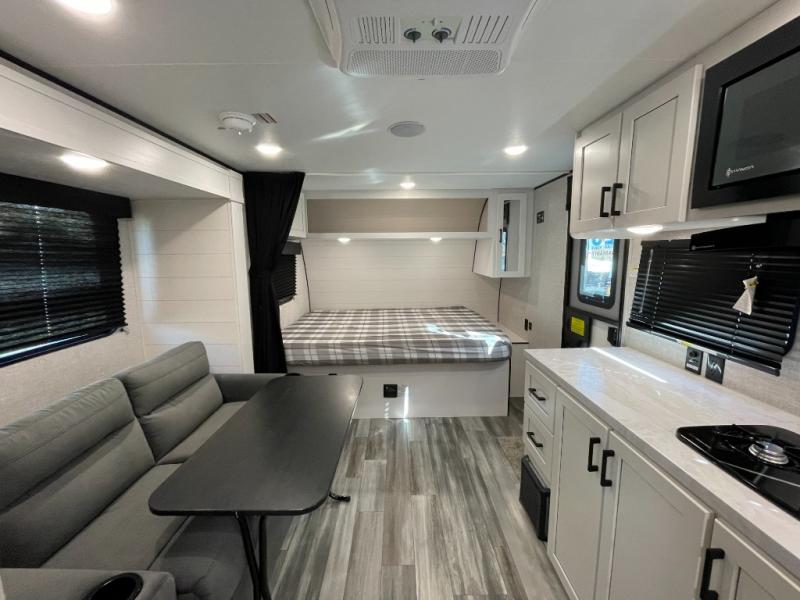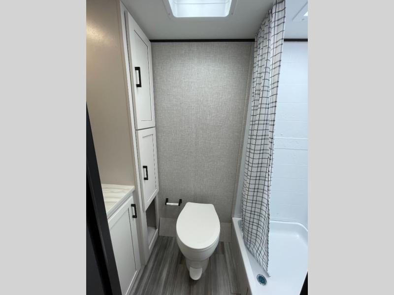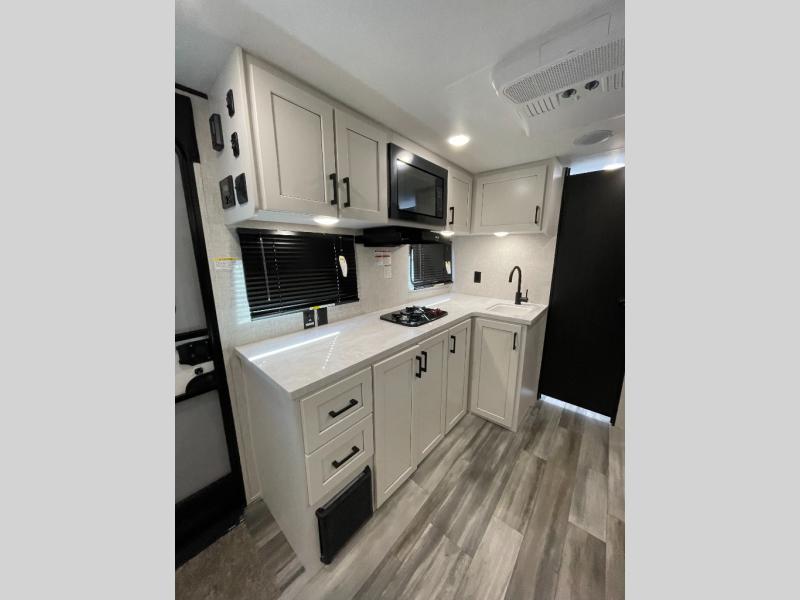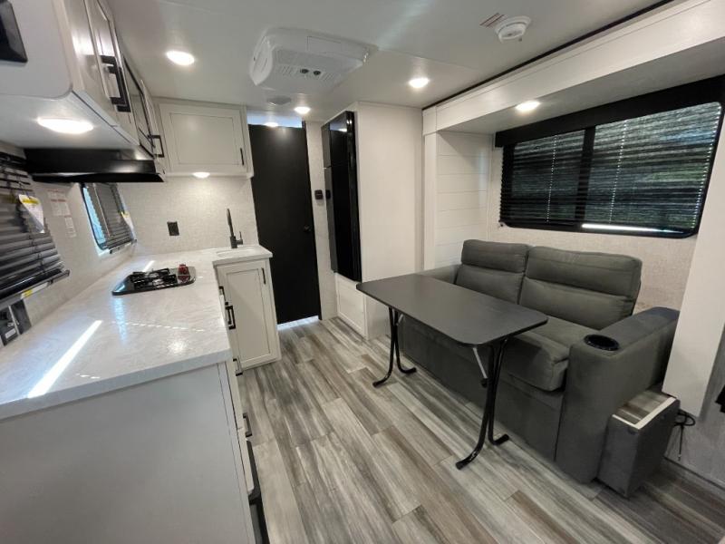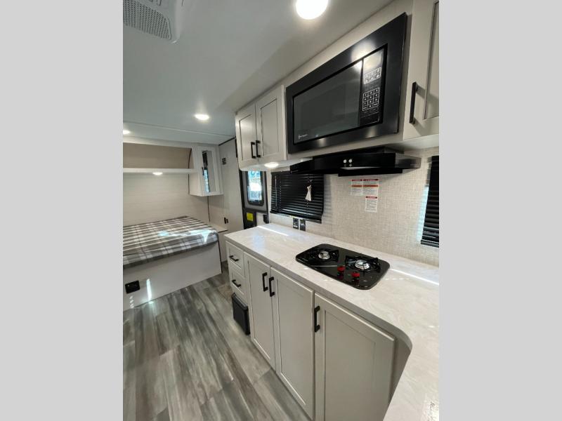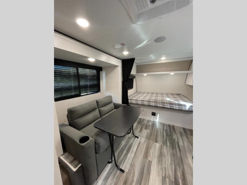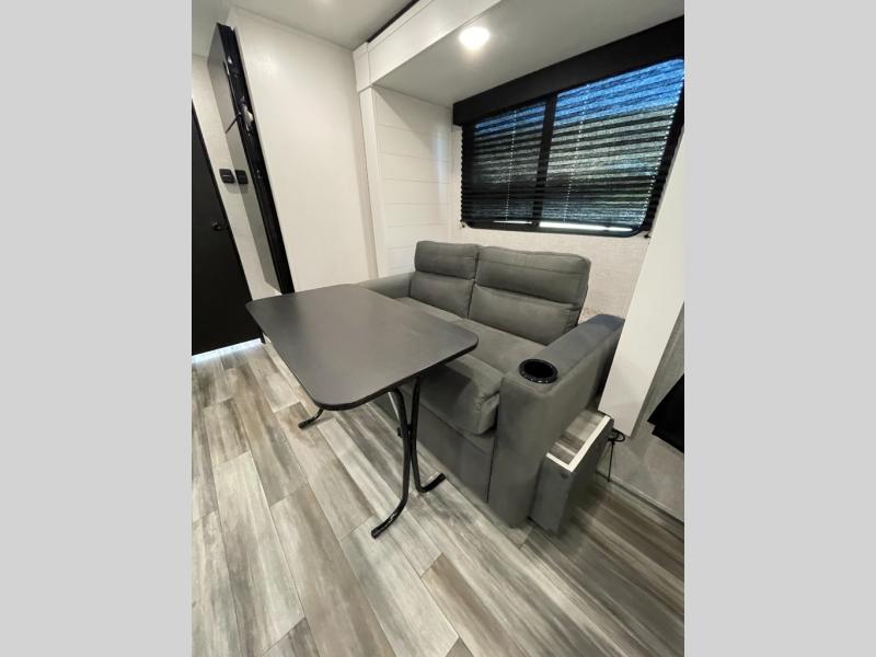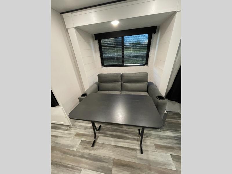 This single-axle couple's travel trailer is sure to bring you happiness at the campground. There is a front queen bed with a privacy curtain if you have a guest staying over on the jack-knife sofa, and the movable table in front of the sofa will provide more floor space when needed. A cooktop and microwave oven will let you make meals each day, and an 8 cu. ft. 12V refrigerator will be perfect for perishables. This model also includes a full rear bath with a tub/shower, a toilet, plus a sink and a linen closet for clean towels. The optional STX Edition can be added on this model which includes 16 in. off-road tires, triple entry steps, a power tongue jack, and more!