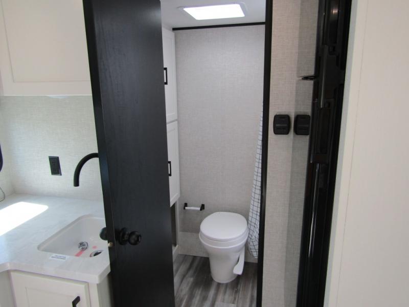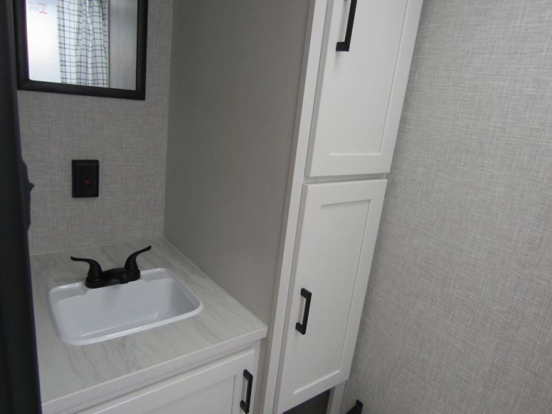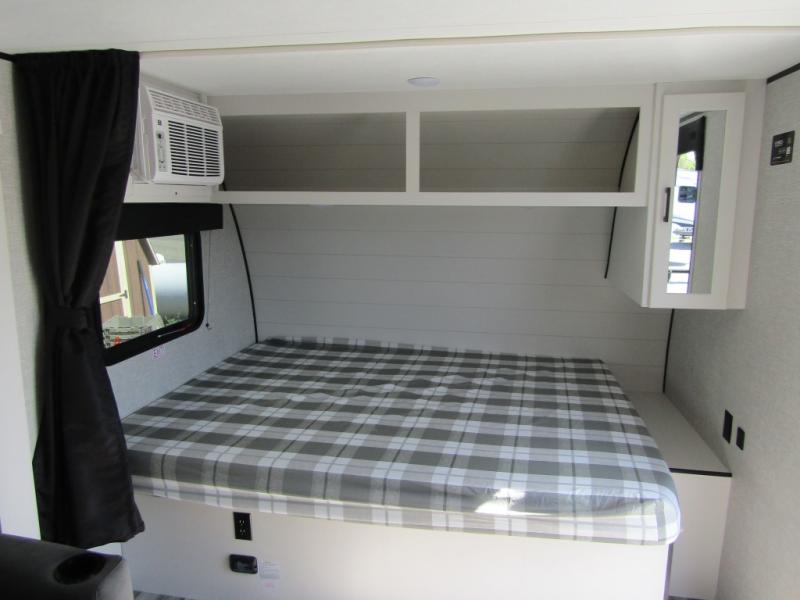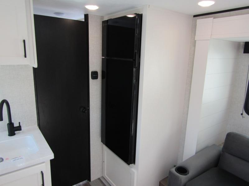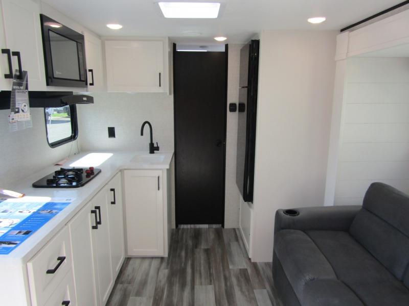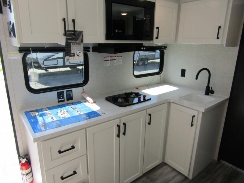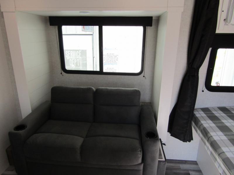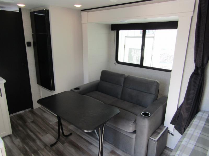 This single-axle couple's travel trailer is sure to bring you happiness at the campground. There is a front queen bed with a privacy curtain if you have a guest staying over on the jack-knife sofa, and the movable table in front of the sofa will provide more floor space when needed. A cooktop and microwave oven will let you make meals each day, and an 8 cu. ft. 12V refrigerator will be perfect for perishables. This model also includes a full rear bath with a tub/shower, a toilet, plus a sink and a linen closet for clean towels. The optional STX Edition can be added on this model which includes 16 in. off-road tires, triple entry steps, a power tongue jack, and more!