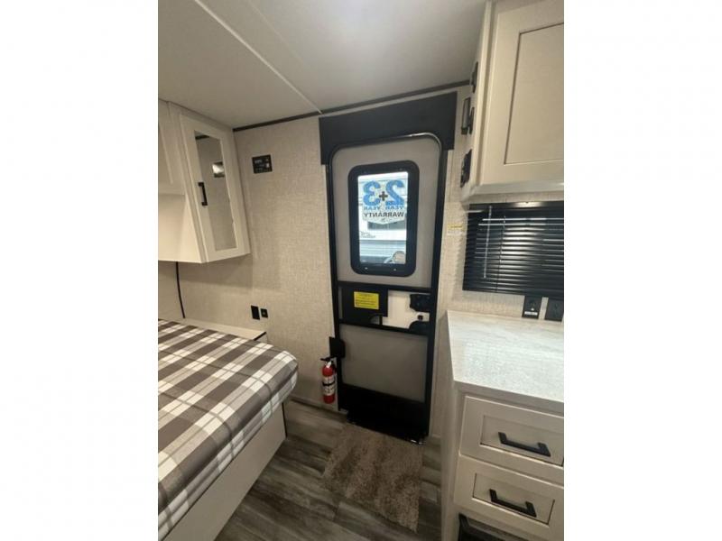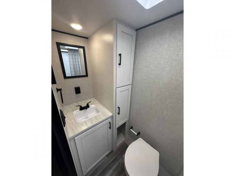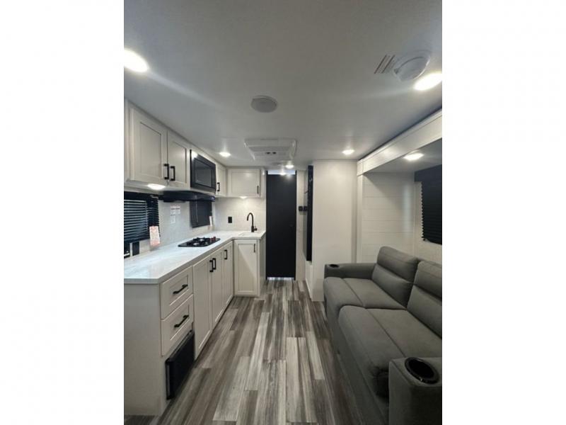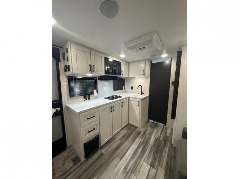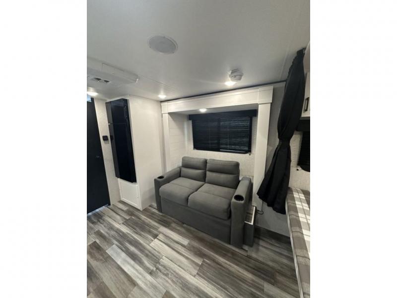 This single-axle couple's travel trailer is sure to bring you happiness at the campground. There is a front queen bed with a privacy curtain if you have a guest staying over on the jack-knife sofa, and the movable table in front of the sofa will provide more floor space when needed. A cooktop and microwave oven will let you make meals each day, and an 8 cu. ft. 12V refrigerator will be perfect for perishables. This model also includes a full rear bath with a tub/shower, a toilet, plus a sink and a linen closet for clean towels. The optional STX Edition can be added on this model which includes 16 in. off-road tires, triple entry steps, a power tongue jack, and more!