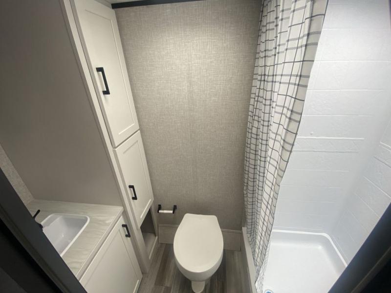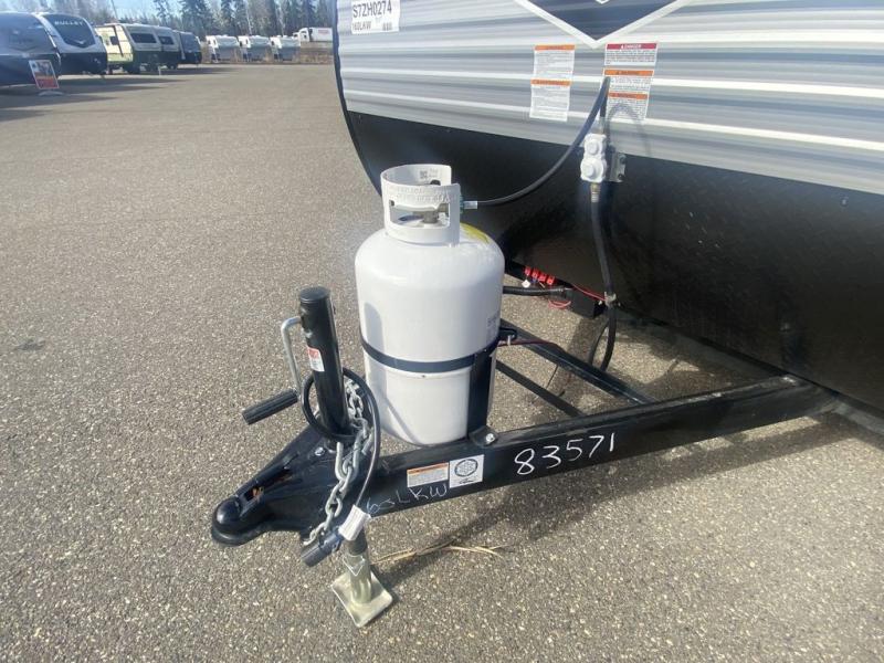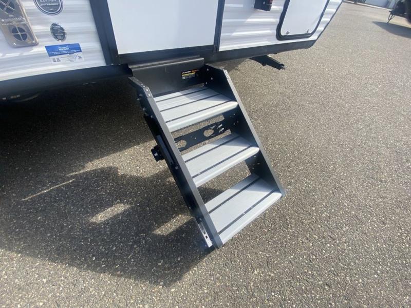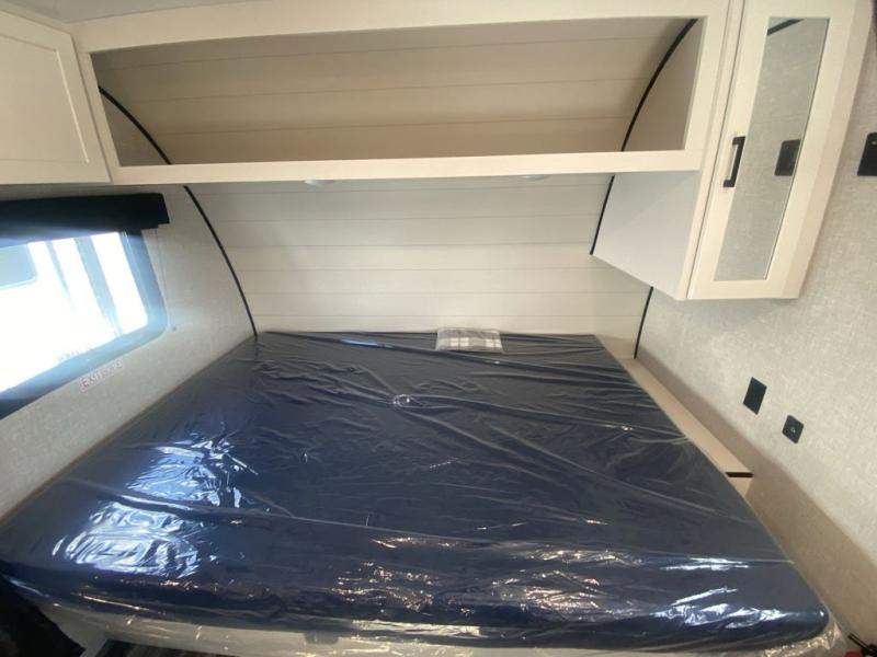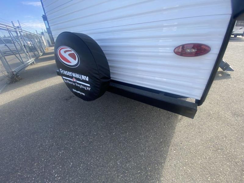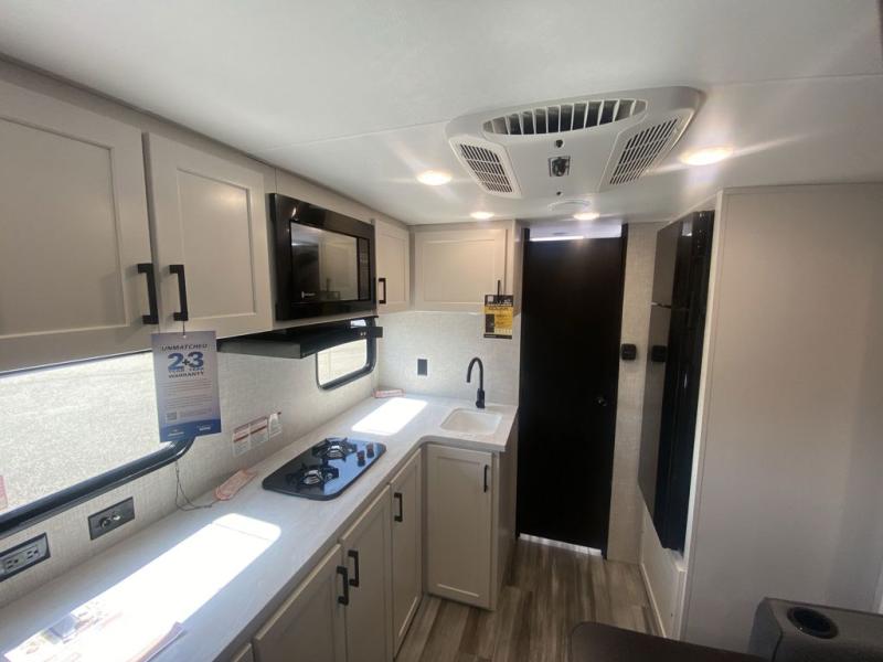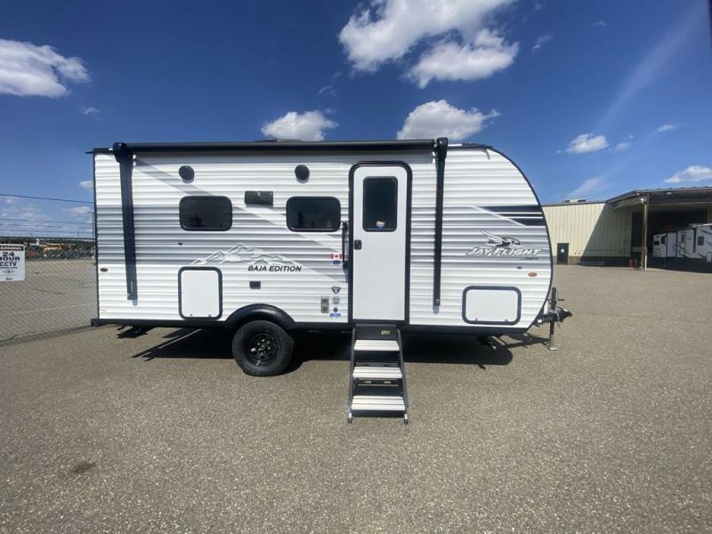 This single-axle couple's travel trailer is sure to bring you happiness at the campground. There is a front queen bed with a privacy curtain if you have a guest staying over on the jack-knife sofa, and the movable table in front of the sofa will provide more floor space when needed. A cooktop and microwave oven will let you make meals each day, and an 8 cu. ft. 12V refrigerator will be perfect for perishables. This model also includes a full rear bath with a tub/shower, a toilet, plus a sink and a linen closet for clean towels. The optional Baja Package can be added on this model which includes 16 in. off-road tires, a deluxe graphics package, triple entry steps, and more!