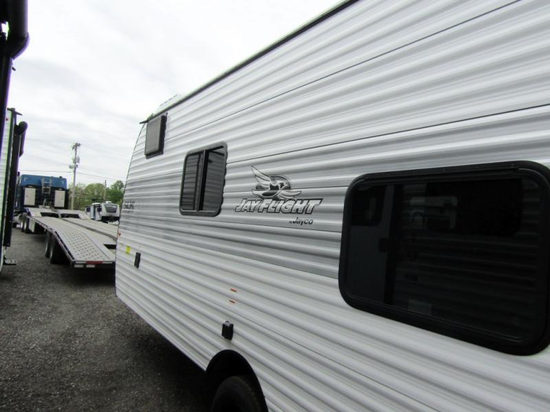 The Jayco Jay Flight SLX travel trailer is quite easy to own because it is lightweight for an easier towing experience. Built on a fully integrated A-frame with galvanized-steel, impact-resistant wheel wells, the Jay Flight SLX has quality at its very foundation. That quality continues on to the electric self-adjusting brakes, easy-lube hubs, Magnum Truss roof system, and LP quick connect. Some of what the mandatory Customer Value Package includes is backup camera prep, Keyed-Alike entry and baggage doors, marine grade exterior speakers, and an on-demand tankless water heater.