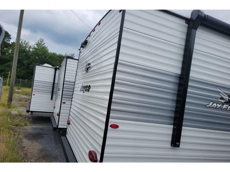 The Jayco Jay Flight SLX travel trailer is quite easy to own because it is lightweight for an easier towing experience. Built on a fully integrated A-frame with galvanized-steel, impact-resistant wheel wells, the Jay Flight SLX has quality at its very foundation. That quality continues on to the electric self-adjusting brakes, easy-lube hubs, Magnum Truss roof system, and LP quick connect. Some of what the mandatory Customer Value Package includes is backup camera prep, Keyed-Alike entry and baggage doors, marine grade exterior speakers, and an on-demand tankless water heater.