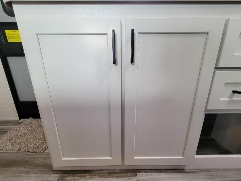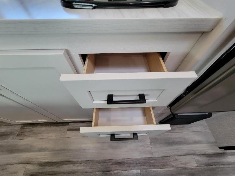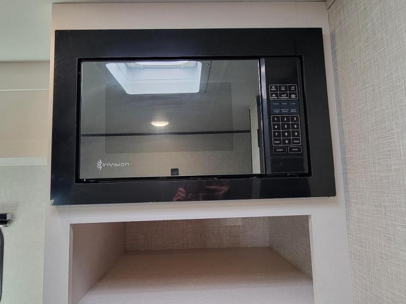 - Kitchen Amenities: Includes a microwave oven, a 3.3 cu. ft. 12V refrigerator, and adequate counter space for meal prep.