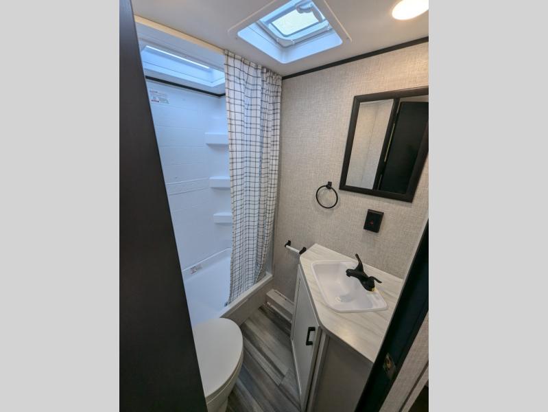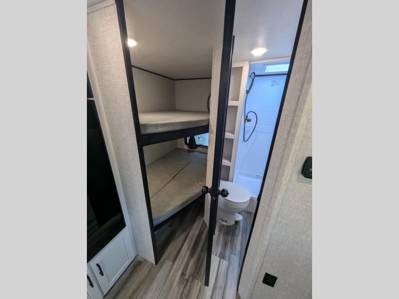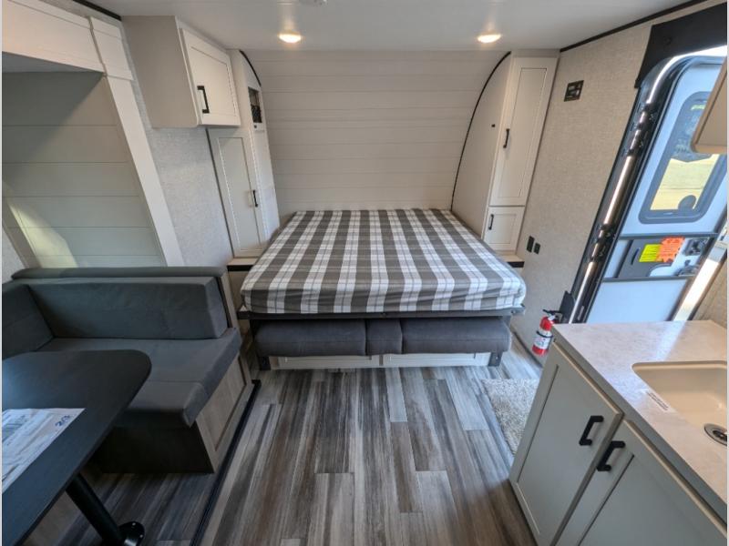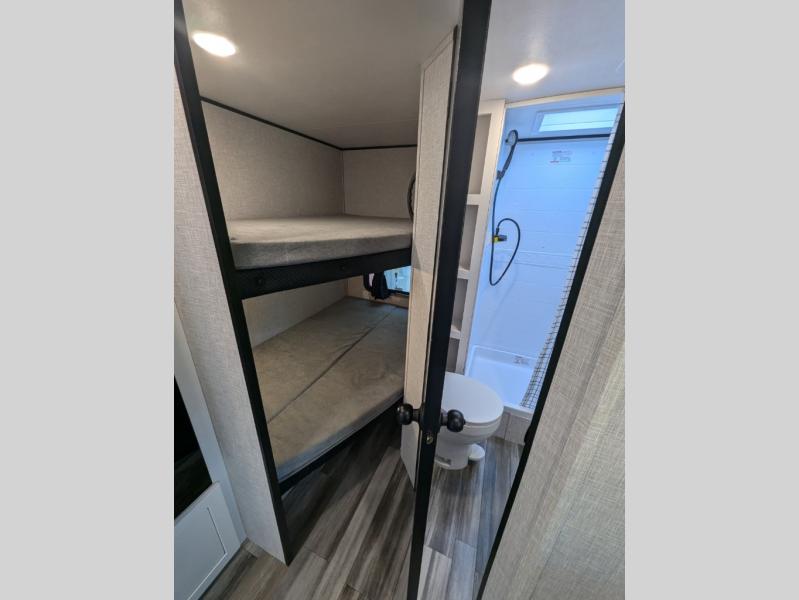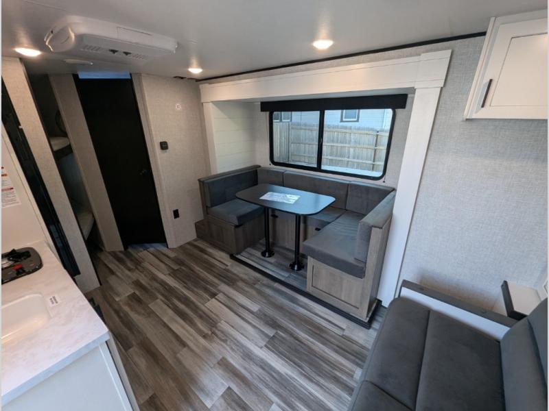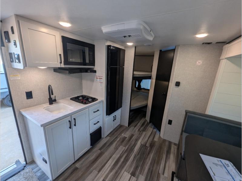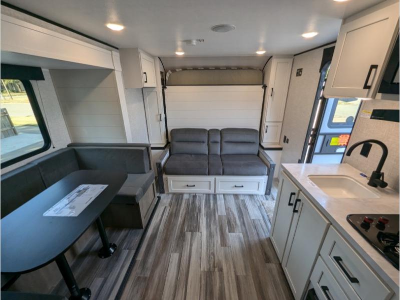 Any time spent in this travel trailer will be time well spent! You can easily sleep eight people each night thanks to the double-size bunks, front Murphy bed, and U-shaped dinette within the slide out. There is a full bath next to the bunks for easy nighttime use, and the linen closet will be perfect for clean towels. A cooktop, microwave oven, and 8 cu. ft. 12V refrigerator will let you cook and store food, and there is an overhead cabinet for spices or snacks!