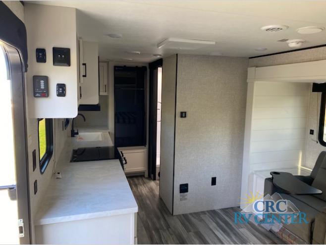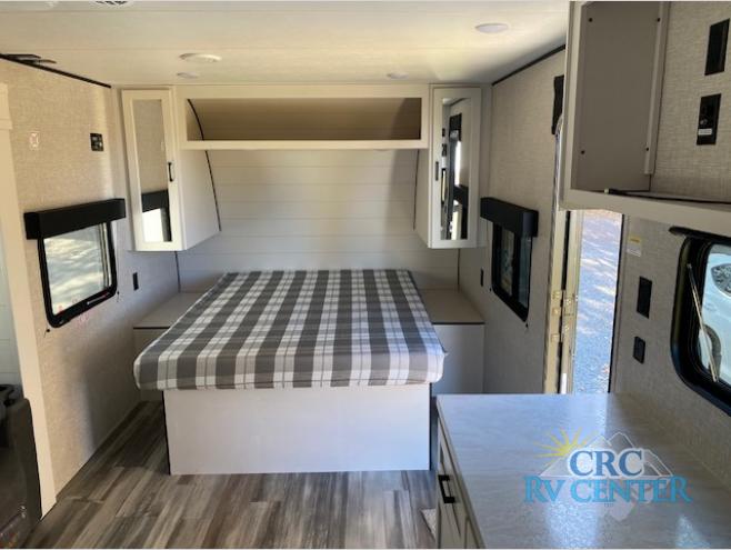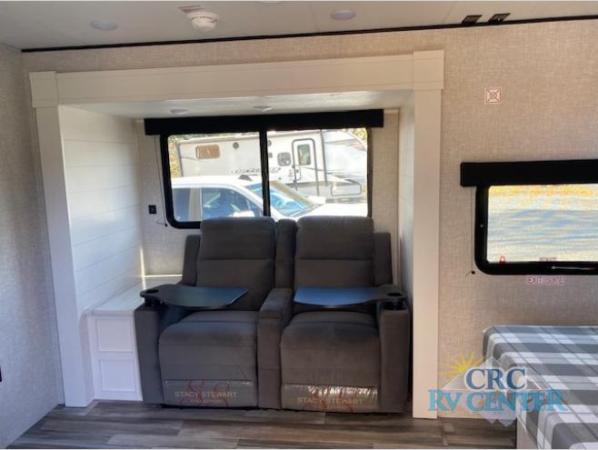 This couple's trailer will be perfect for weekend trips to the lake or extended stays at the campground. You can sleep on the front queen bed each night instead of on an air mattress, and the dual bedroom wardrobes will help keep your space organized. The theater seat with tables is within a slide for more floor space, and the fully-equipped kitchen will allow you to make meals each day. You'll also appreciate the rear corner full bath to stay clean throughout each trip!