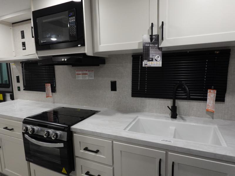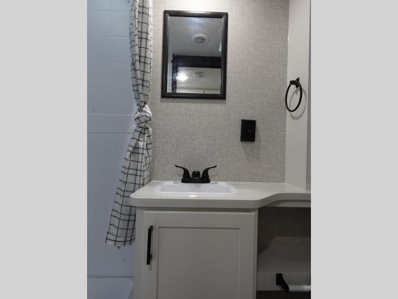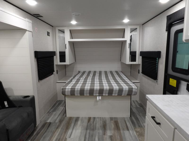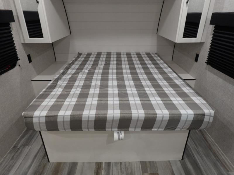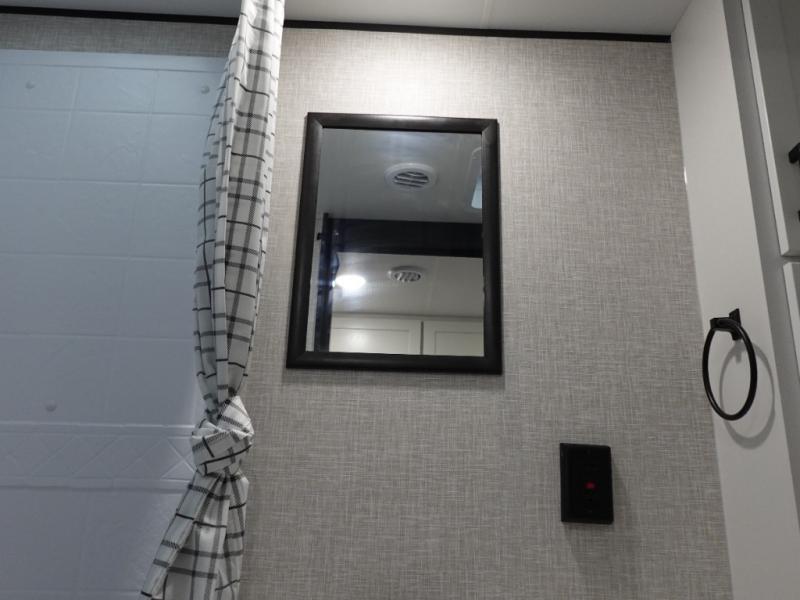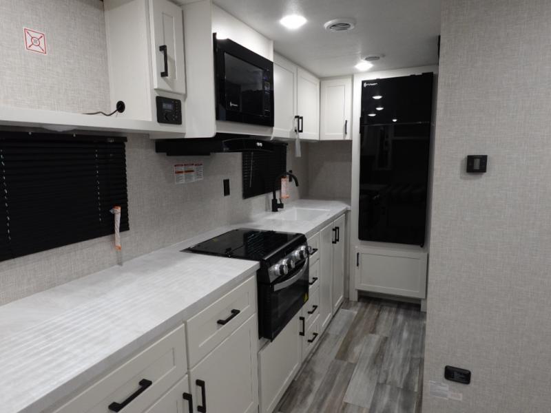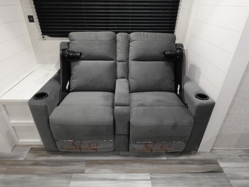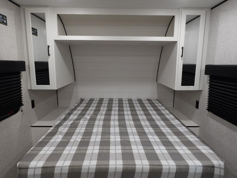This couple's trailer will be perfect for weekend trips to the lake or extended stays at the campground. You can sleep on the front queen bed each night instead of on an air mattress, and the dual bedroom wardrobes will help keep your space organized. The theater seat with tables is within a slide for more floor space, and the fully-equipped kitchen will allow you to make meals each day. You'll also appreciate the rear corner full bath to stay clean throughout each trip!