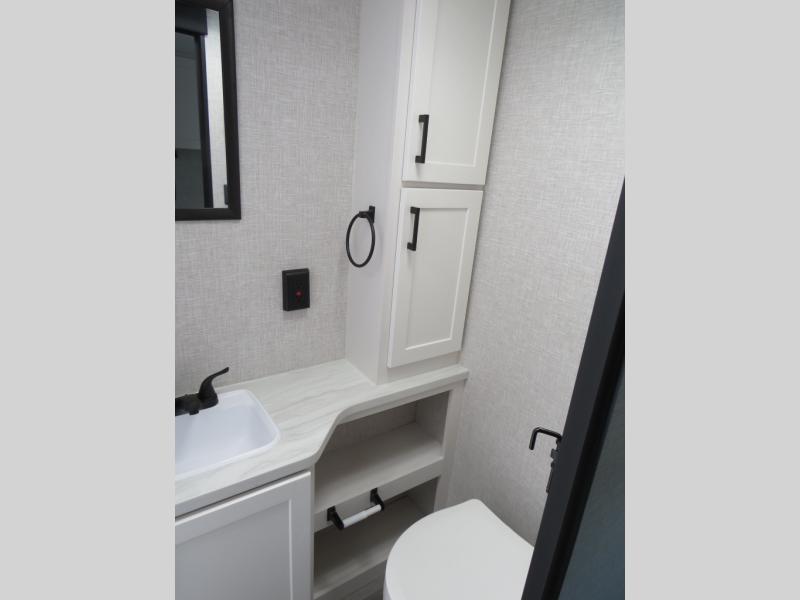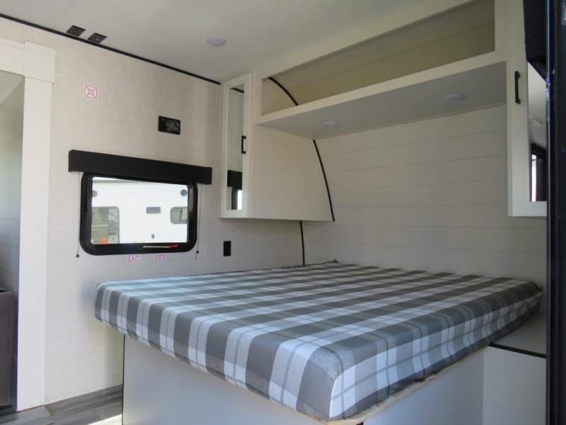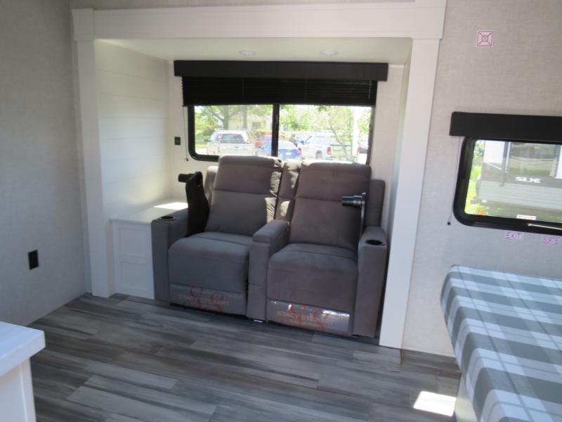 This couple's trailer will be perfect for weekend trips to the lake or extended stays at the campground. You can sleep on the front queen bed each night instead of on an air mattress, and the dual bedroom wardrobes will help keep your space organized. The theater seat with tables is within a slide for more floor space, and the fully-equipped kitchen will allow you to make meals each day. You'll also appreciate the rear corner full bath to stay clean throughout each trip!