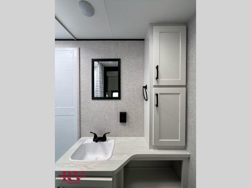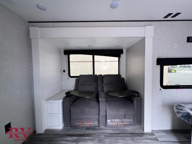 This couple's trailer will be perfect for weekend trips to the lake or extended stays at the campground. You can sleep on the front queen bed each night instead of on an air mattress, and the dual bedroom wardrobes will help keep your space organized. The theater seat with tables is within a slide for more floor space, and the fully-equipped kitchen will allow you to make meals each day. You'll also appreciate the rear corner full bath to stay clean throughout each trip!