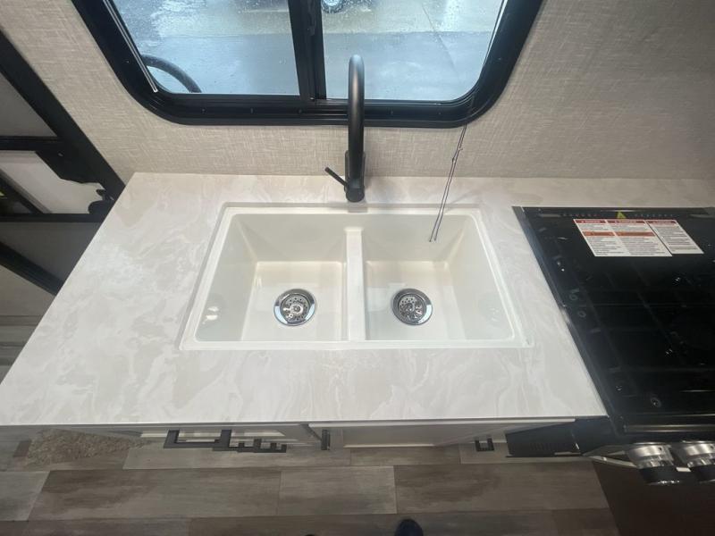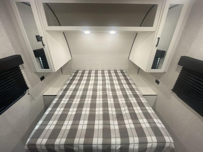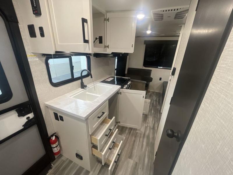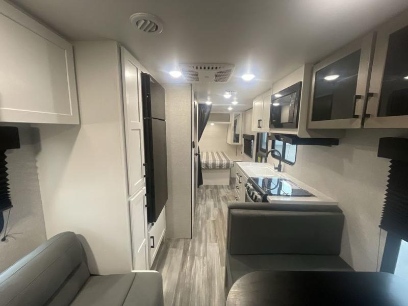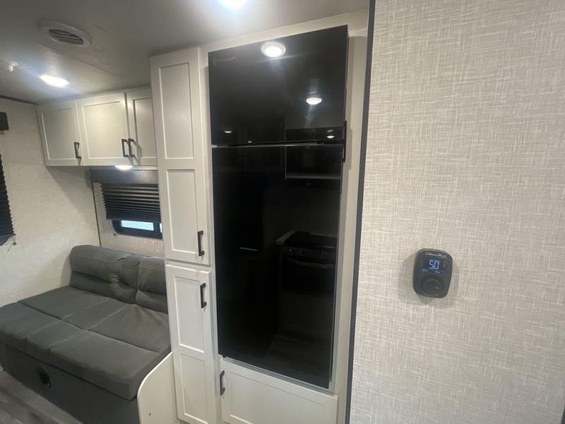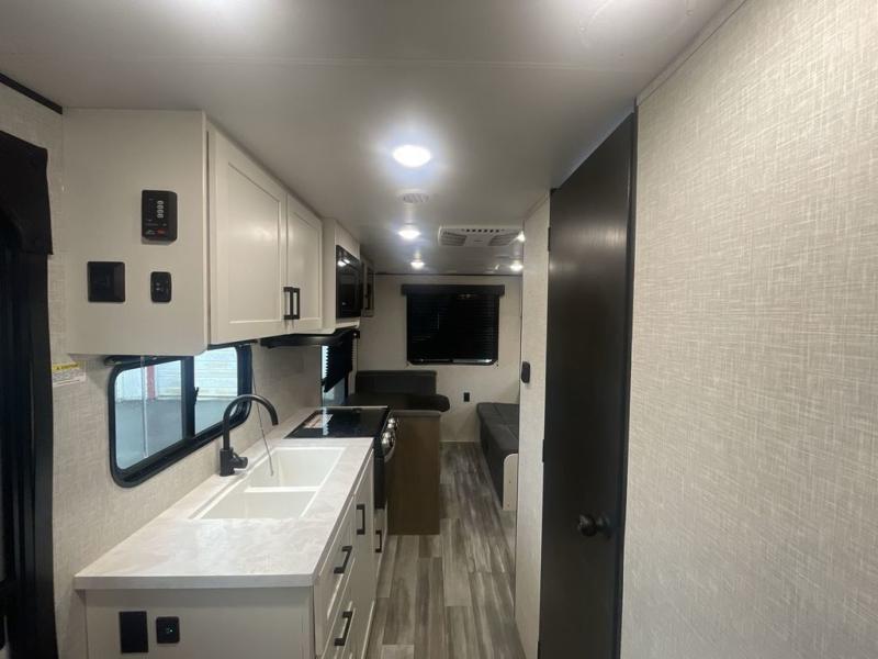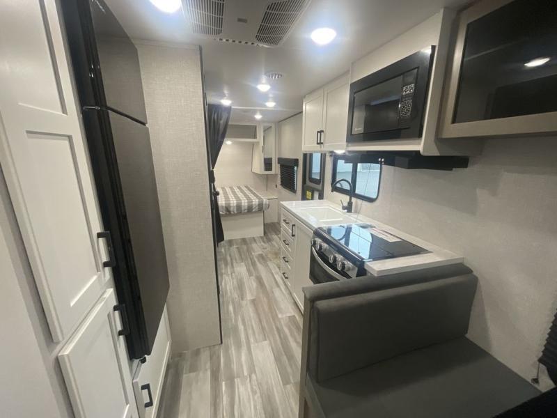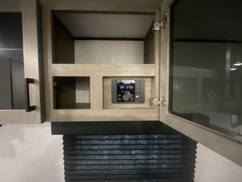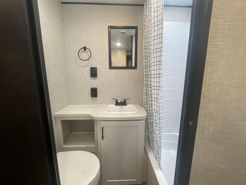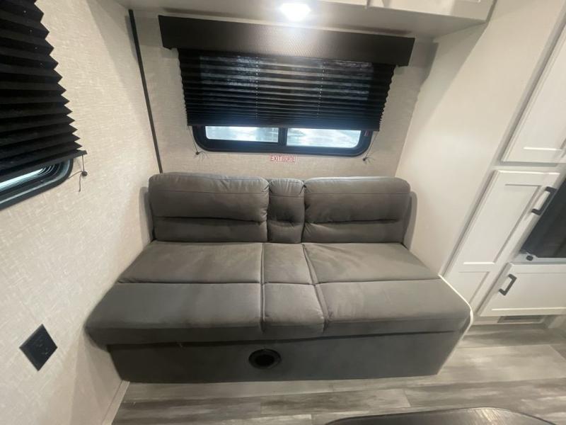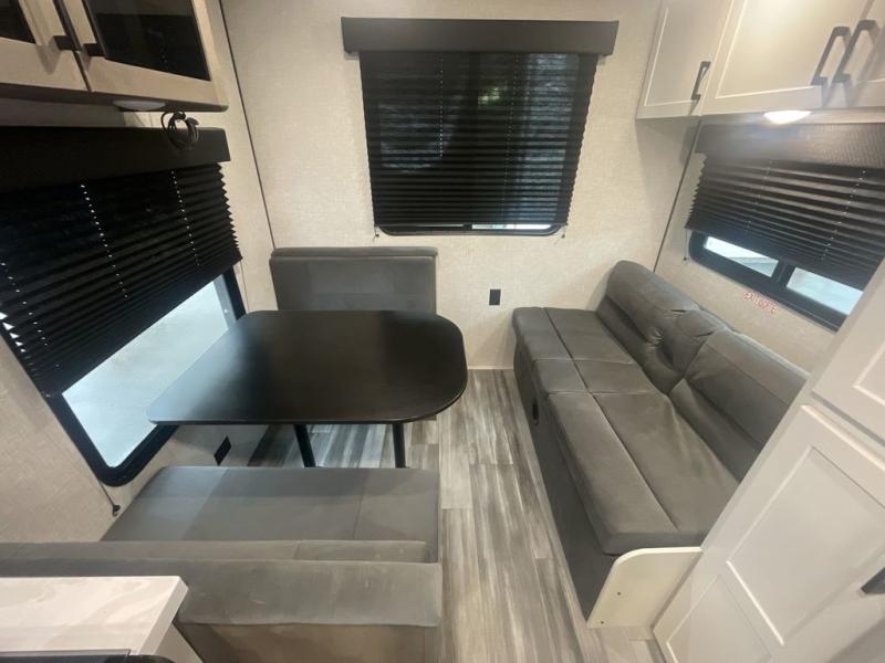 Camping in the woods is just what the doctor ordered and this trailer will provide all the interior comforts you need! There is a three burner cooktop and a microwave oven to prepare meals each day, plus an 8 cu. ft. 12V refrigerator for cold items. After your meal is made, you can dine at the booth dinette or relax on the jack-knife sofa, and these areas can become sleeping space for two to three guests at night. The full bath with a tub/shower means you won't have to use the camp's facilities and the 16' power awning will provide protection from the sun as you visit with other campers!