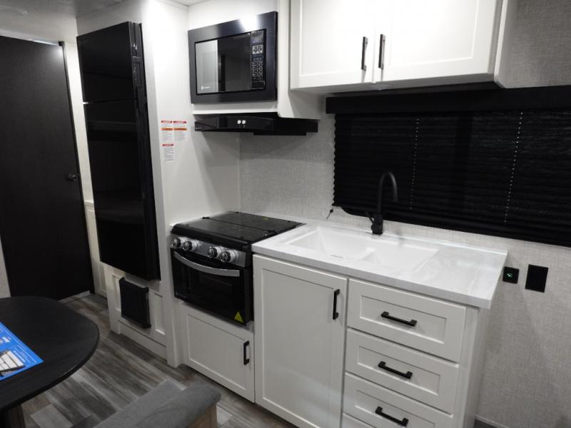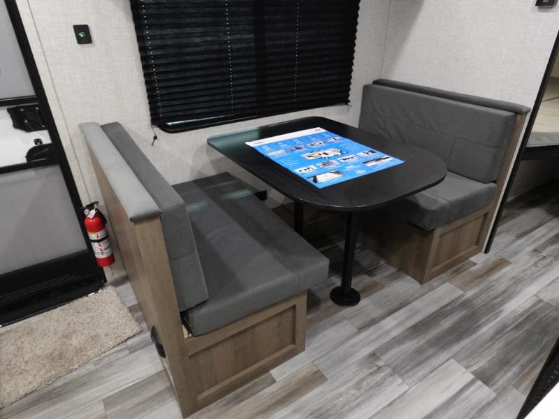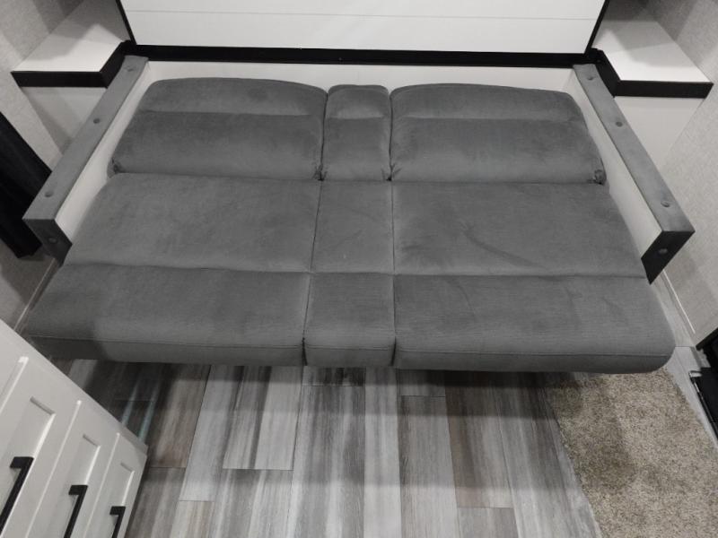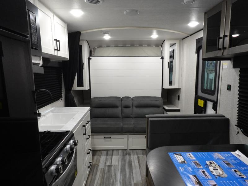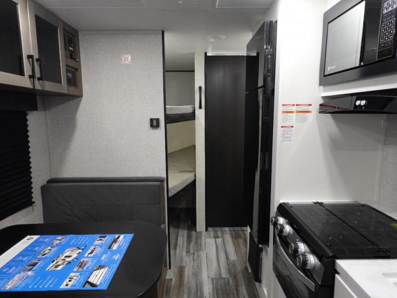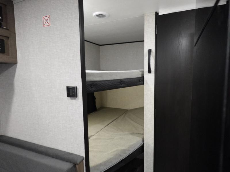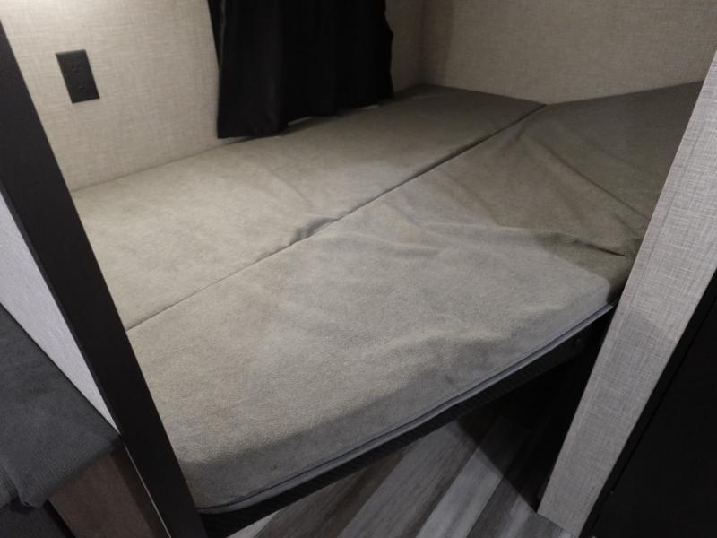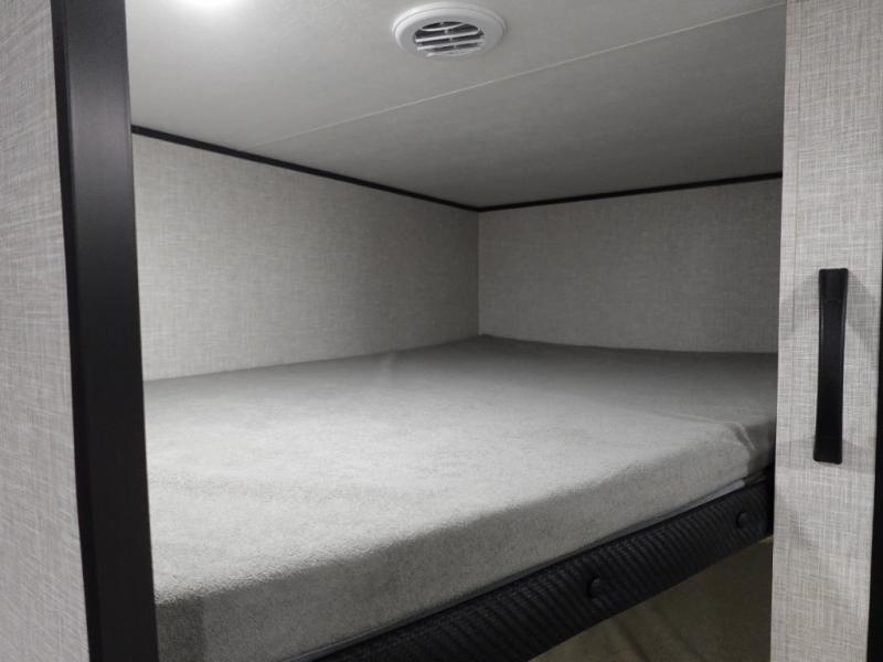 You'll love camping at the lake in this versatile travel trailer. Since there is a Murphy bed up front, you can fold it away in the morning to enjoy the Jack-knife sofa, plus there is a booth dinette for even more seating space. The microwave oven and cooktop in the kitchen allow you to make meals each day, and the 8 cu. ft. 12V refrigerator will keep perishables fresh. Your guests or the little ones are sure to love the double-size bunks, and the rear corner bath is right next to the bunks for easy nighttime use!