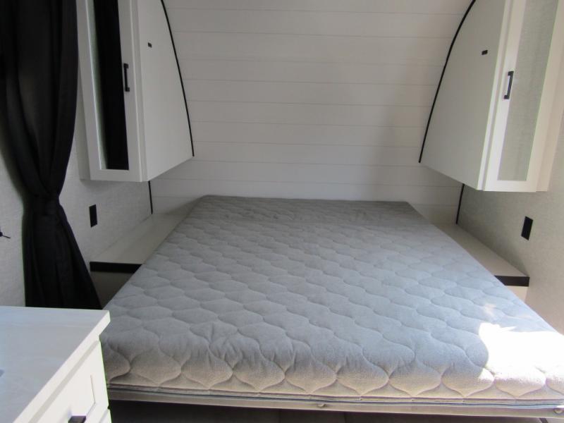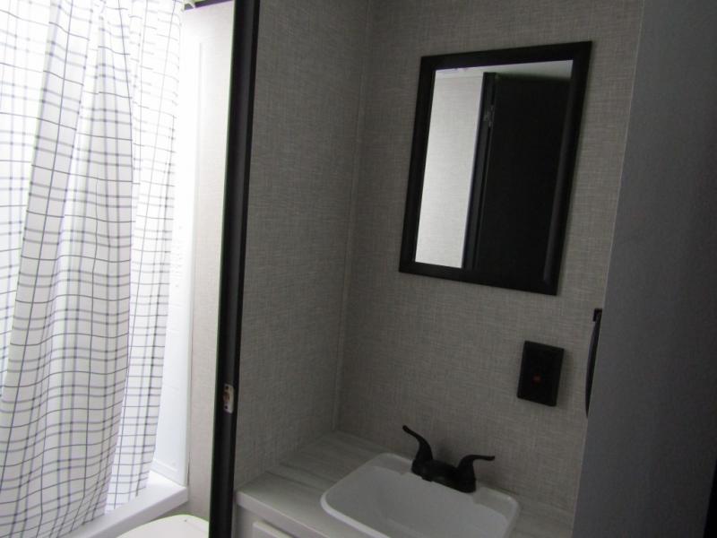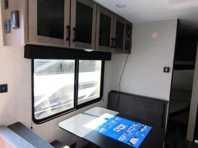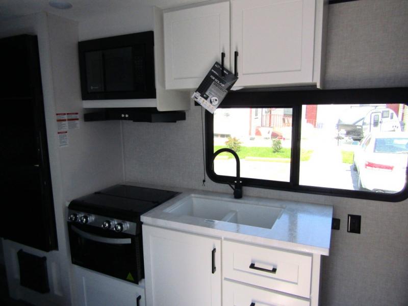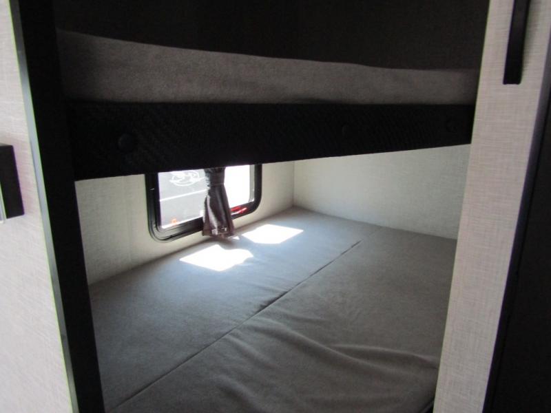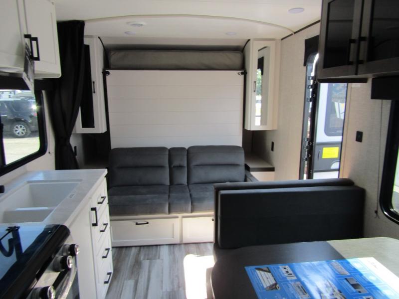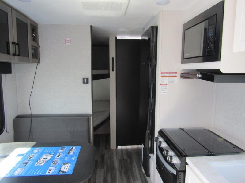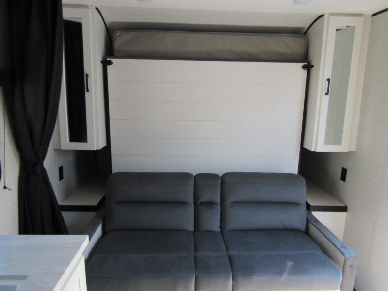 You'll love camping at the lake in this versatile travel trailer. Since there is a Murphy bed up front, you can fold it away in the morning to enjoy the Jack-knife sofa, plus there is a booth dinette for even more seating space. The microwave oven and cooktop in the kitchen allow you to make meals each day, and the 8 cu. ft. 12V refrigerator will keep perishables fresh. Your guests or the little ones are sure to love the double-size bunks, and the rear corner bath is right next to the bunks for easy nighttime use!