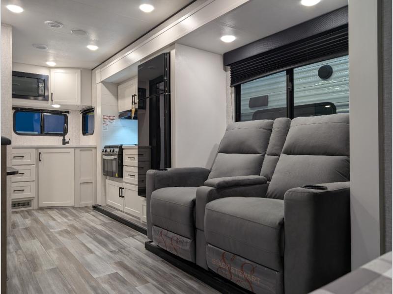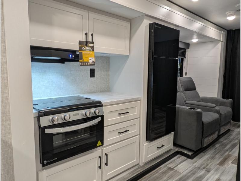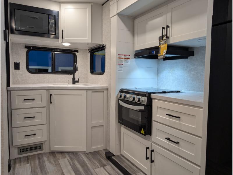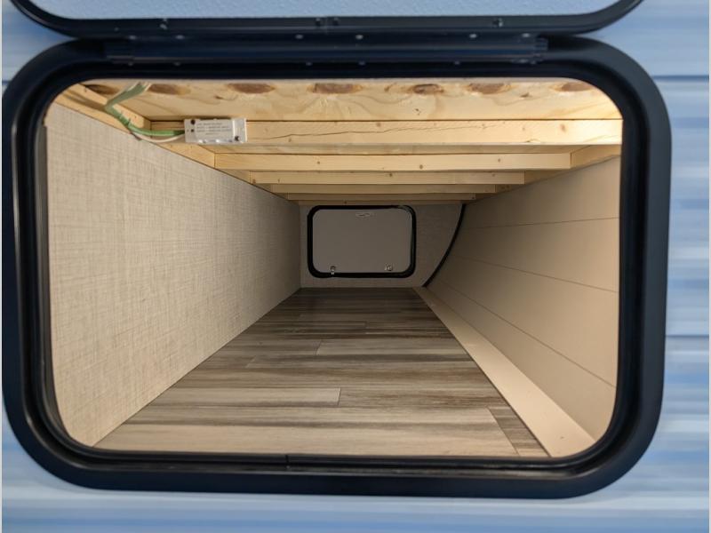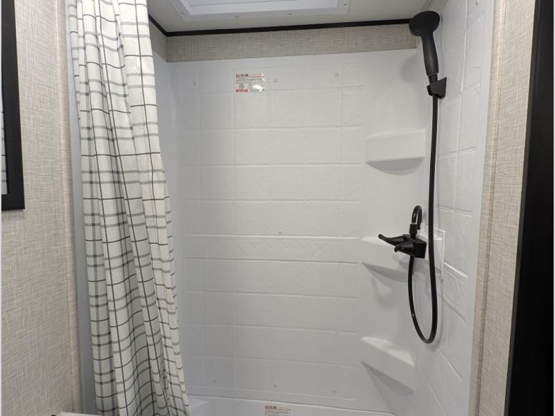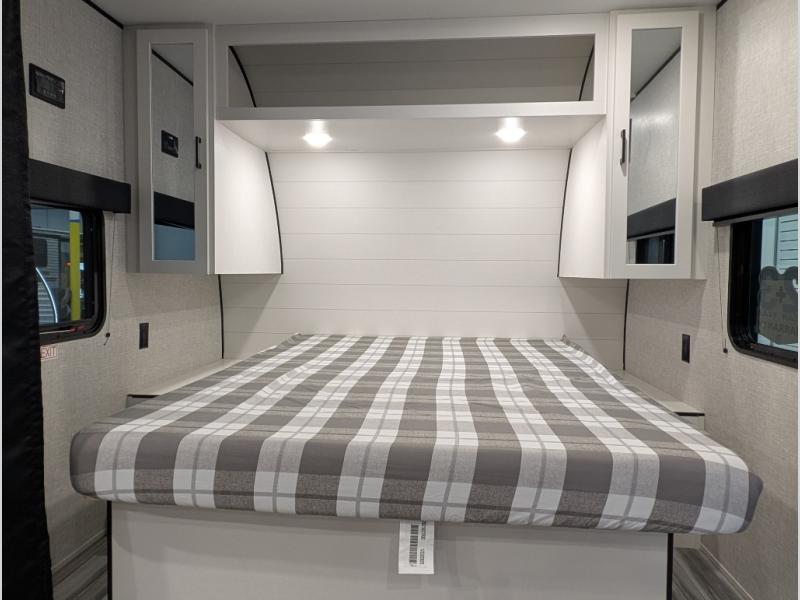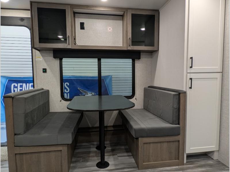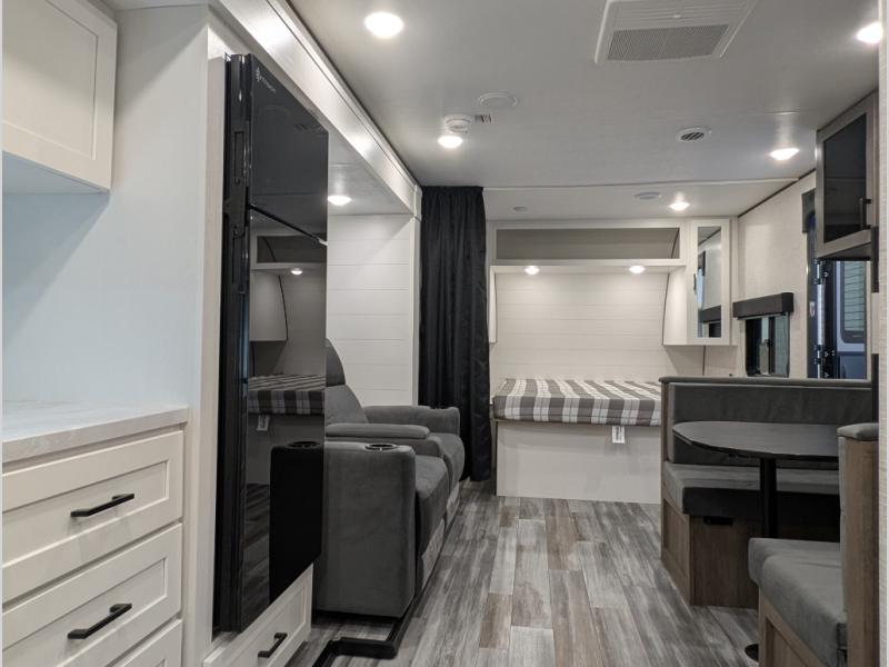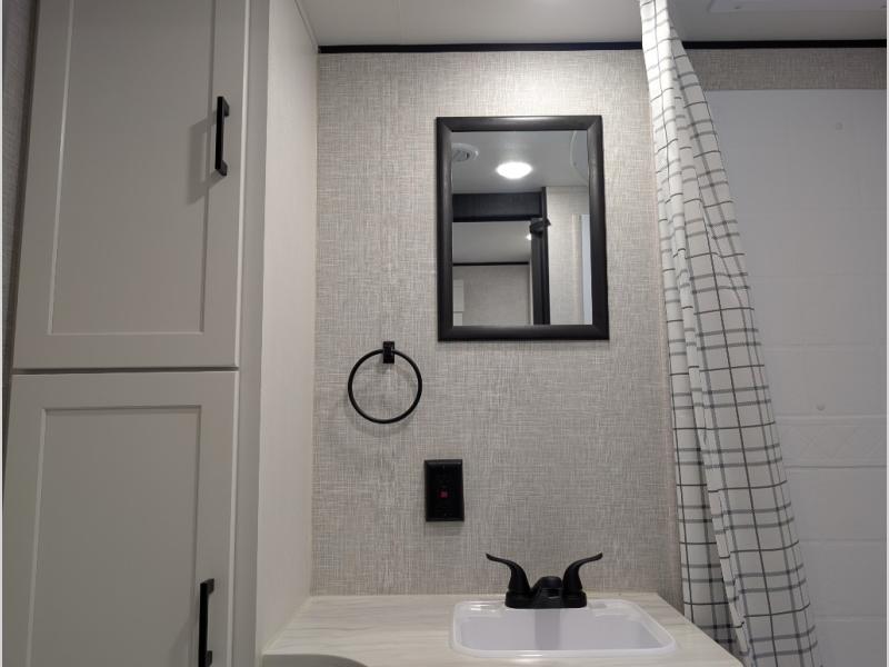 You will have a comfortable camping trip in this travel trailer! It offers full kitchen amenities including a pantry for snacks and such, plus a full rear corner bathroom for privacy and includes a shower. When you need a break, the semi-private bedroom up front offers a queen bed, dual wardrobes and a curtain to close, and the booth dinette can transform into a sleeping space as well. There is a 18' power awning with LED lights for you to enjoy this outdoor space into the night, plus exterior storage for your outdoor games and gear.