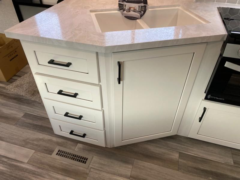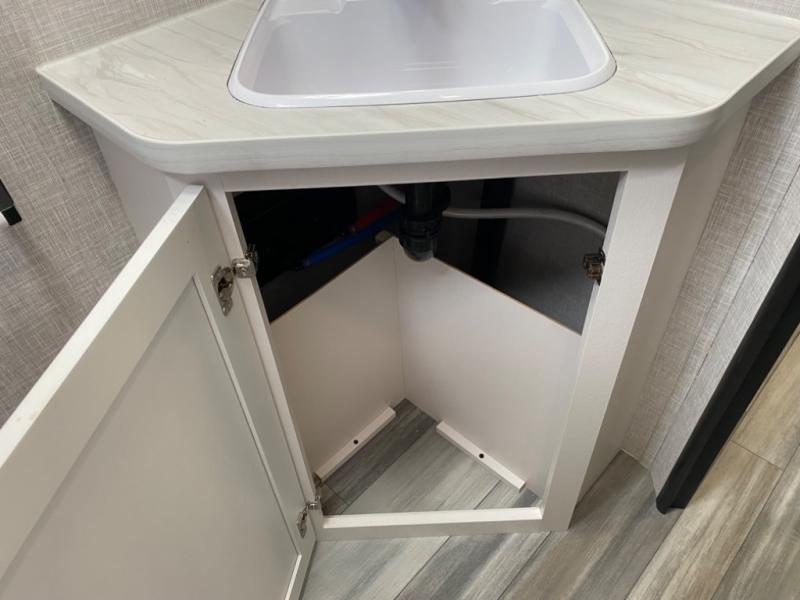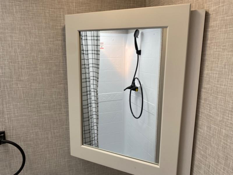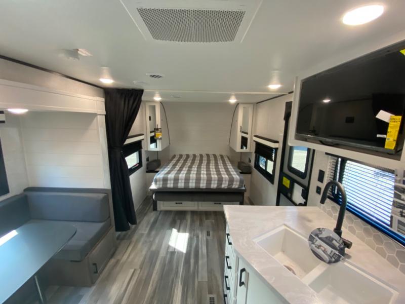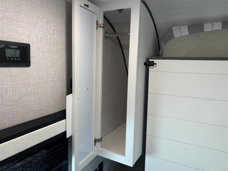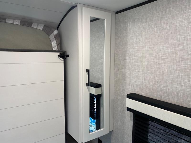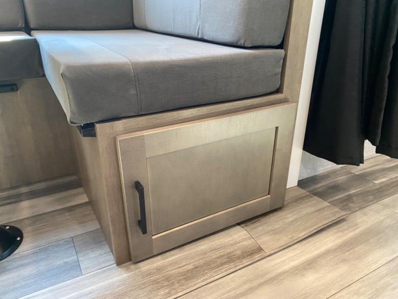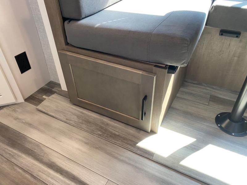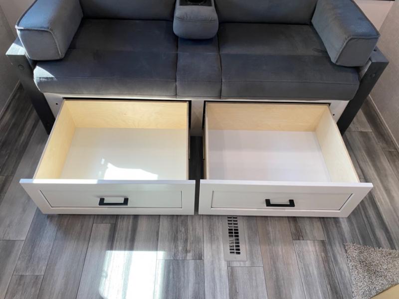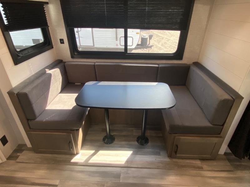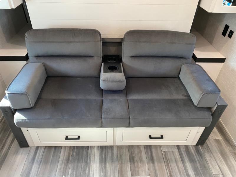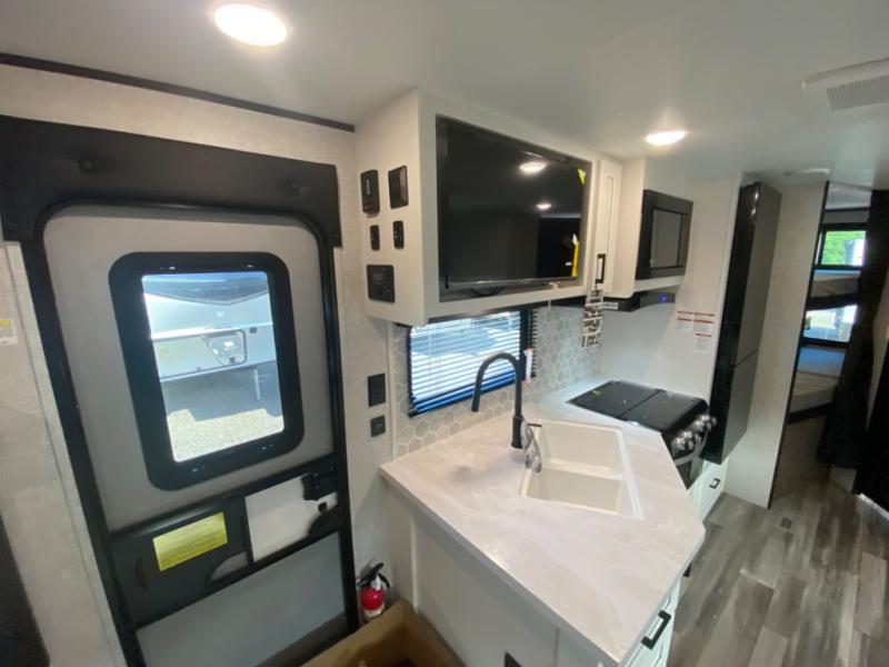 Inside, you’ll find a thoughtfully designed floorplan with sleeping space for up to eight. The private front Murphy bed cleverly folds away to reveal a cozy sofa during the day, maximizing your living space. Double-over-double rear bunks are perfect for kids or guests, and the full bathroom allows everyone to freshen up after a day outdoors. The kitchen features a large refrigerator, three-burner range, microwave, and plenty of storage, making meal prep simple. A booth dinette provides a comfortable place to dine, play games, or relax, while large windows let in plenty of natural light.