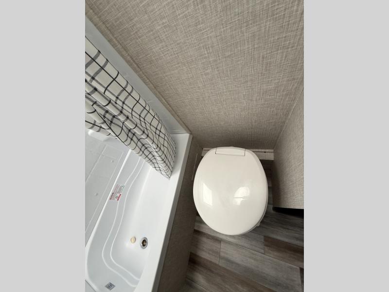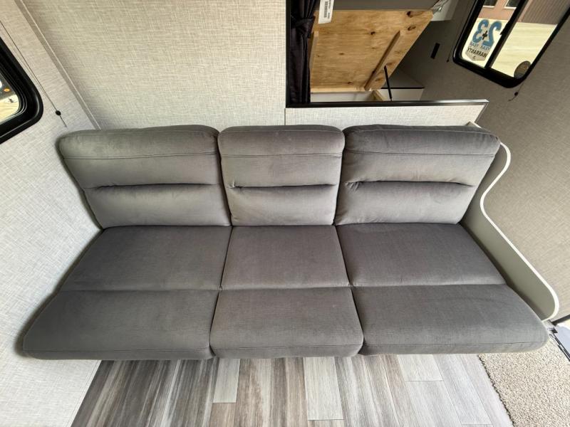 You can comfortably sleep eight to ten people in this trailer thanks to the double-size bunks, the RV queen bed in the front bedroom, plus the booth dinette and jack-knife sofa in the main living area! The chef of your crew will have a three burner cooktop and microwave oven to prepare meals, and everyone can store their favorite drinks in the 8 cu. ft. 12V refrigerator. The bathroom includes a tub/shower and a toilet, with the sink just outside of this room so others can brush their teeth if one is taking a shower before bed. The outside storage will let you bring along fishing poles and the 16' power awning with LED lights will create a nice place to gather in the evenings!