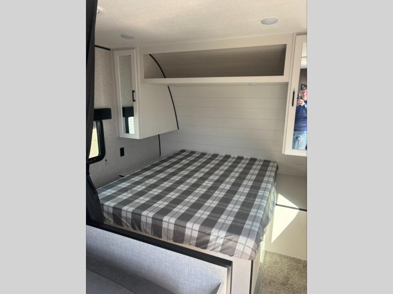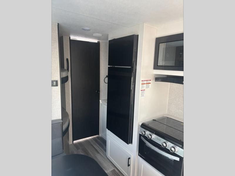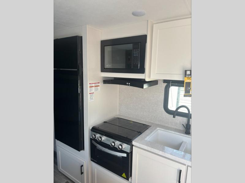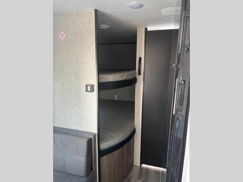 You can comfortably sleep eight to ten people in this trailer thanks to the double-size bunks, the RV queen bed in the front bedroom, plus the booth dinette and jack-knife sofa in the main living area! The chef of your crew will have a three burner cooktop and microwave oven to prepare meals, and everyone can store their favorite drinks in the 8 cu. ft. 12V refrigerator. The bathroom includes a tub/shower and a toilet, with the sink just outside of this room so others can brush their teeth if one is taking a shower before bed. The outside storage will let you bring along fishing poles and the 16' power awning with LED lights will create a nice place to gather in the evenings!