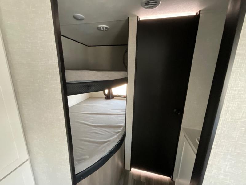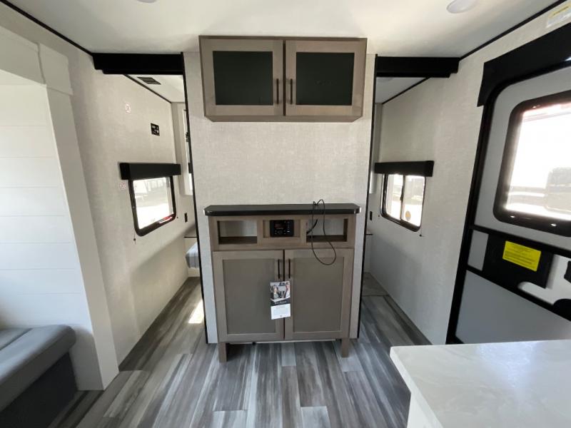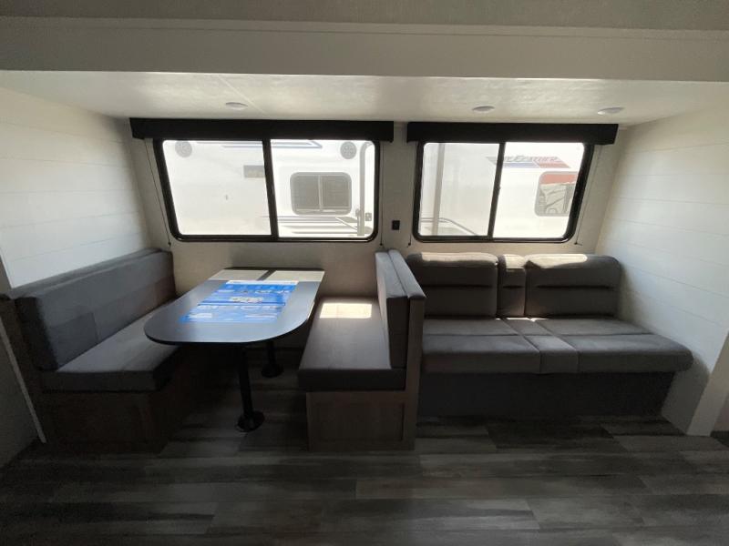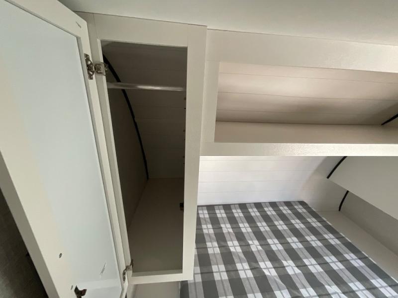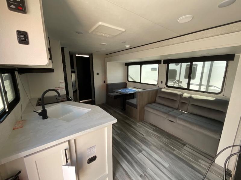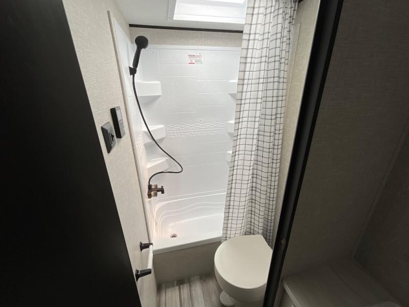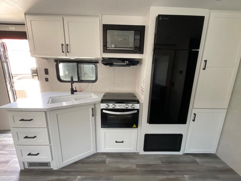 You can comfortably sleep up to ten people in this trailer thanks to the double-size bunks in back, the RV queen bed in the front bedroom, plus the booth dinette and jack-knife sofa in the main living area! The chef of your crew will have a three burner cooktop and microwave oven to prepare meals, and everyone can store their favorite drinks in the 8 cu. ft. 12V refrigerator inside, or in the outdoor refrigerator for convenience. The rear corner bathroom includes a tub/shower and a toilet, with the sink just outside of this room so others can brush their teeth if one is taking a shower before bed. The outside storage is accessible on both sides of the unit and will easily allow you bring along camp chairs, yard games and more. A 16' powered awning with LED lights will create a nice place to gather in the evenings with family and friends!