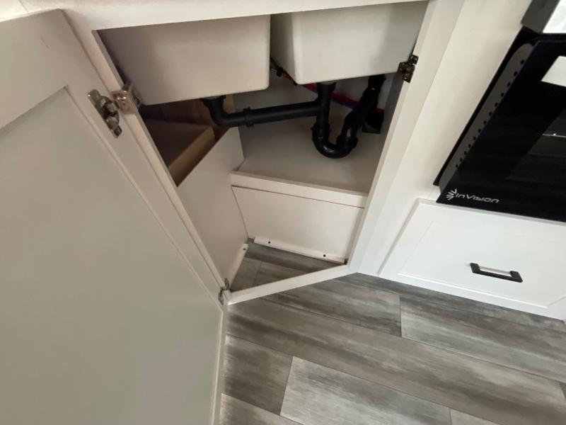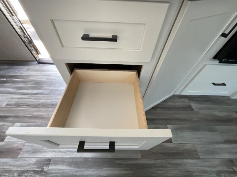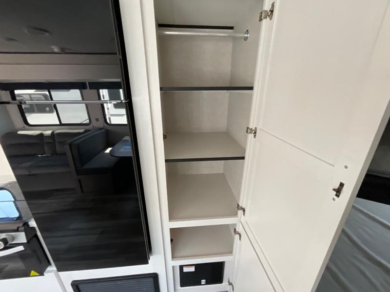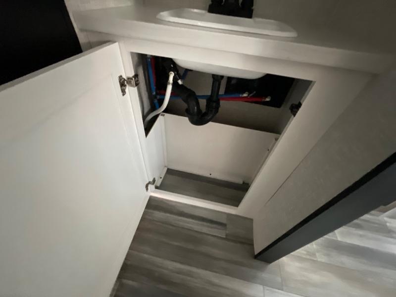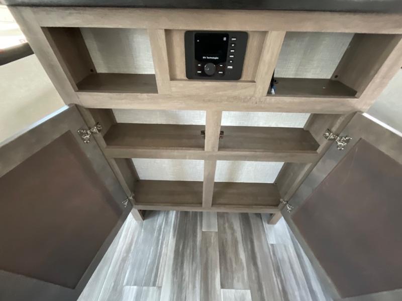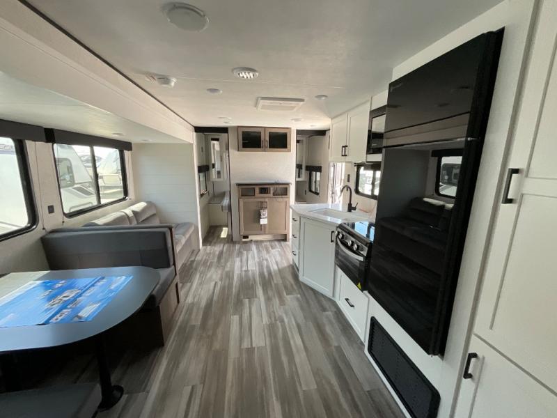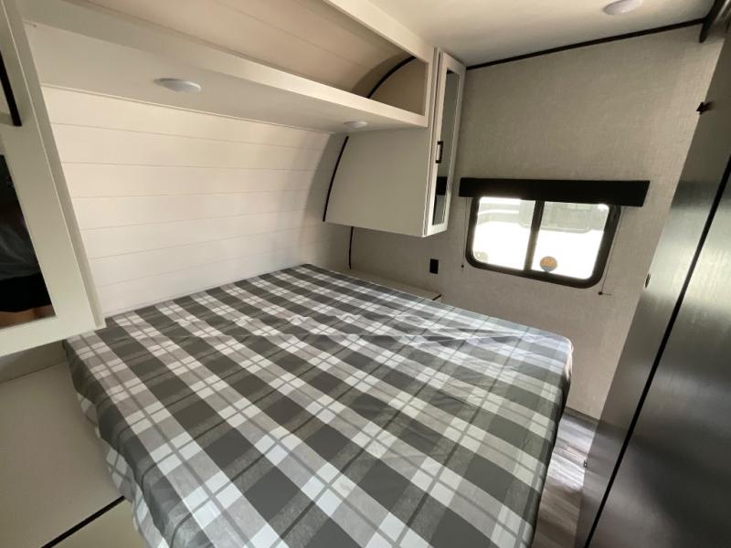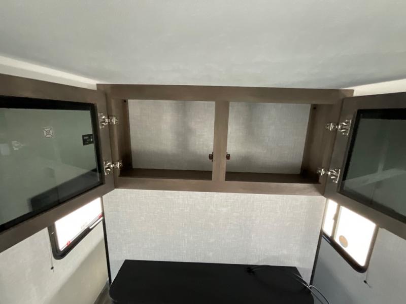 You can comfortably sleep up to ten people in this trailer thanks to the double-size bunks in back, the RV queen bed in the front bedroom, plus the booth dinette and jack-knife sofa in the main living area! The chef of your crew will have a three burner cooktop and microwave oven to prepare meals, and everyone can store their favorite drinks in the 8 cu. ft. 12V refrigerator inside, or in the outdoor refrigerator for convenience. The rear corner bathroom includes a tub/shower and a toilet, with the sink just outside of this room so others can brush their teeth if one is taking a shower before bed. The outside storage is accessible on both sides of the unit and will easily allow you bring along camp chairs, yard games and more. A 16' powered awning with LED lights will create a nice place to gather in the evenings with family and friends!