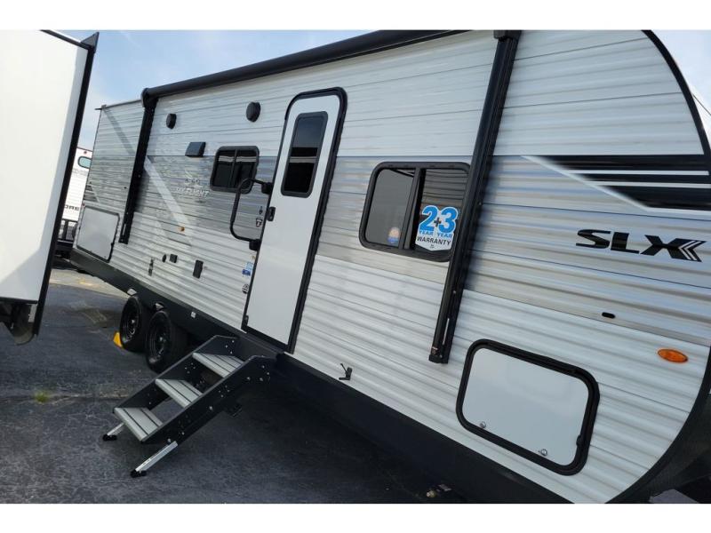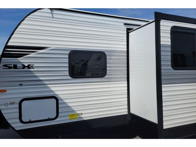 The Jayco Jay Flight SLX travel trailer is quite easy to own because it is lightweight for an easier towing experience. Built on a fully integrated A-frame with galvanized-steel, impact-resistant wheel wells, the Jay Flight SLX has quality at its very foundation. That quality continues on to the electric self-adjusting brakes, easy-lube hubs, Magnum Truss roof system, and LP quick connect. Some of what the mandatory Customer Value Package includes is backup camera prep, Keyed-Alike entry and baggage doors, marine grade exterior speakers, and an on-demand tankless water heater.