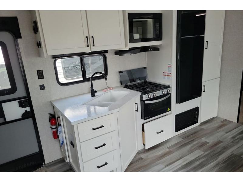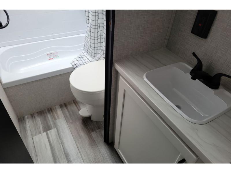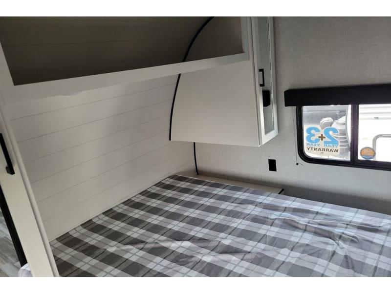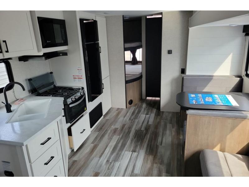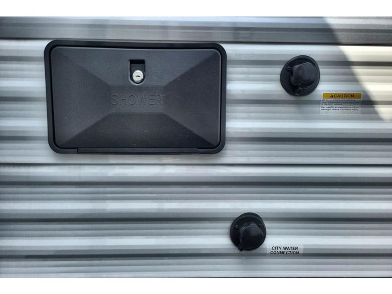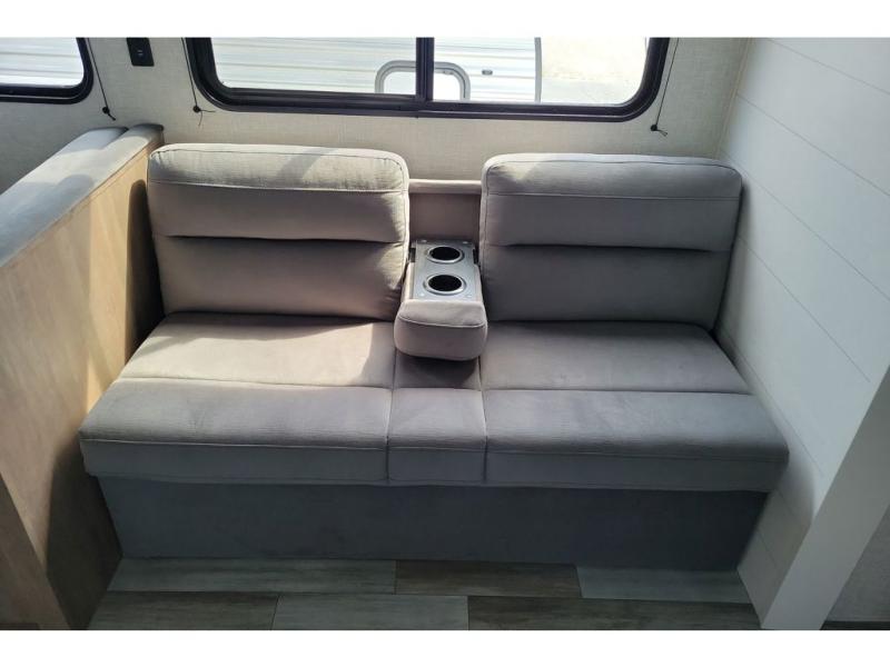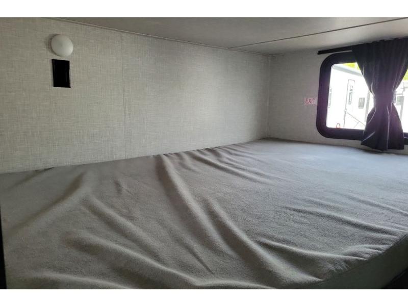 You can comfortably sleep up to ten people in this trailer thanks to the double-size bunks in back, the RV queen bed in the front bedroom, plus the booth dinette and jack-knife sofa in the main living area! The chef of your crew will have a three burner cooktop and microwave oven to prepare meals, and everyone can store their favorite drinks in the 8 cu. ft. 12V refrigerator inside, or in the outdoor refrigerator for convenience. The rear corner bathroom includes a tub/shower and a toilet, with the sink just outside of this room so others can brush their teeth if one is taking a shower before bed. The outside storage is accessible on both sides of the unit and will easily allow you bring along camp chairs, yard games and more. A 16' powered awning with LED lights will create a nice place to gather in the evenings with family and friends!