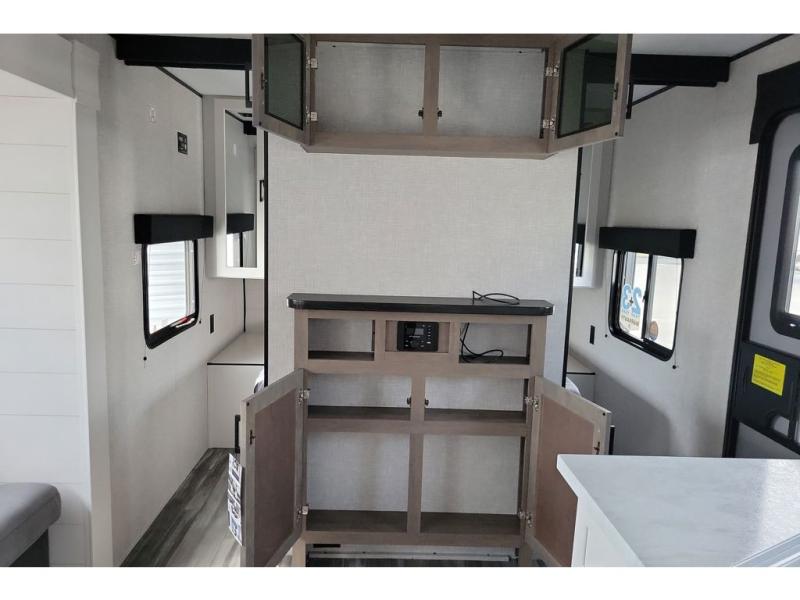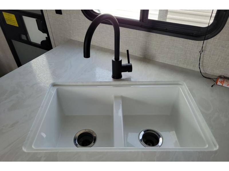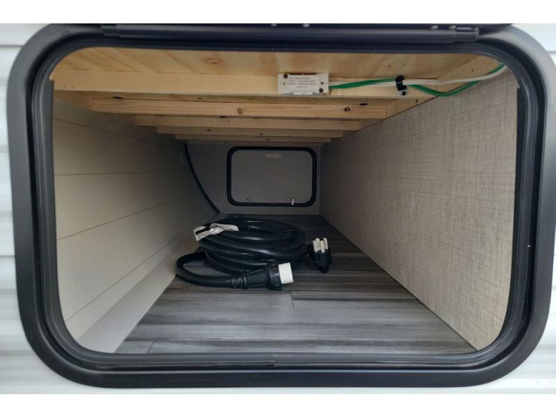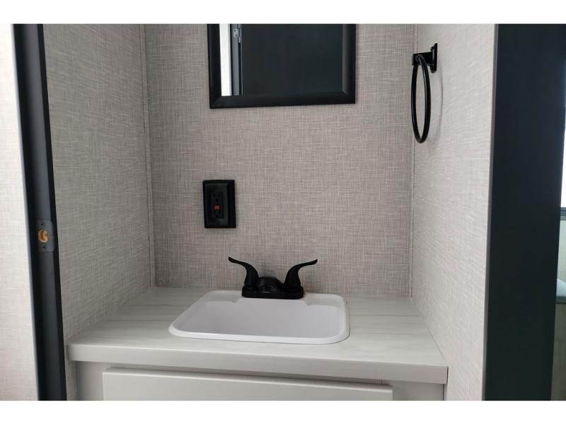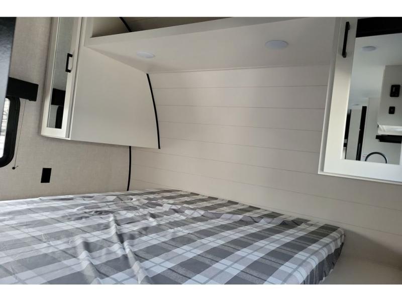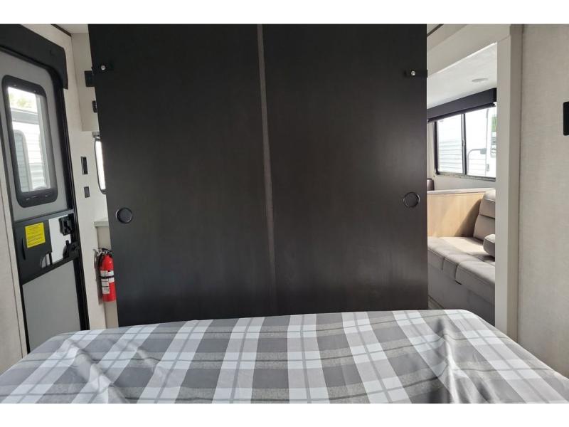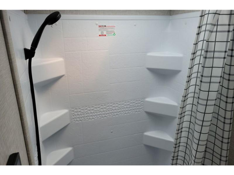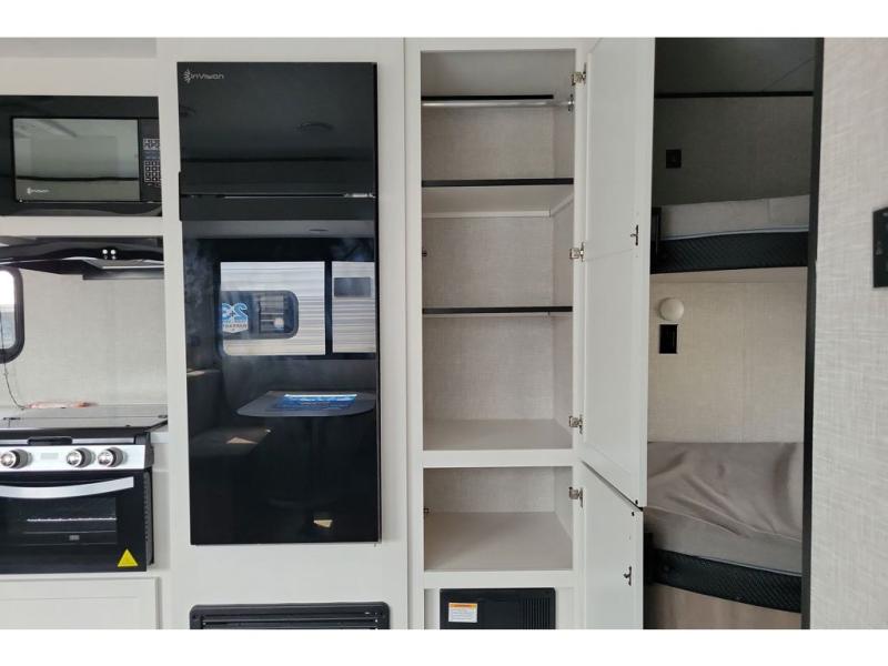 You can comfortably sleep up to ten people in this trailer thanks to the double-size bunks in back, the RV queen bed in the front bedroom, plus the booth dinette and jack-knife sofa in the main living area! The chef of your crew will have a three burner cooktop and microwave oven to prepare meals, and everyone can store their favorite drinks in the 8 cu. ft. 12V refrigerator inside, or in the outdoor refrigerator for convenience. The rear corner bathroom includes a tub/shower and a toilet, with the sink just outside of this room so others can brush their teeth if one is taking a shower before bed. The outside storage is accessible on both sides of the unit and will easily allow you bring along camp chairs, yard games and more. A 16' powered awning with LED lights will create a nice place to gather in the evenings with family and friends!