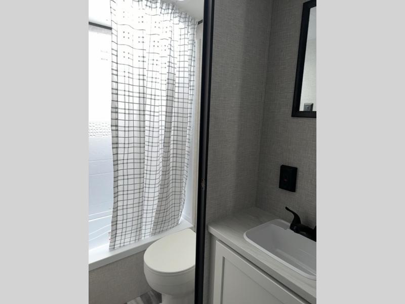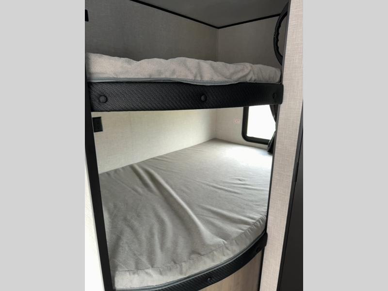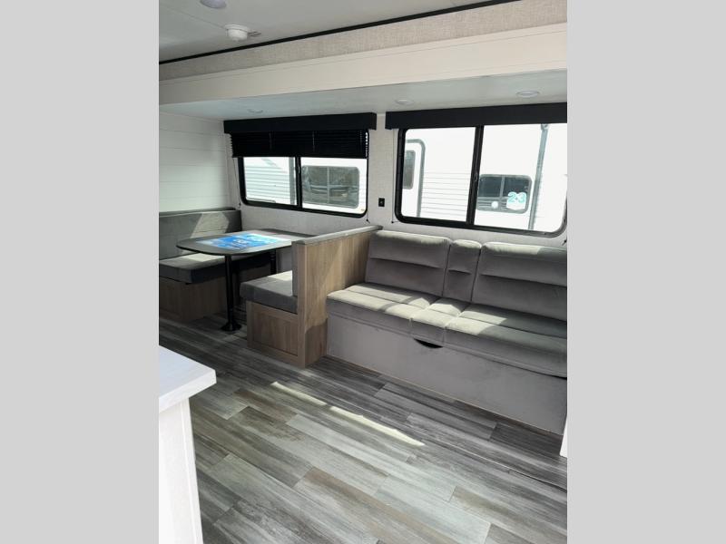 You can comfortably sleep up to ten people in this trailer thanks to the double-size bunks in back, the RV queen bed in the front bedroom, plus the booth dinette and jack-knife sofa in the main living area! The chef of your crew will have a three burner cooktop and microwave oven to prepare meals, and everyone can store their favorite drinks in the 8 cu. ft. 12V refrigerator inside, or in the outdoor refrigerator for convenience. The rear corner bathroom includes a tub/shower and a toilet, with the sink just outside of this room so others can brush their teeth if one is taking a shower before bed. The outside storage is accessible on both sides of the unit and will easily allow you bring along camp chairs, yard games and more. A 16' powered awning with LED lights will create a nice place to gather in the evenings with family and friends!