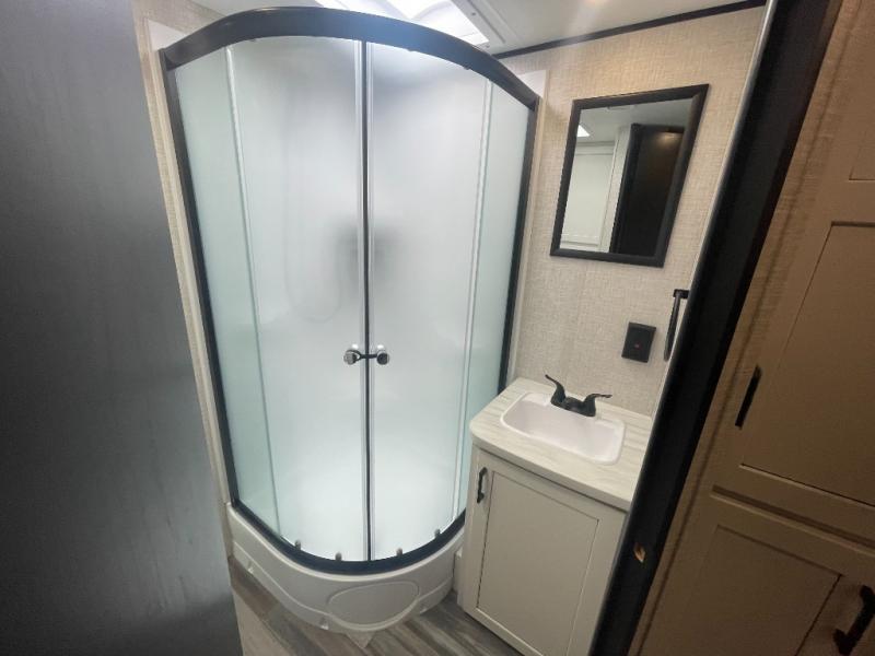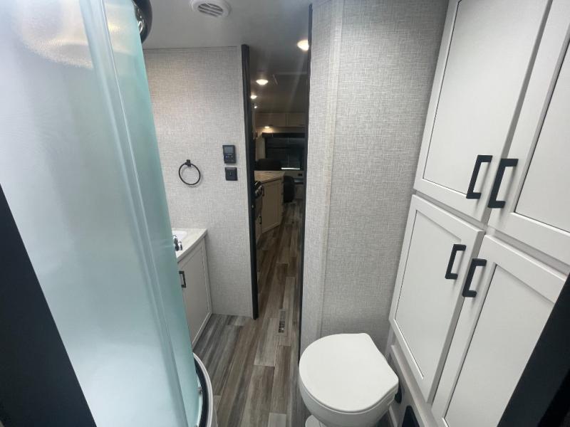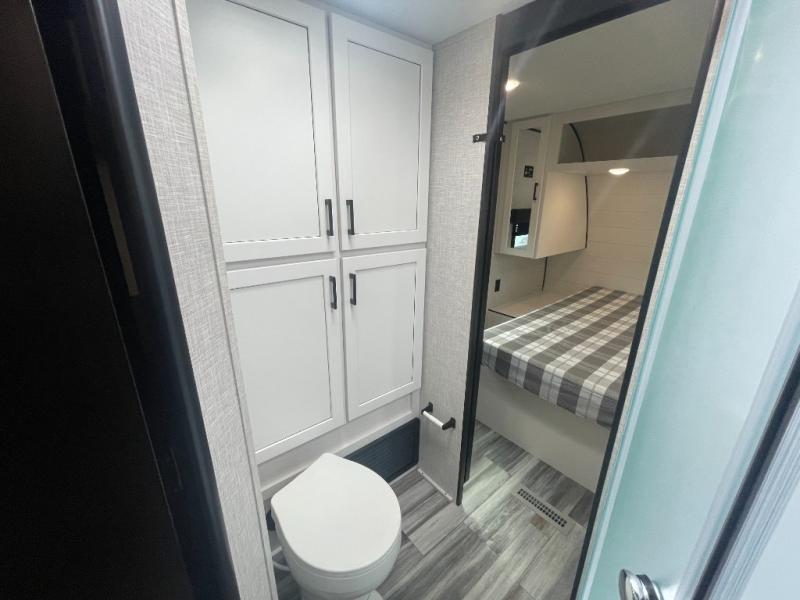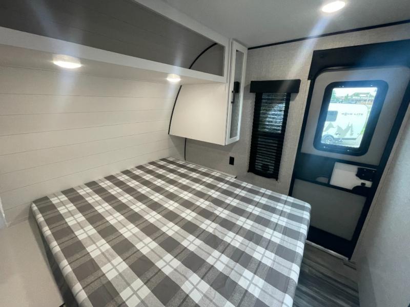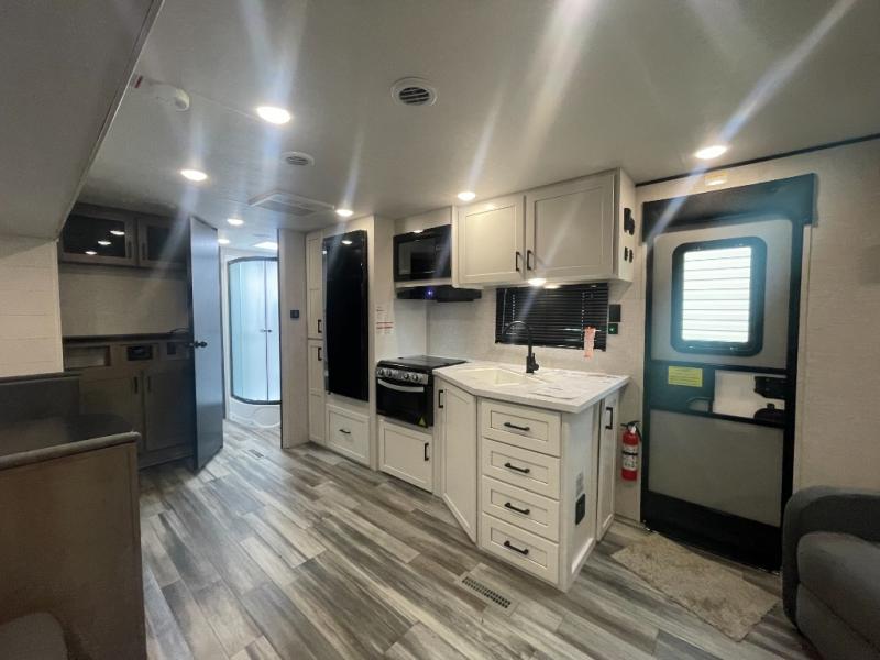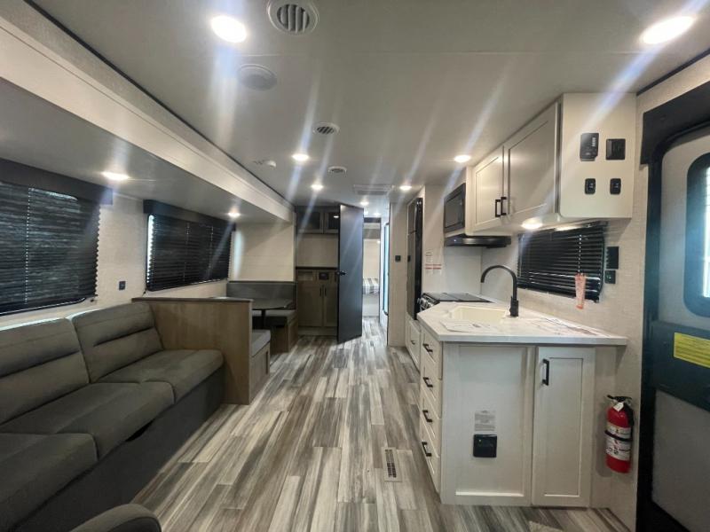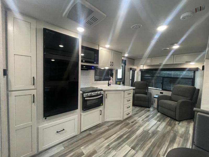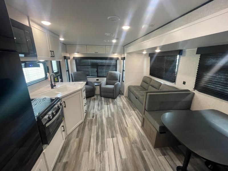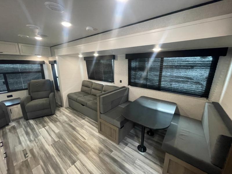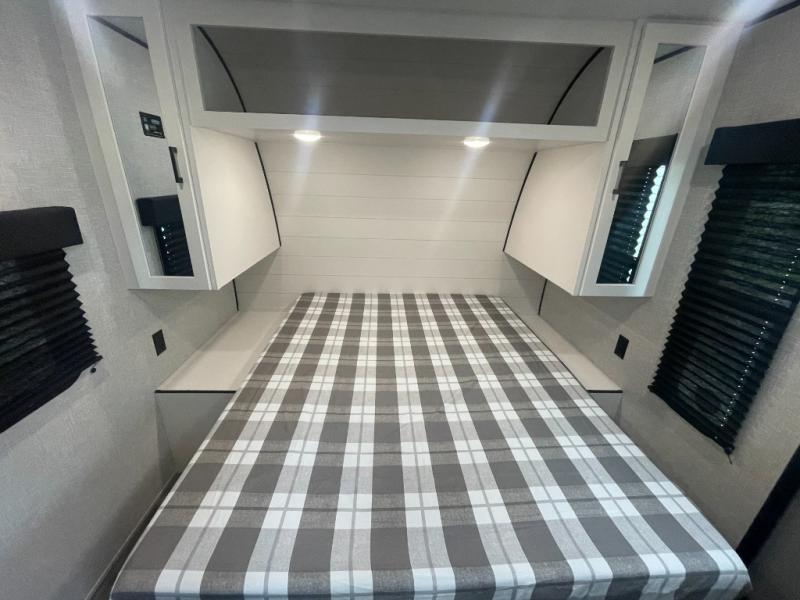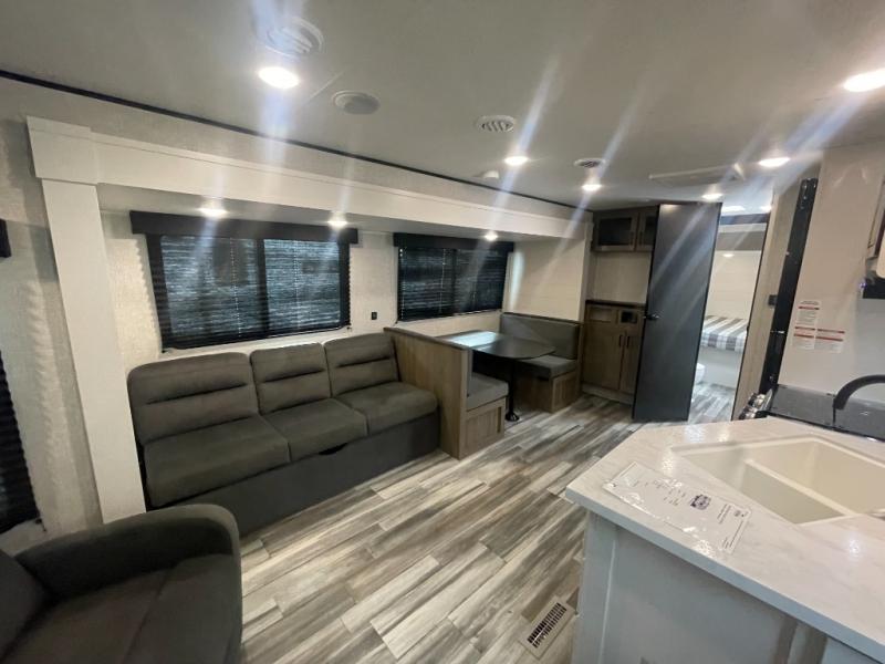 You can comfortably sleep up to six people in this trailer thanks to the RV queen bed in the front bedroom, plus the booth dinette and jack-knife sofa in the main living area! The chef of your crew will have a three burner cooktop and microwave oven to prepare meals, and everyone can store their favorite drinks in the 8 cu. ft. 12V refrigerator. The walk-through bath is spacious and includes a radius shower, toilet, a sink, and linen closet and is the full width of the unit. The outside storage will let you bring along camp chairs and games, fishing poles and more, plus the 18' 3" power awning with LED lights will create a nice place to gather in the evenings!