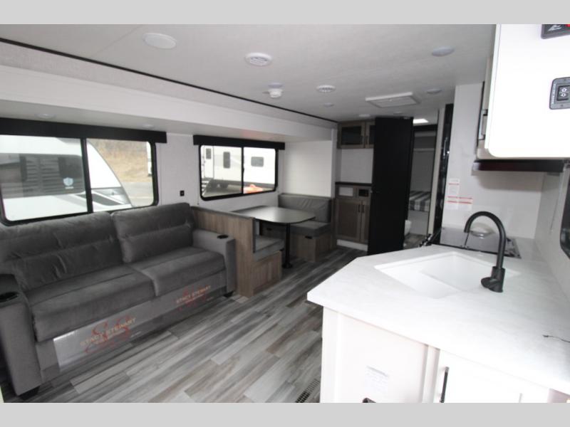You can comfortably sleep up to six people in this trailer thanks to the RV queen bed in the front bedroom, plus the booth dinette and jack-knife sofa in the main living area! The chef of your crew will have a three burner cooktop and microwave oven to prepare meals, and everyone can store their favorite drinks in the 8 cu. ft. 12V refrigerator. The walk-through bath is spacious and includes a radius shower, toilet, a sink, and linen closet and is the full width of the unit. The outside storage will let you bring along camp chairs and games, fishing poles and more, plus the 18' 3" power awning with LED lights will create a nice place to gather in the evenings!