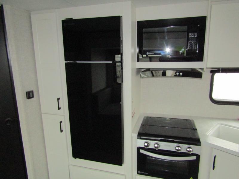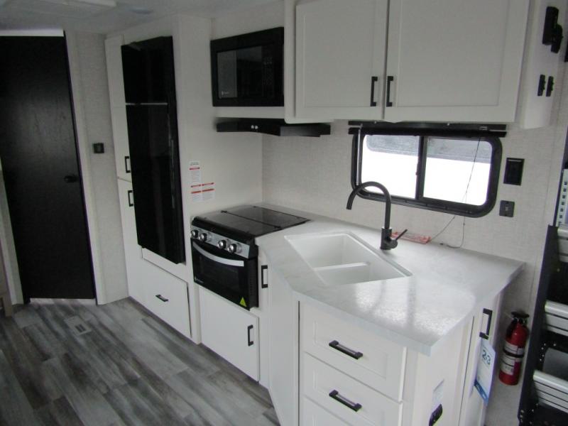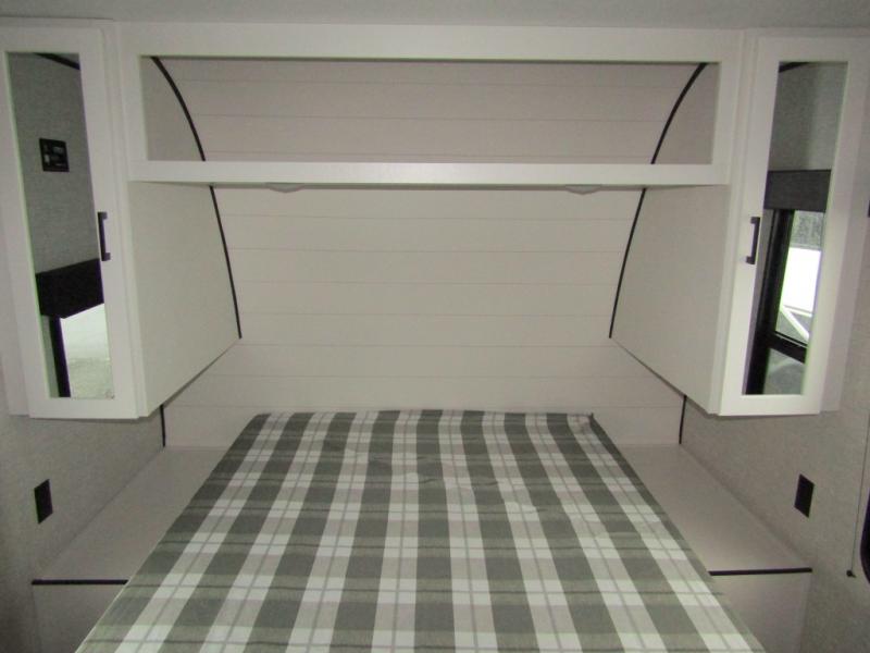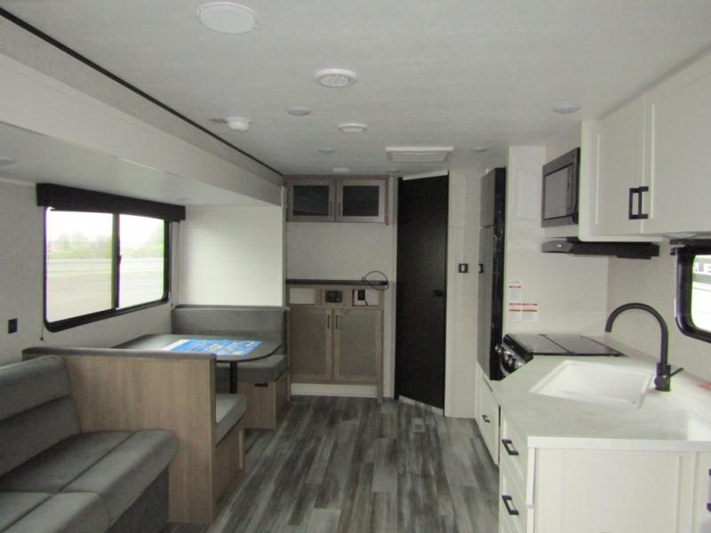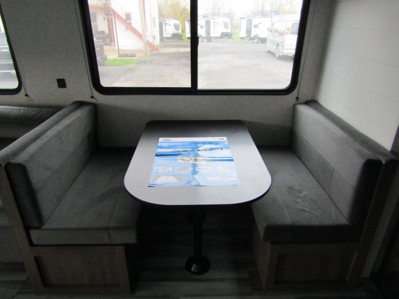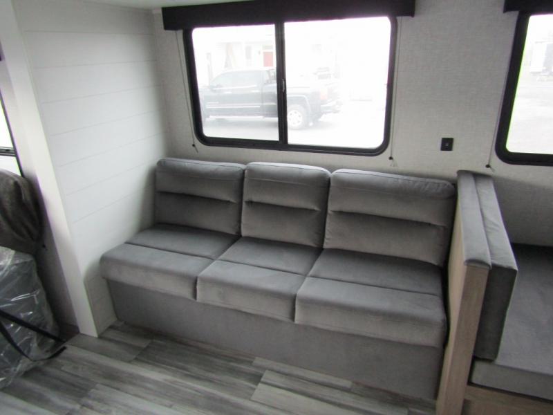 You can comfortably sleep up to six people in this trailer thanks to the RV queen bed in the front bedroom, plus the booth dinette and jack-knife sofa in the main living area! The chef of your crew will have a three burner cooktop and microwave oven to prepare meals, and everyone can store their favorite drinks in the 8 cu. ft. 12V refrigerator. The walk-through bath is spacious and includes a radius shower, toilet, a sink, and linen closet and is the full width of the unit. The outside storage will let you bring along camp chairs and games, fishing poles and more, plus the 18' 3" power awning with LED lights will create a nice place to gather in the evenings!