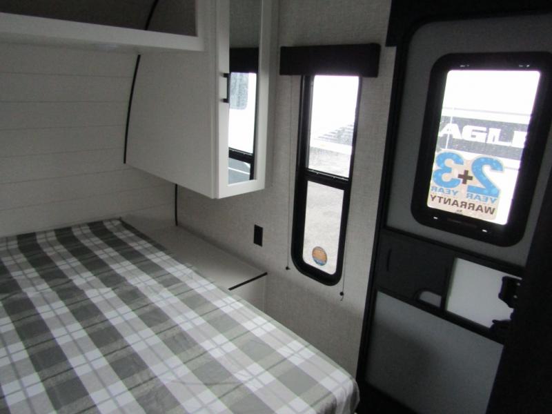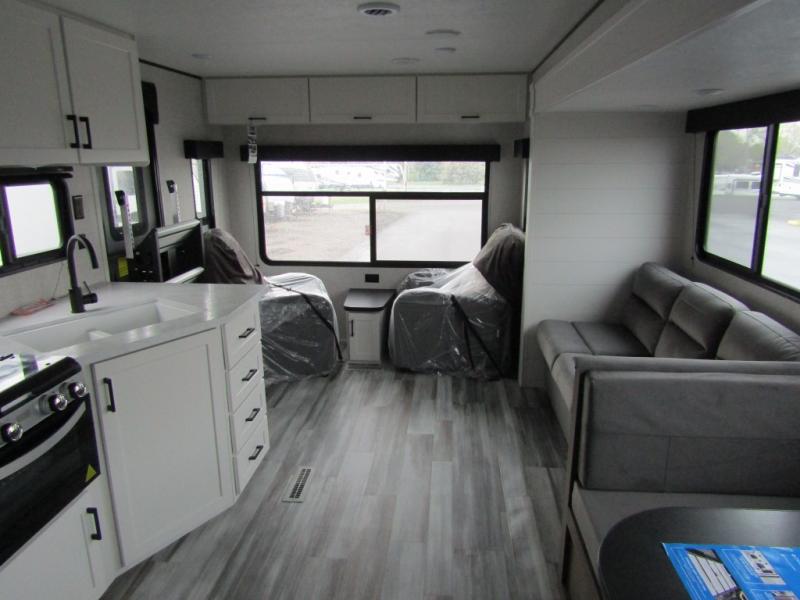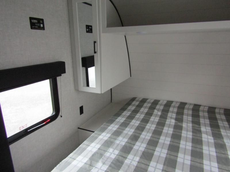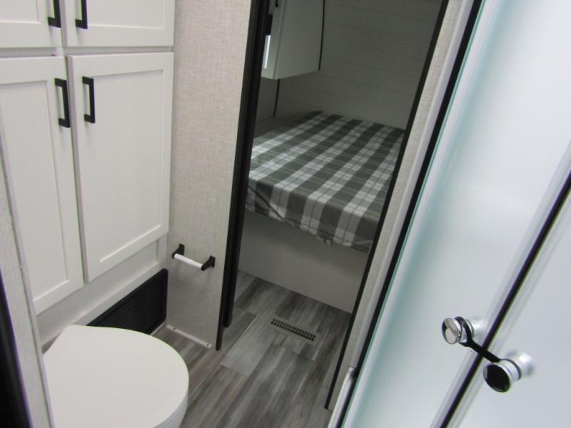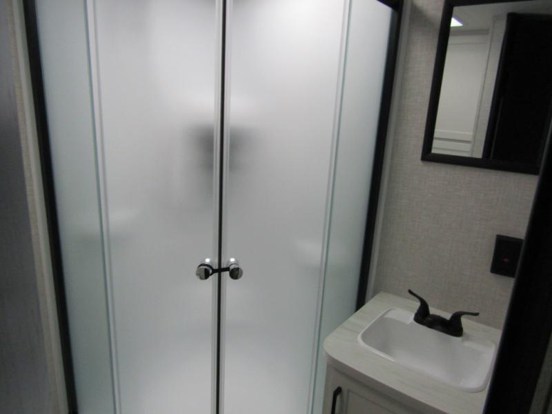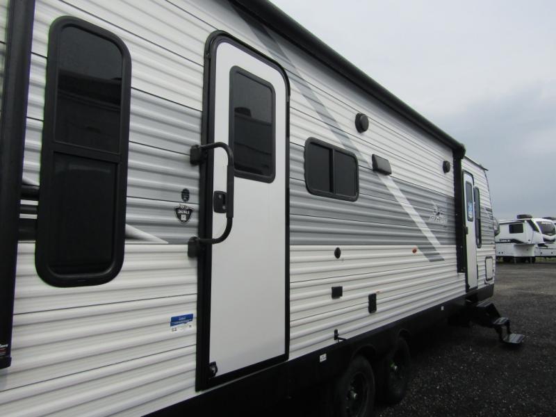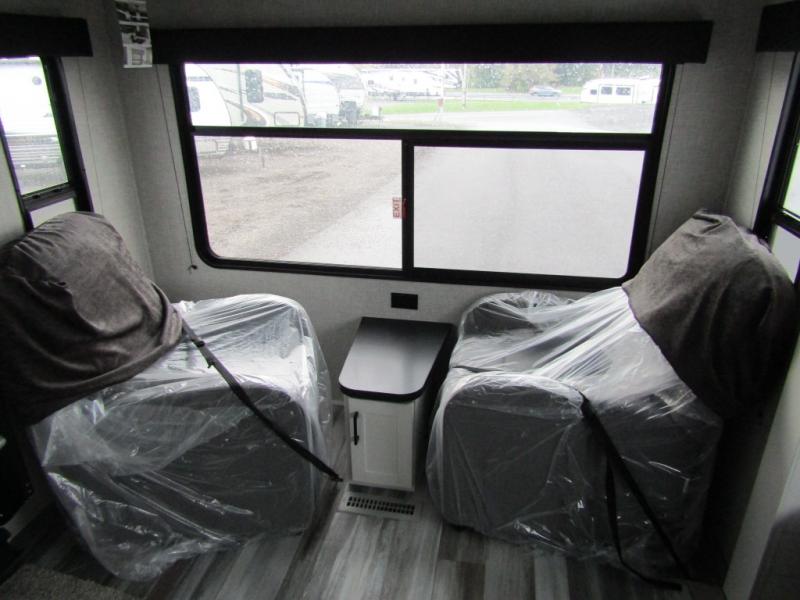 You can comfortably sleep up to six people in this trailer thanks to the RV queen bed in the front bedroom, plus the booth dinette and jack-knife sofa in the main living area! The chef of your crew will have a three burner cooktop and microwave oven to prepare meals, and everyone can store their favorite drinks in the 8 cu. ft. 12V refrigerator. The walk-through bath is spacious and includes a radius shower, toilet, a sink, and linen closet and is the full width of the unit. The outside storage will let you bring along camp chairs and games, fishing poles and more, plus the 18' 3" power awning with LED lights will create a nice place to gather in the evenings!