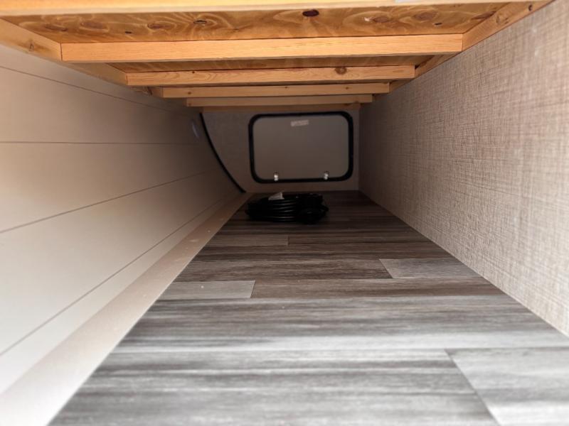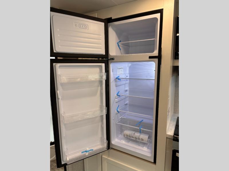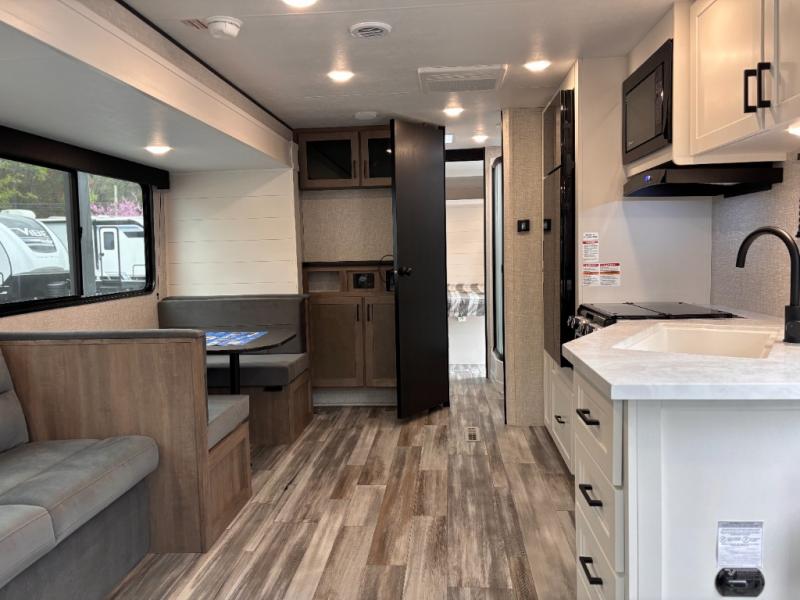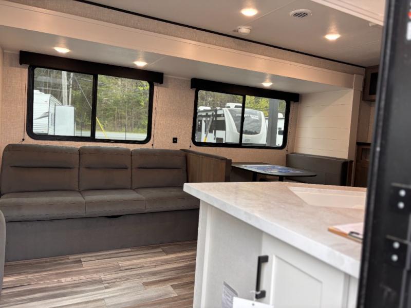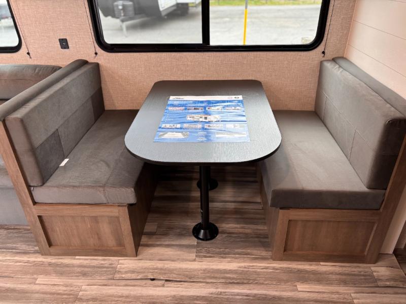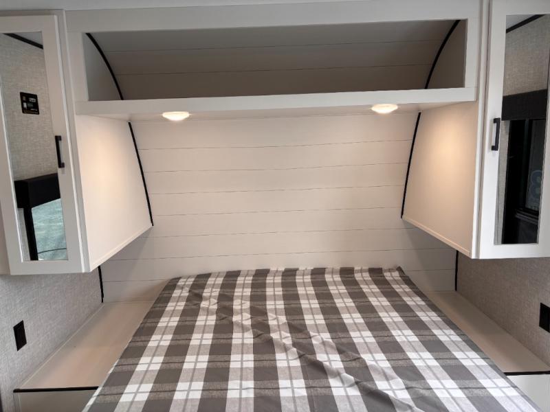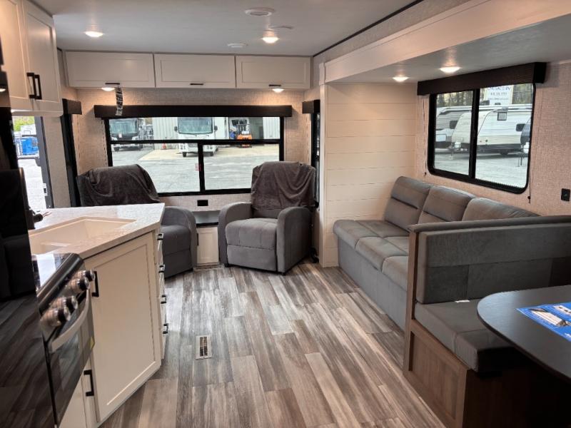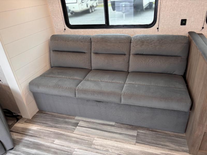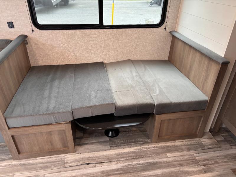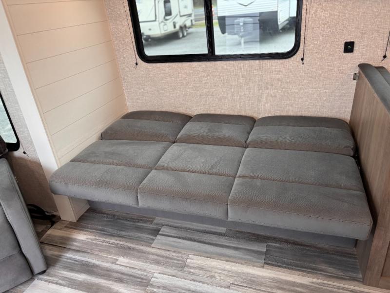 You can comfortably sleep up to six people in this trailer thanks to the RV queen bed in the front bedroom, plus the booth dinette and jack-knife sofa in the main living area! The chef of your crew will have a three burner cooktop and microwave oven to prepare meals, and everyone can store their favorite drinks in the 8 cu. ft. 12V refrigerator. The walk-through bath is spacious and includes a radius shower, toilet, a sink, and linen closet and is the full width of the unit. The outside storage will let you bring along camp chairs and games, fishing poles and more, plus the 18' 3" power awning with LED lights will create a nice place to gather in the evenings!