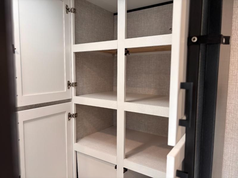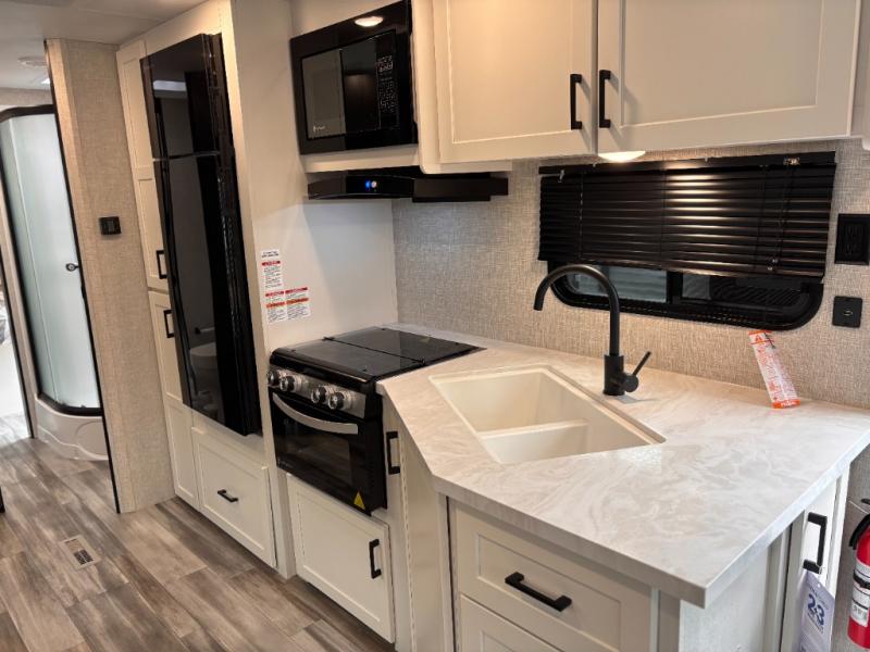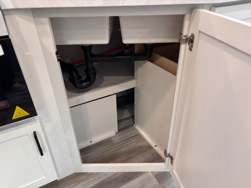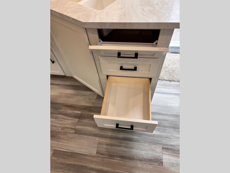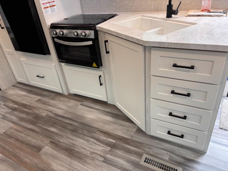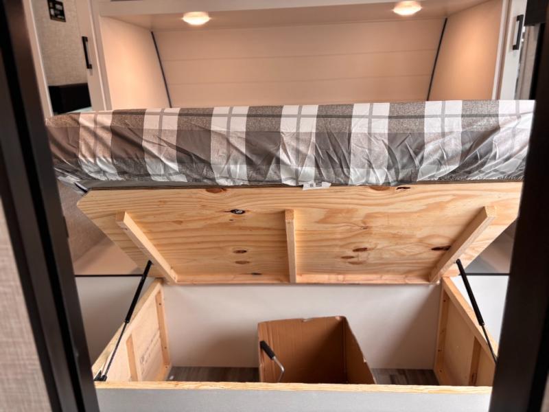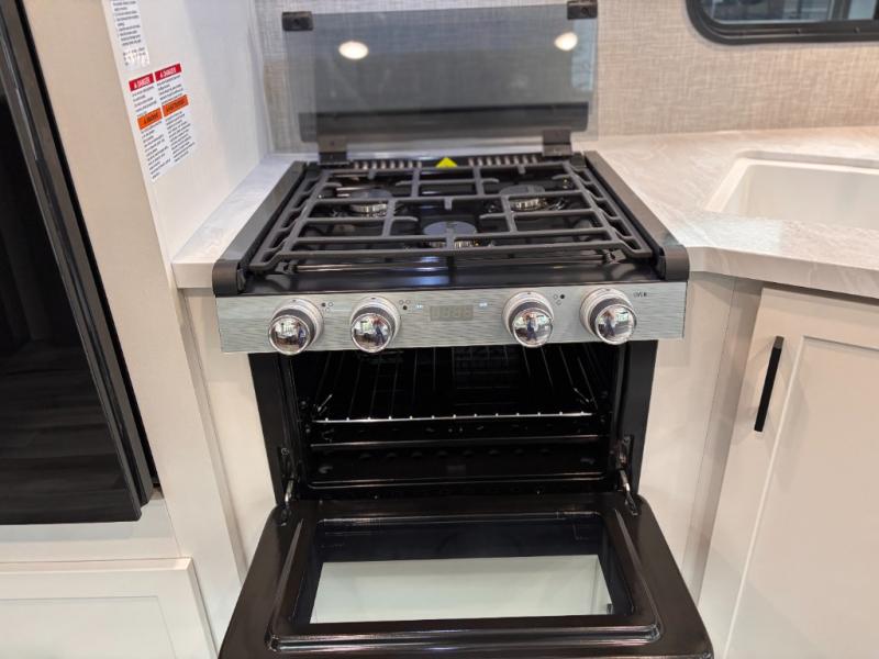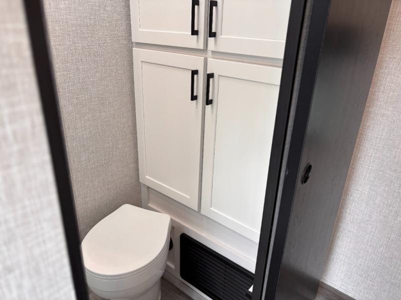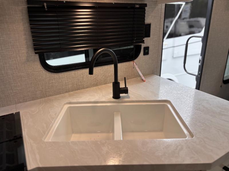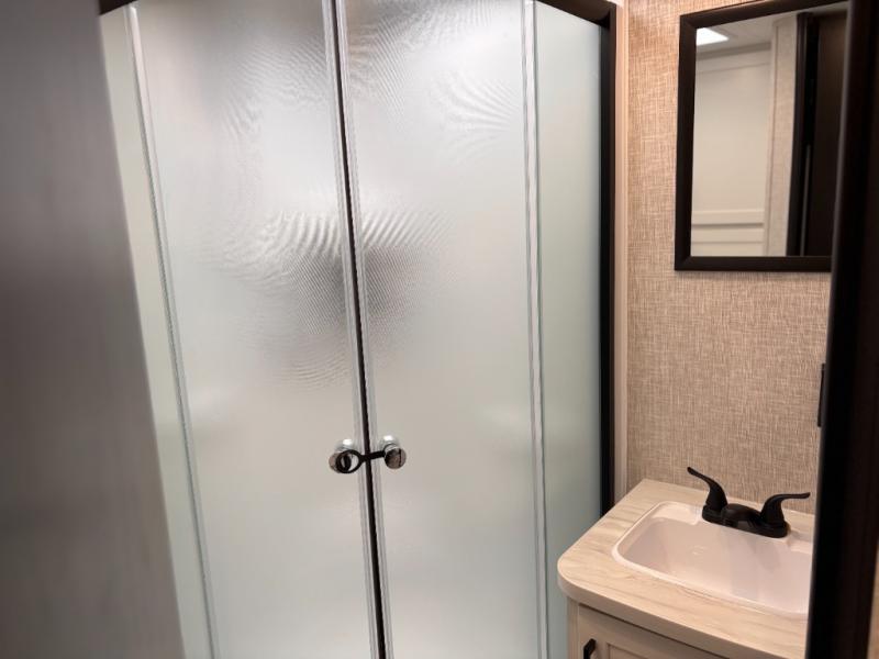 You can comfortably sleep up to six people in this trailer thanks to the RV queen bed in the front bedroom, plus the booth dinette and jack-knife sofa in the main living area! The chef of your crew will have a three burner cooktop and microwave oven to prepare meals, and everyone can store their favorite drinks in the 8 cu. ft. 12V refrigerator. The walk-through bath is spacious and includes a radius shower, toilet, a sink, and linen closet and is the full width of the unit. The outside storage will let you bring along camp chairs and games, fishing poles and more, plus the 18' 3" power awning with LED lights will create a nice place to gather in the evenings!