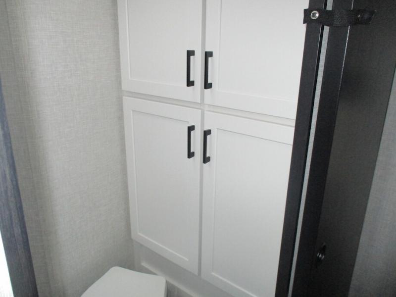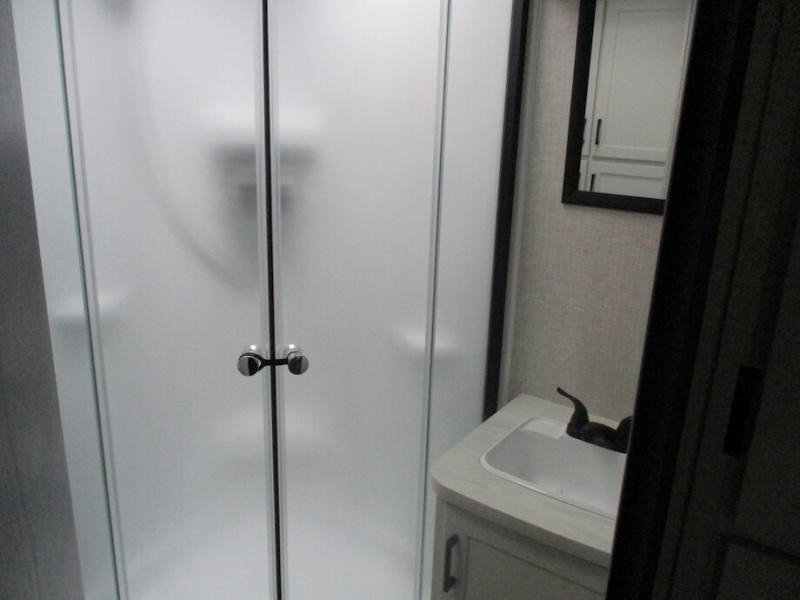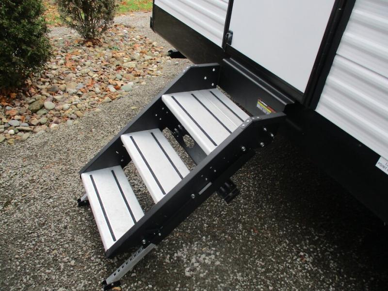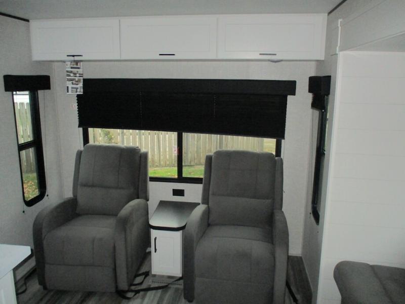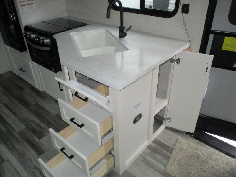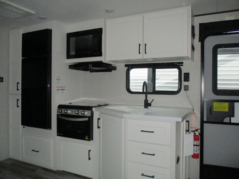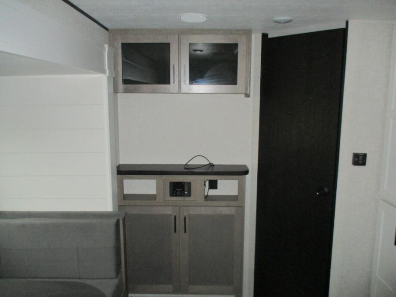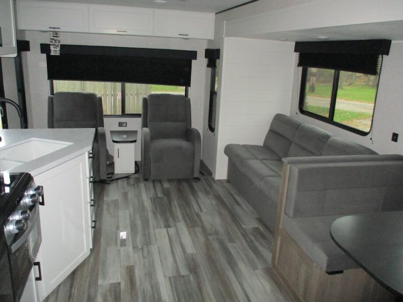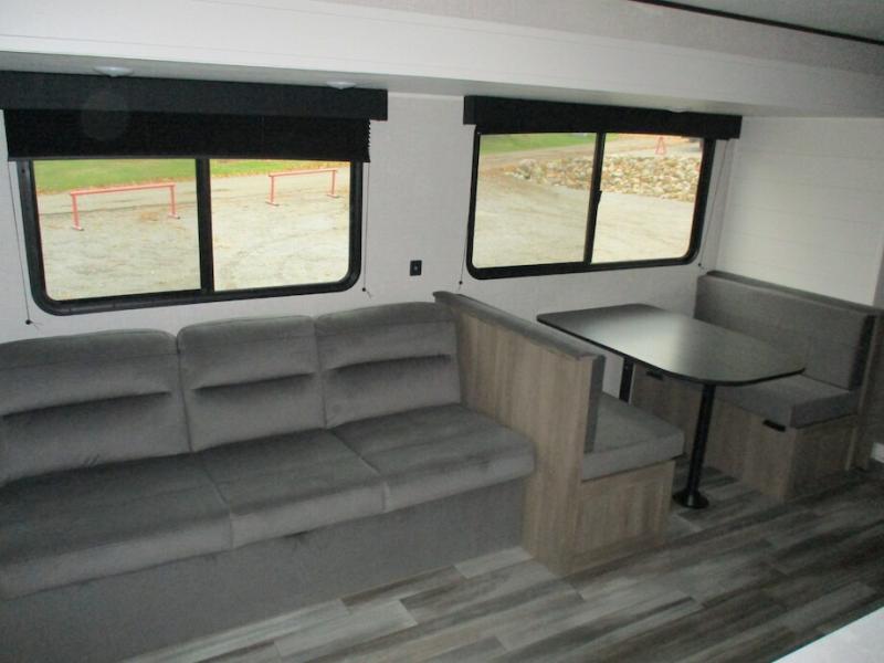 You can comfortably sleep up to six people in this trailer thanks to the RV queen bed in the front bedroom, plus the booth dinette and jack-knife sofa in the main living area! The chef of your crew will have a three burner cooktop and microwave oven to prepare meals, and everyone can store their favorite drinks in the 8 cu. ft. 12V refrigerator. The walk-through bath is spacious and includes a radius shower, toilet, a sink, and linen closet and is the full width of the unit. The outside storage will let you bring along camp chairs and games, fishing poles and more, plus the 18' 3" power awning with LED lights will create a nice place to gather in the evenings!