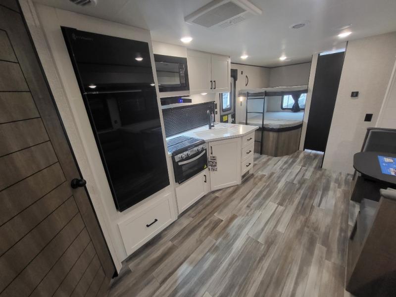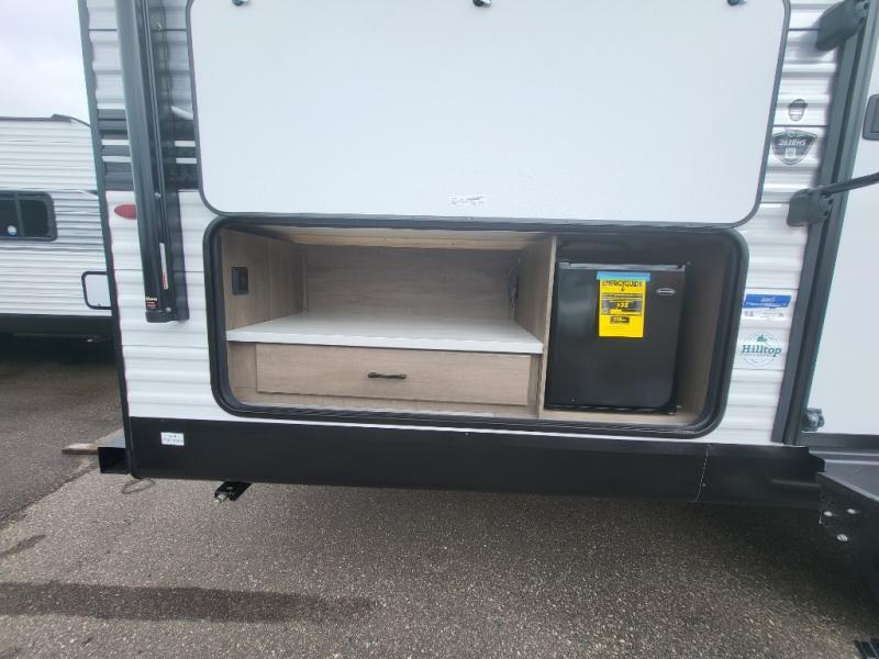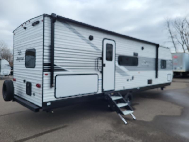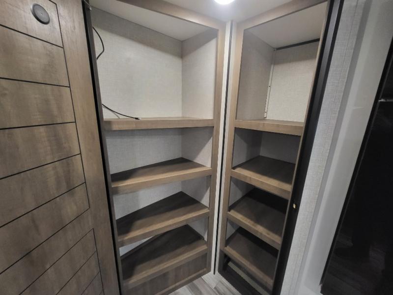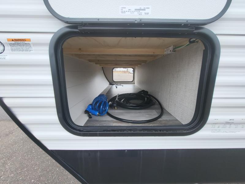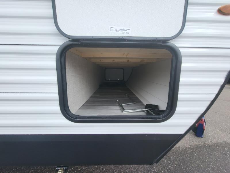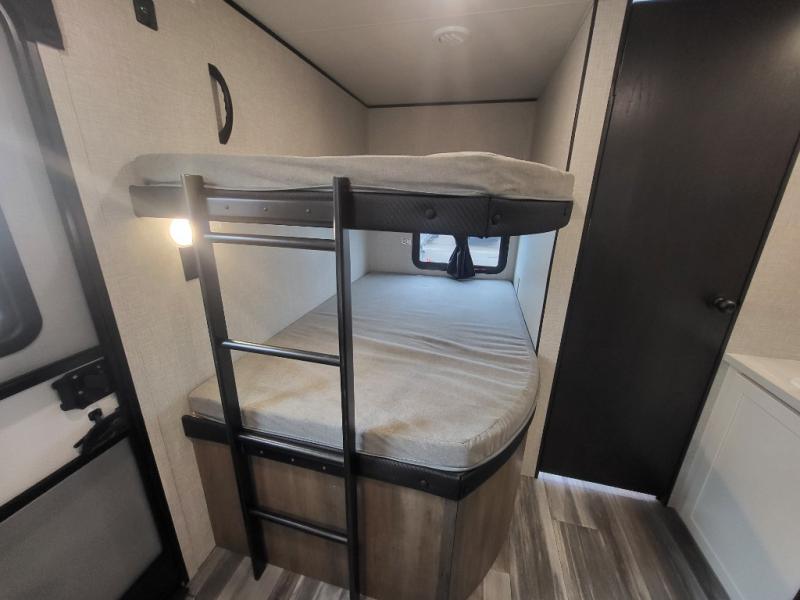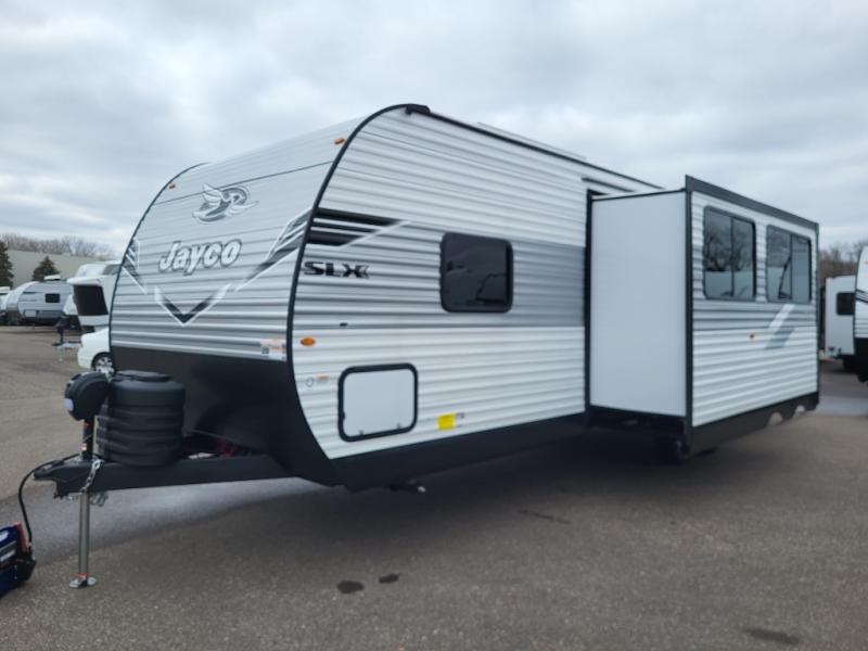 If space is what you're looking for in your next trailer, space is what you'll get this this Jay Flight SLX! The large slide houses the jack-knife sofa and booth dinette, and the added space here will provide everyone room to move about. The chef of your group will love cooking inside, or they can head outside to cook on the outdoor kitchen. Double-size bunks are sure to be a big hit with the little ones, and you'll love having your own space up front in the private bedroom. This unit includes ample storage space, including a hidden pantry with shelves, a bedroom closet plus dual bedside wardrobes, plus exterior storage for hiking or fishing gear!