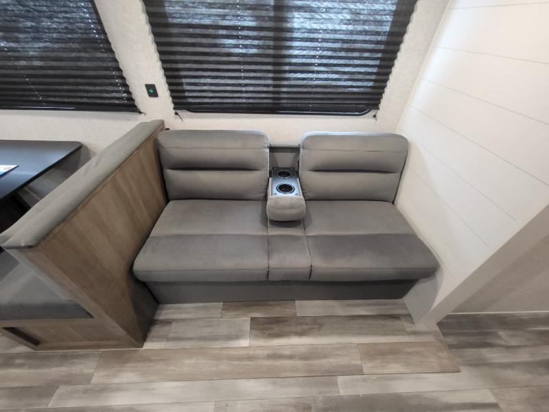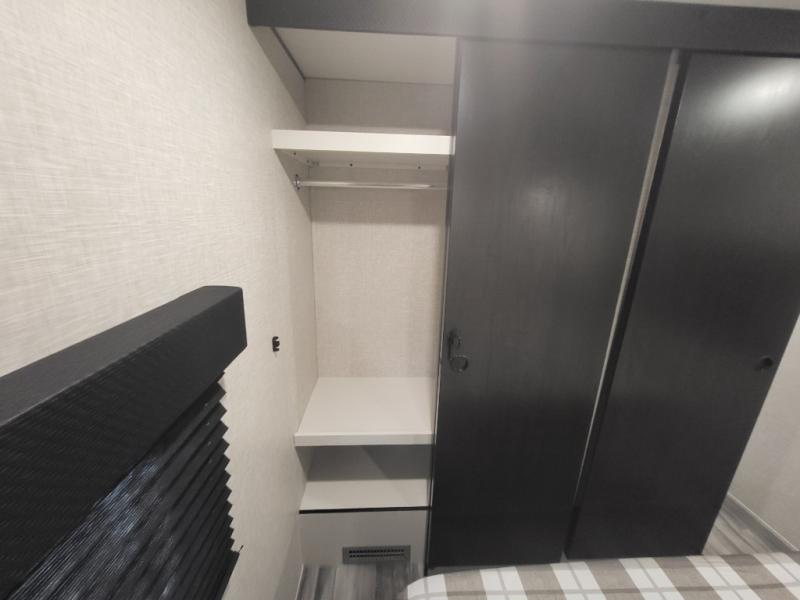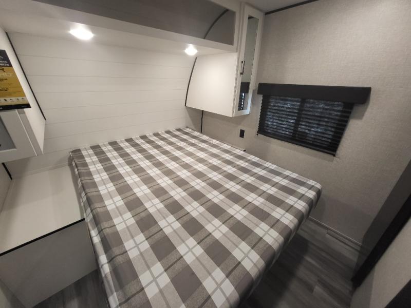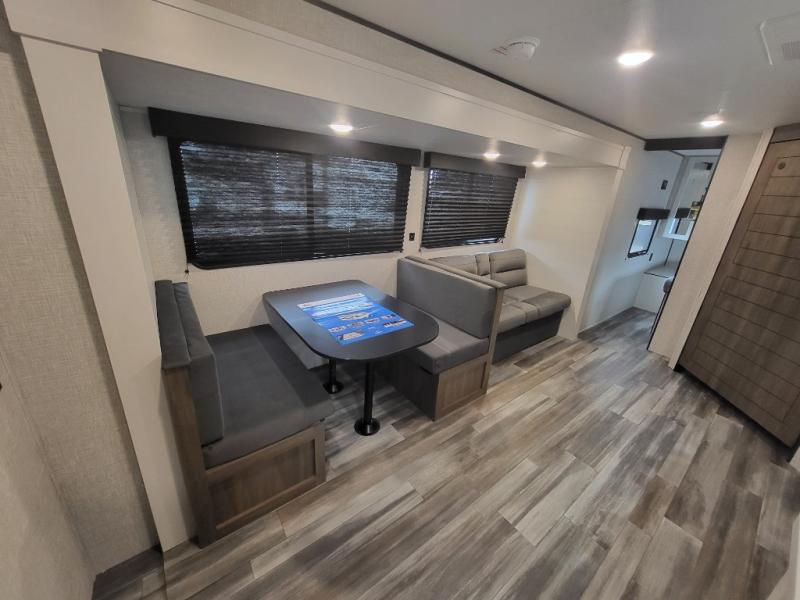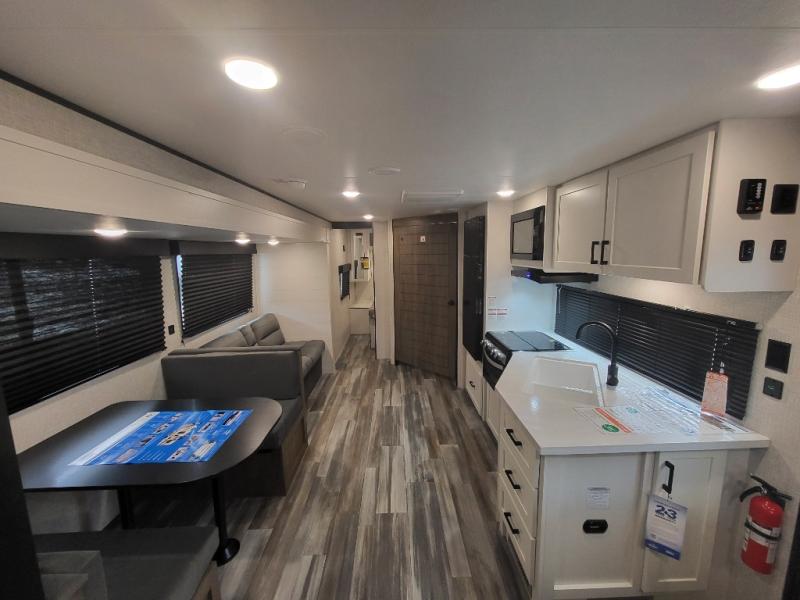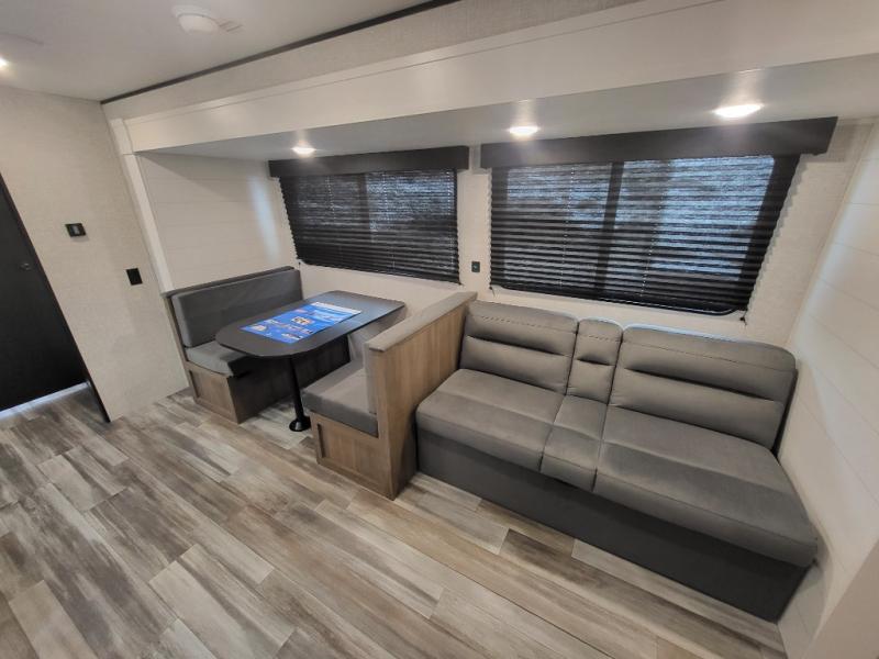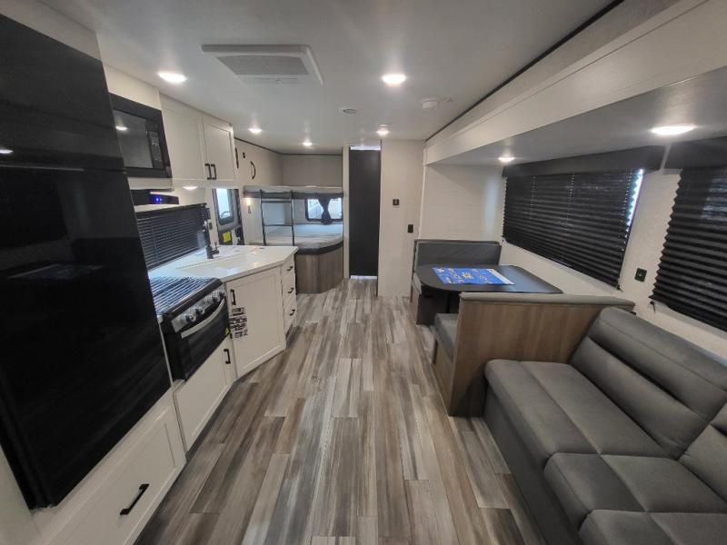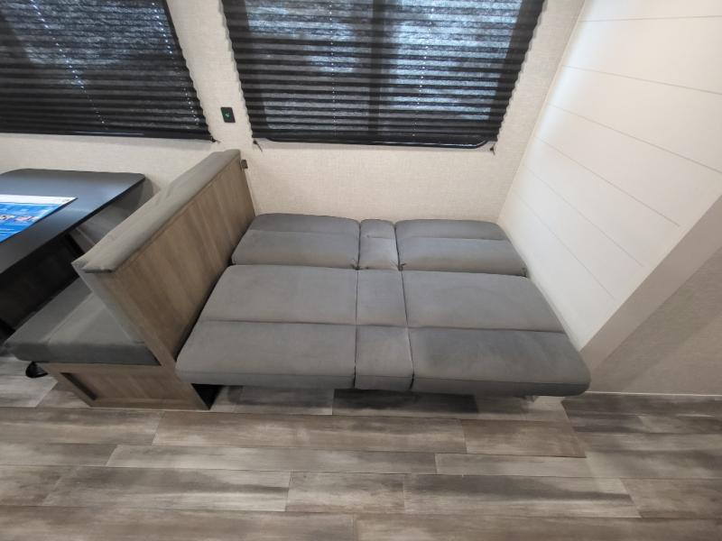 If space is what you're looking for in your next trailer, space is what you'll get this this Jay Flight SLX! The large slide houses the jack-knife sofa and booth dinette, and the added space here will provide everyone room to move about. The chef of your group will love cooking inside, or they can head outside to cook on the outdoor kitchen. Double-size bunks are sure to be a big hit with the little ones, and you'll love having your own space up front in the private bedroom. This unit includes ample storage space, including a hidden pantry with shelves, a bedroom closet plus dual bedside wardrobes, plus exterior storage for hiking or fishing gear!