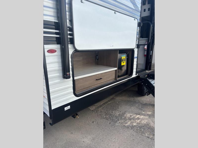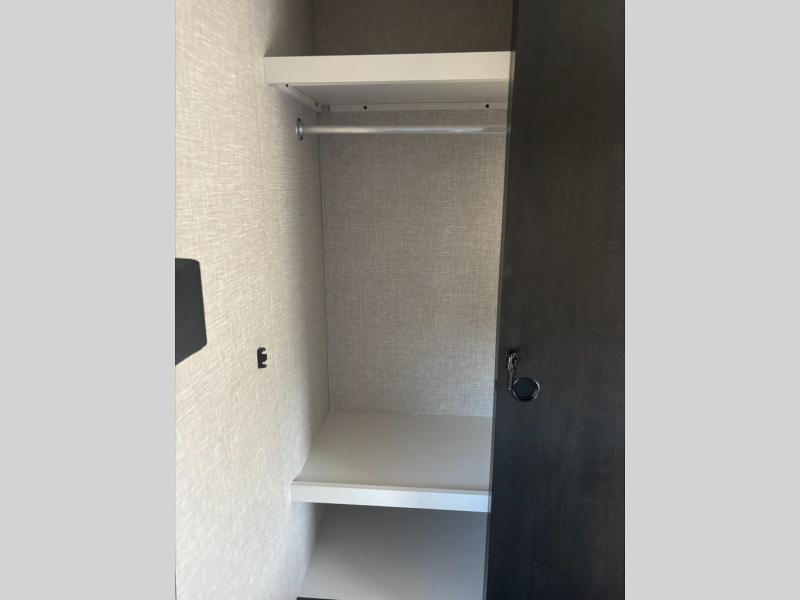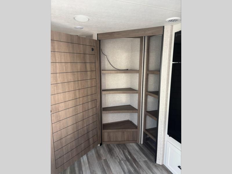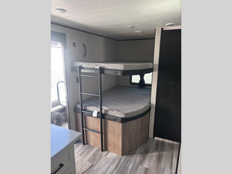 If space is what you're looking for in your next trailer, space is what you'll get this this Jay Flight SLX! The large slide houses the jack-knife sofa and booth dinette, and the added space here will provide everyone room to move about. The chef of your group will love cooking inside, or they can head outside to cook on the outdoor kitchen. Double-size bunks are sure to be a big hit with the little ones, and you'll love having your own space up front in the private bedroom. This unit includes ample storage space, including a hidden pantry with shelves, a bedroom closet plus dual bedside wardrobes, plus exterior storage for hiking or fishing gear!