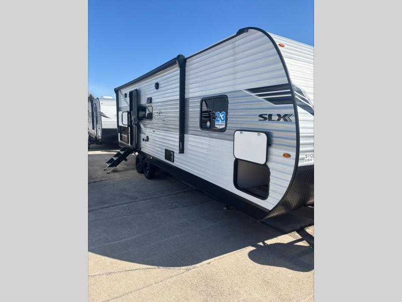 The Jayco Jay Flight SLX travel trailer is quite easy to own because it is lightweight for an easier towing experience. Built on a fully integrated A-frame with galvanized-steel, impact-resistant wheel wells, the Jay Flight SLX has quality at its very foundation. That quality continues on to the electric self-adjusting brakes, easy-lube hubs, Magnum Truss roof system, and LP quick connect. Some of what the mandatory Customer Value Package includes is backup camera prep, Keyed-Alike entry and baggage doors, marine grade exterior speakers, and an on-demand tankless water heater.