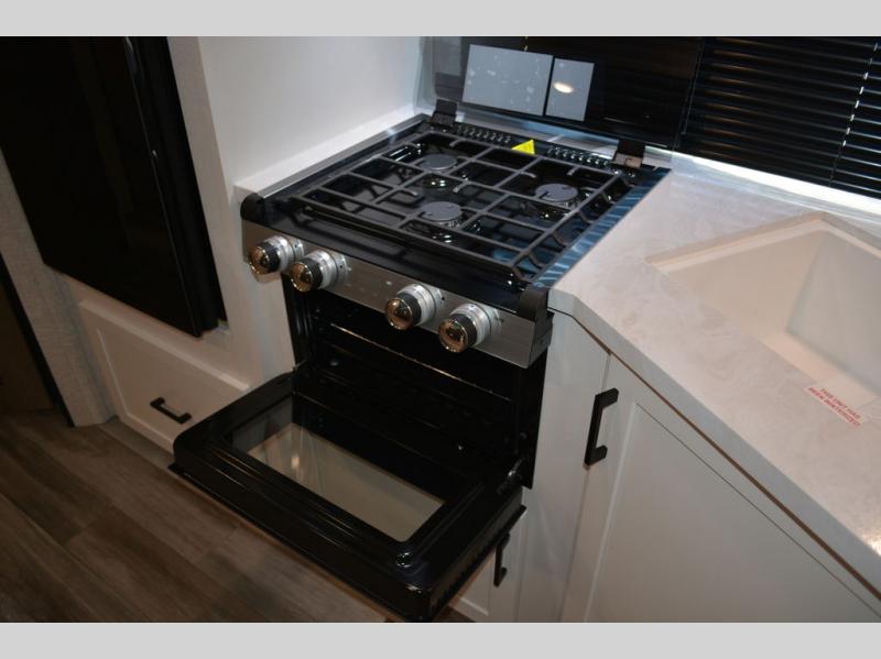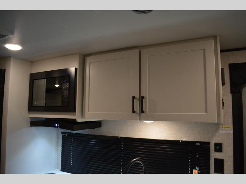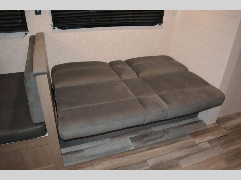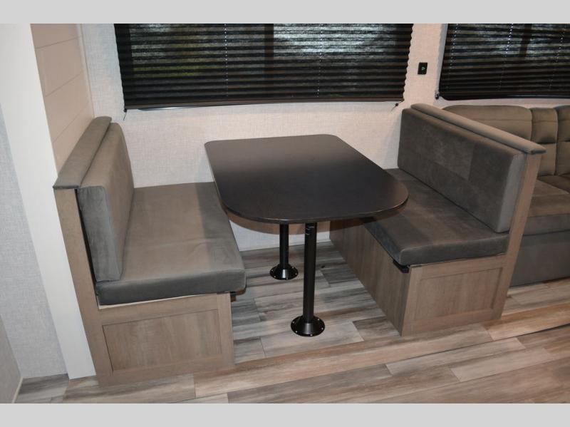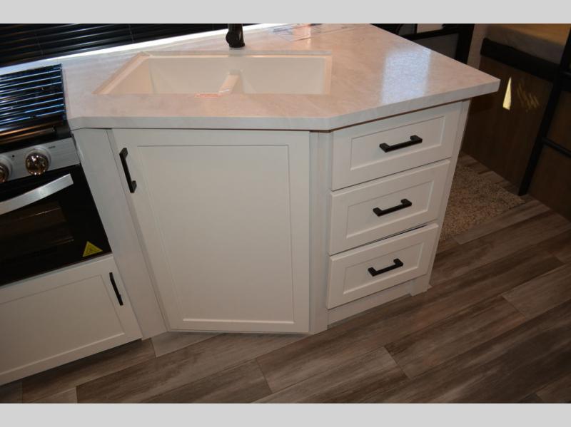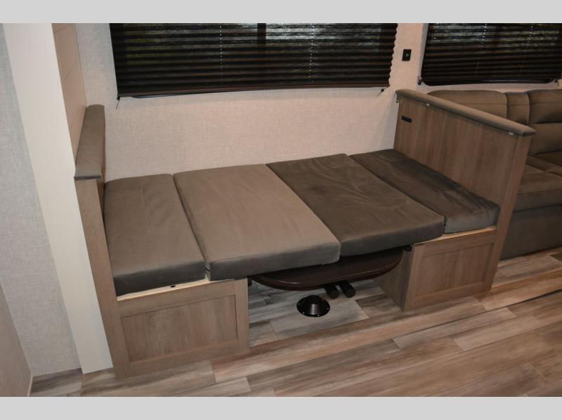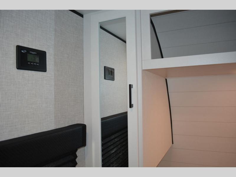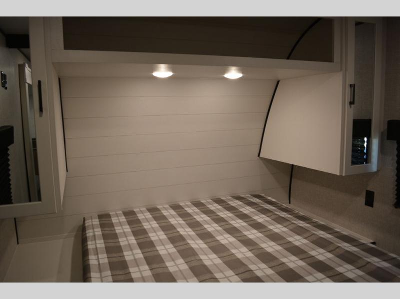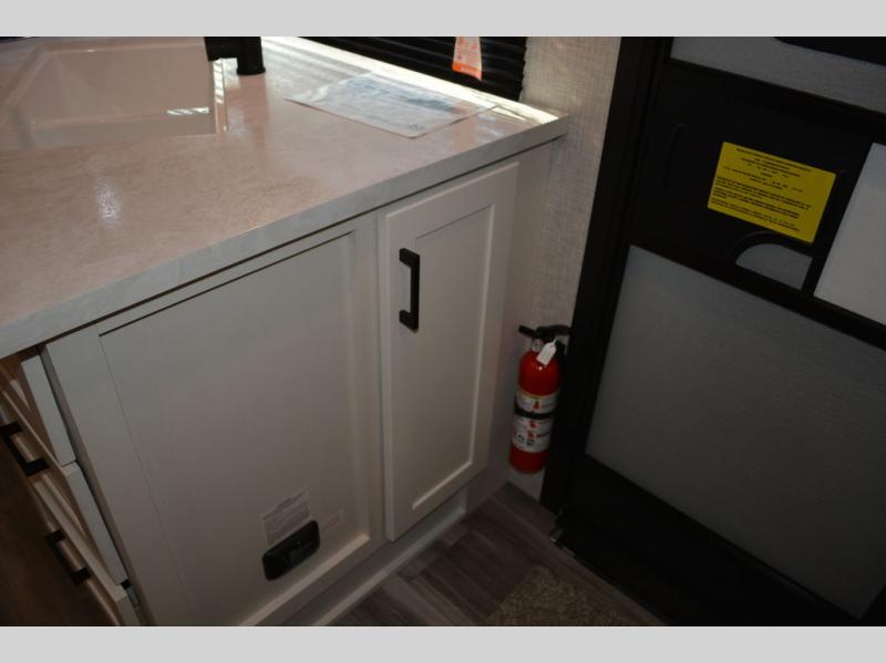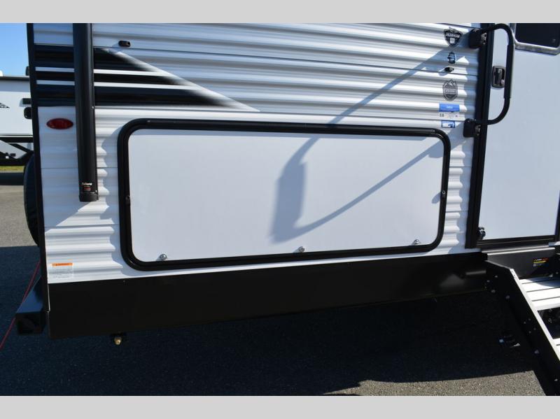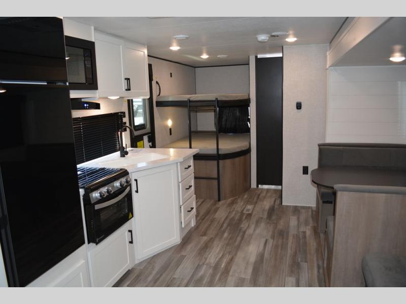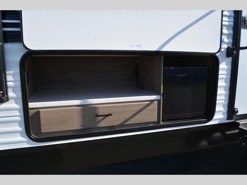 If space is what you're looking for in your next trailer, space is what you'll get this this Jay Flight SLX! The large slide houses the jack-knife sofa and booth dinette, and the added space here will provide everyone room to move about. The chef of your group will love cooking inside, or they can head outside to cook on the outdoor kitchen. Double-size bunks are sure to be a big hit with the little ones, and you'll love having your own space up front in the private bedroom. This unit includes ample storage space, including a hidden pantry with shelves, a bedroom closet plus dual bedside wardrobes, plus exterior storage for hiking or fishing gear!