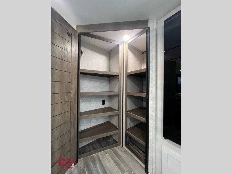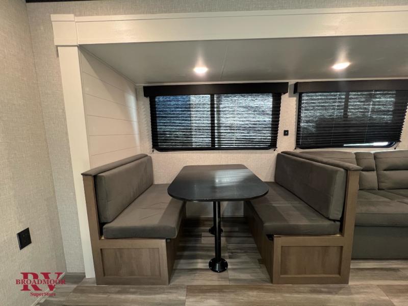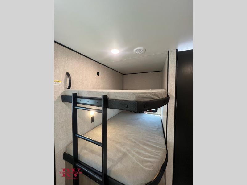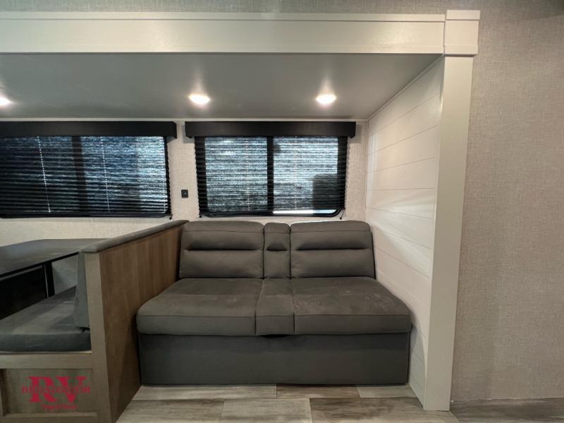 If space is what you're looking for in your next trailer, space is what you'll get this this Jay Flight SLX! The large slide houses the jack-knife sofa and booth dinette, and the added space here will provide everyone room to move about. The chef of your group will love cooking inside, or they can head outside to cook on the outdoor kitchen. Double-size bunks are sure to be a big hit with the little ones, and you'll love having your own space up front in the private bedroom. This unit includes ample storage space, including a hidden pantry with shelves, a bedroom closet plus dual bedside wardrobes, plus exterior storage for hiking or fishing gear!