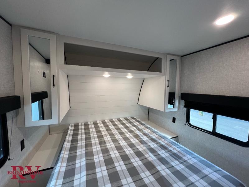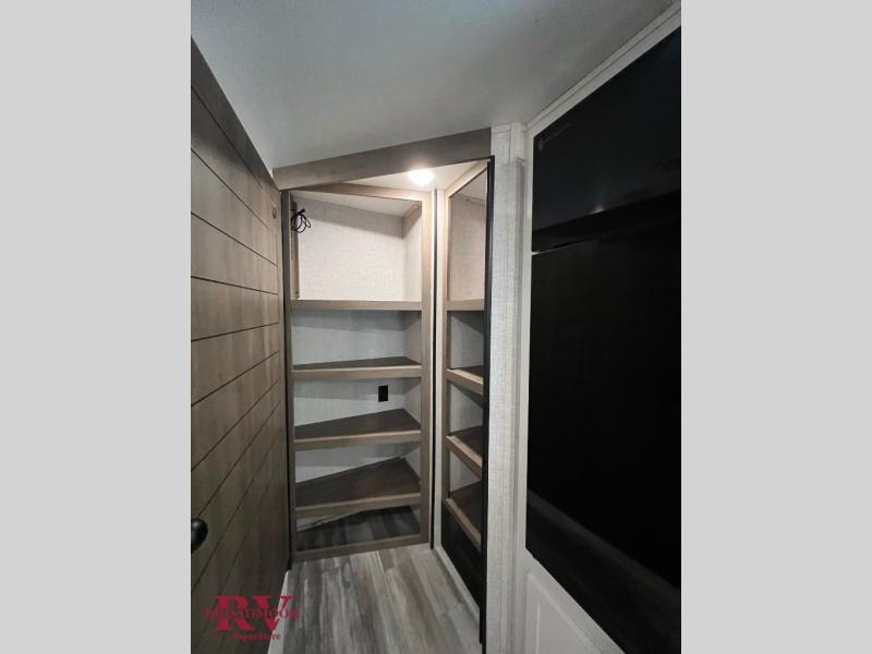 If space is what you're looking for in your next trailer, space is what you'll get this this Jay Flight SLX! The large slide houses the jack-knife sofa and booth dinette, and the added space here will provide everyone room to move about. The chef of your group will love cooking inside, or they can head outside to cook on the outdoor kitchen. Double-size bunks are sure to be a big hit with the little ones, and you'll love having your own space up front in the private bedroom. This unit includes ample storage space, including a hidden pantry with shelves, a bedroom closet plus dual bedside wardrobes, plus exterior storage for hiking or fishing gear!