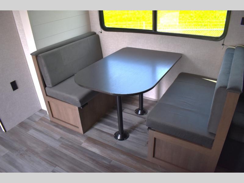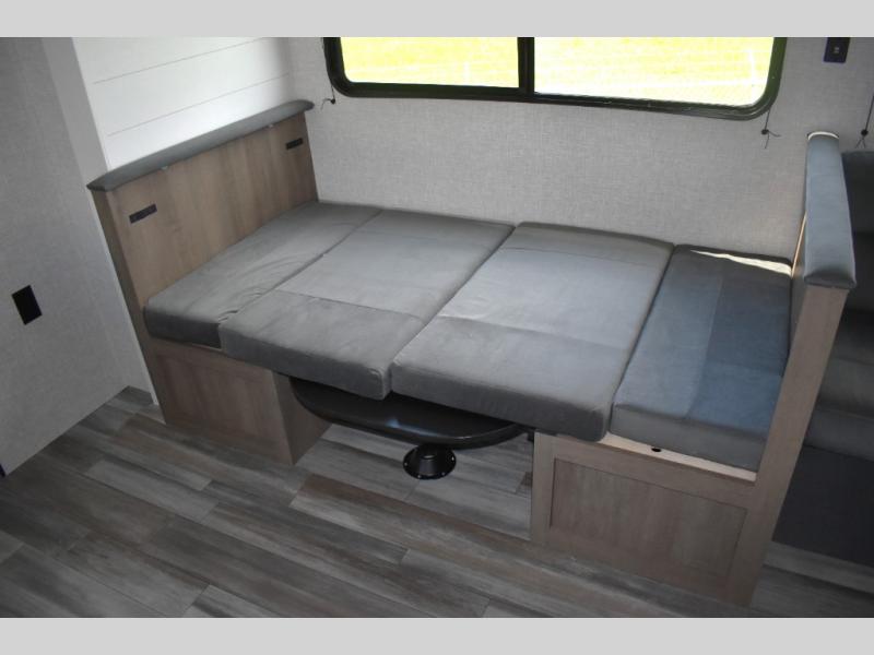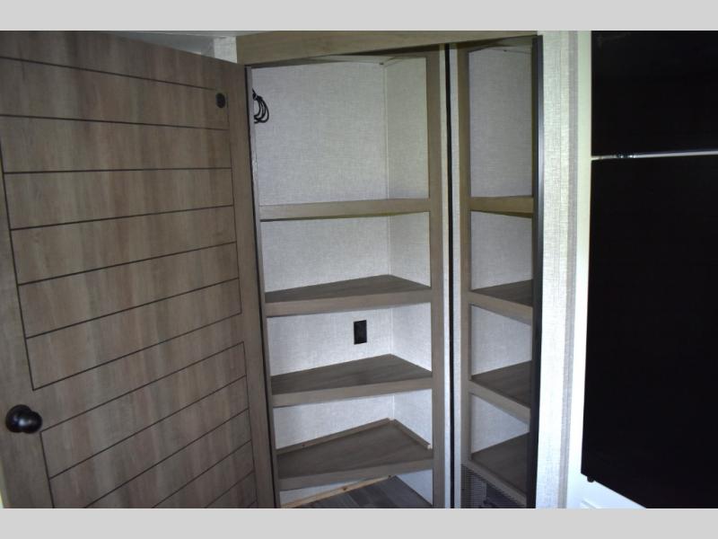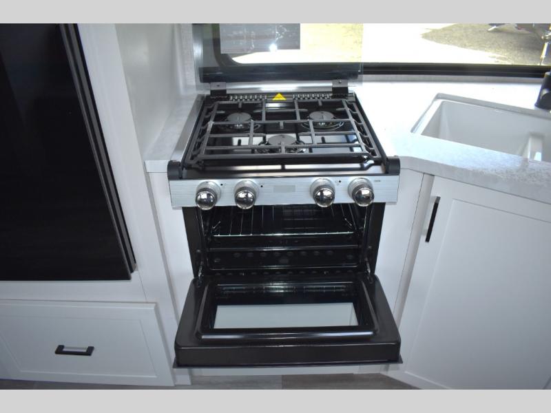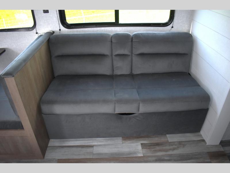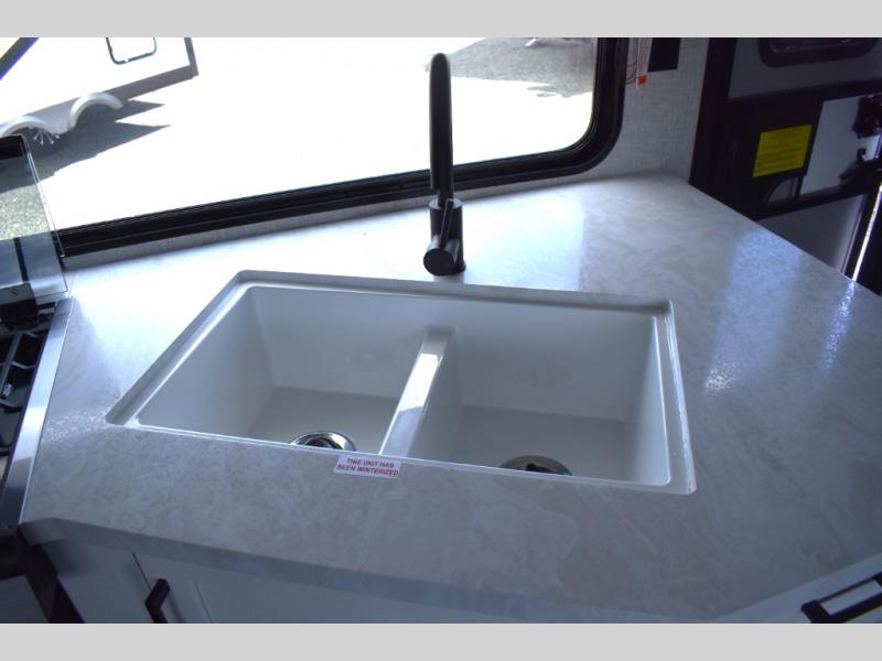 It comes equipped with a tankless water heater, a 20-foot power awning, and plenty of storage compartments, including under-bed storage and an oversized pantry. The dual-axle suspension makes towing smooth and manageable, while the classic farmhouse interior design adds a cozy touch.