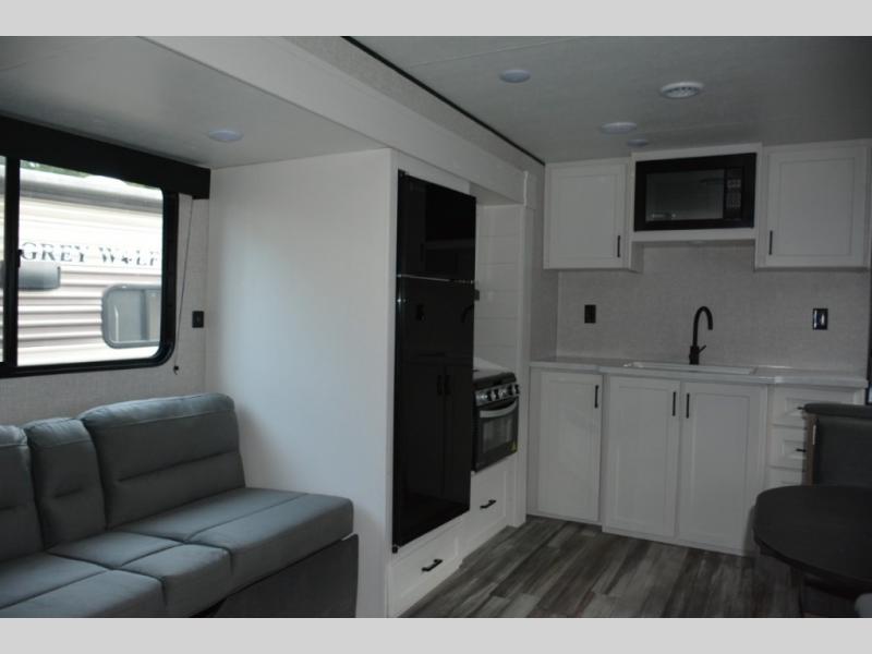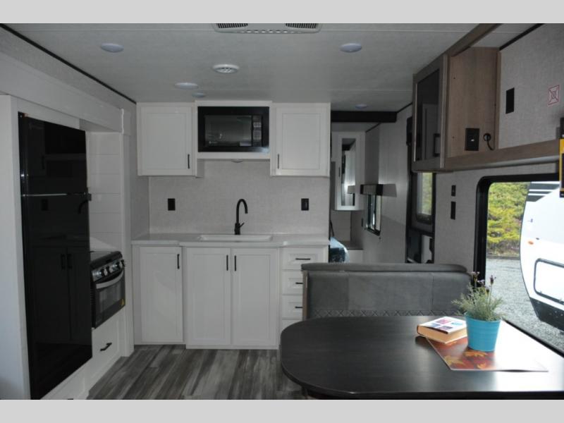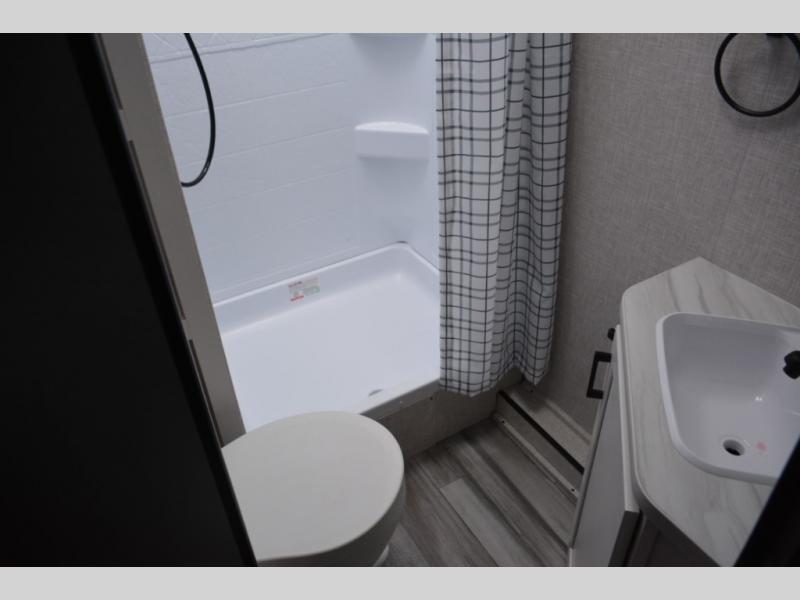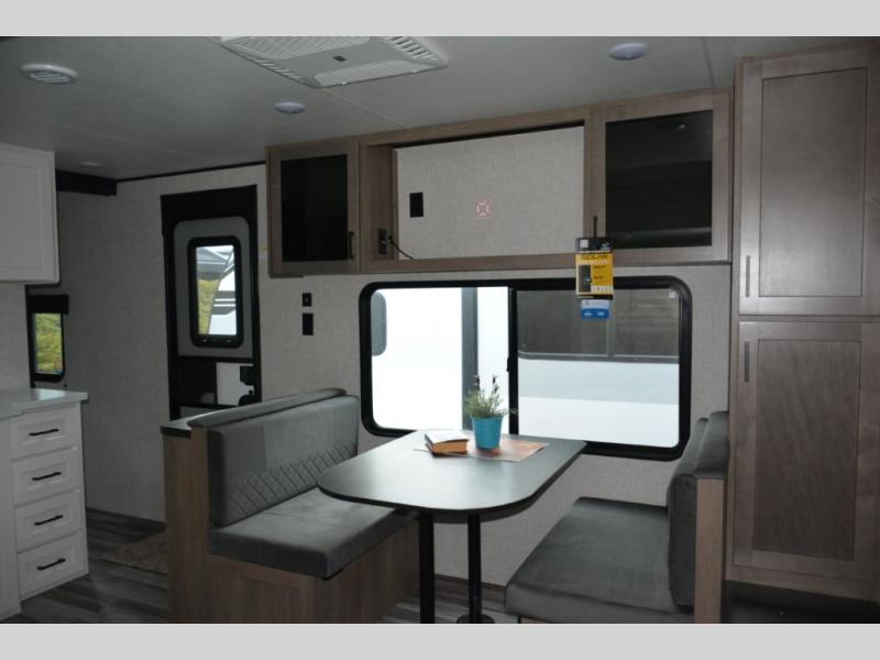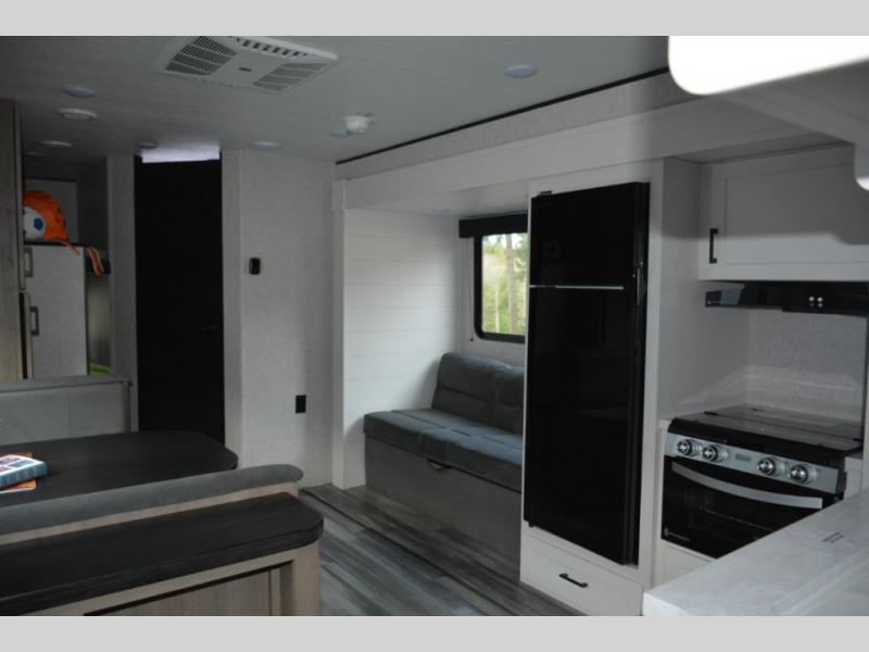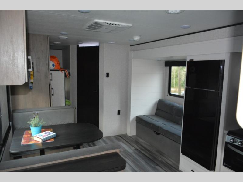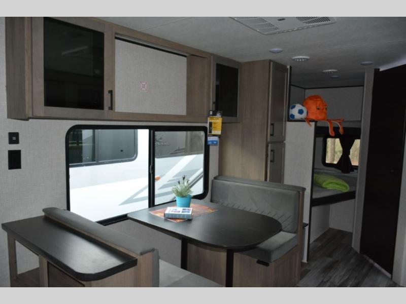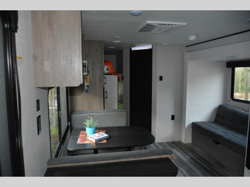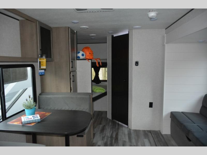 Wherever you decide to camp, you'll be met with comforts each day with this spacious travel trailer. There is a large slide out that will give the dog more space to nap on the floor. Your crew can relax on the jack-knife sofa, play a game at the booth dinette, or visit outdoors under the 16' power awning with LED lights. The outside kitchen is complete with an outdoor refrigerator for cold drinks, and there is an LP Quick Connect if you want to add your own grill. Head inside to clean up in the full bath, then head to bed in the front private bedroom. Here, you'll find a queen bed, dual wardrobes, plus a shelf for books. And your guests can sleep on the double-size bunks and living room furniture!