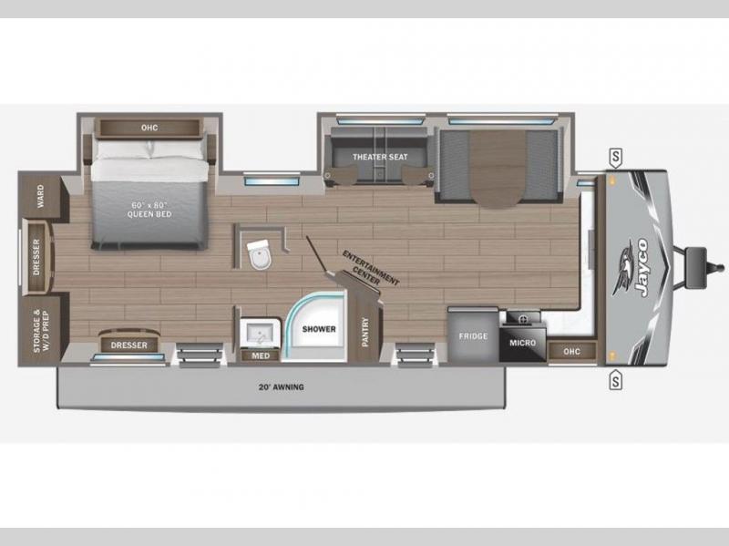 This front kitchen travel trailer is perfect for weekend trips or extended stays at the location of your choice! You'll love the ample counter space to prep meals, and there is a booth dinette where you can dine together each day. A theater seat is in great view of the entertainment center if you want to add a TV, or you may just find yourselves outdoors under the 20' power awning. This unit features a dual entry bath with a private entrance into the rear master bedroom. This room also includes a queen bed slide, a wardrobe and two dressers, plus additional storage with washer and dryer prep. And one of the dual entry doors is found here so you can slip out in the morning for some early fishing!