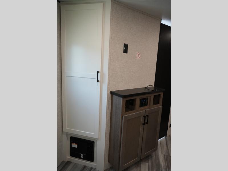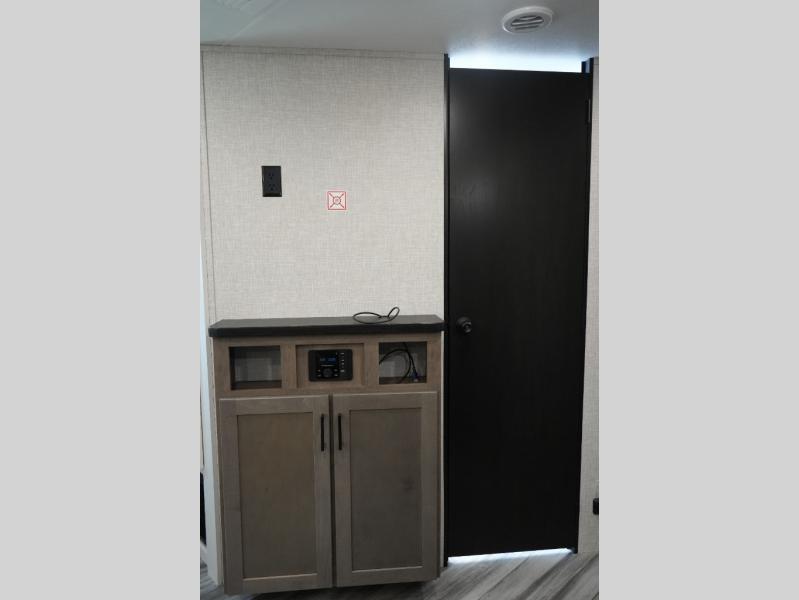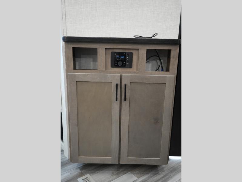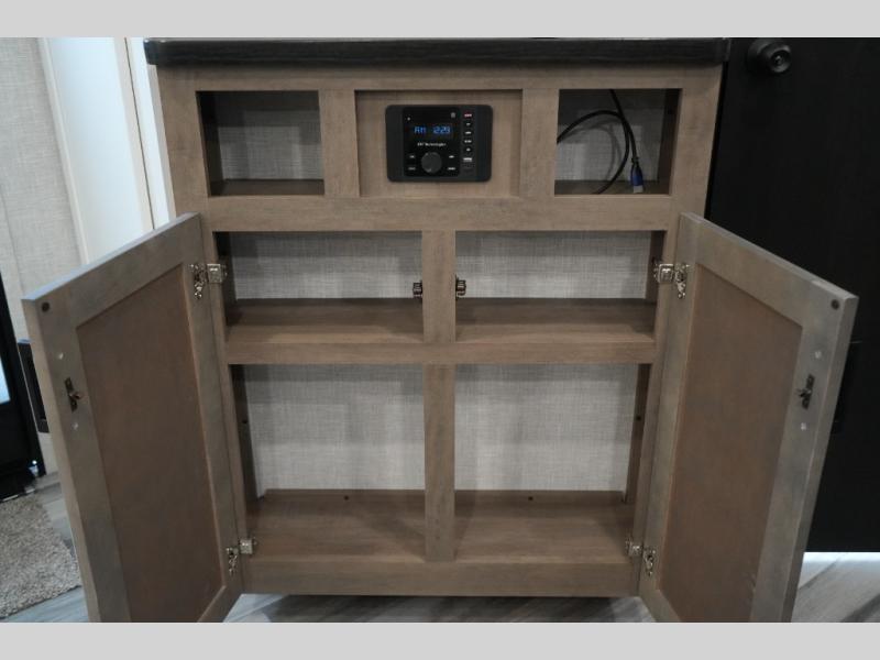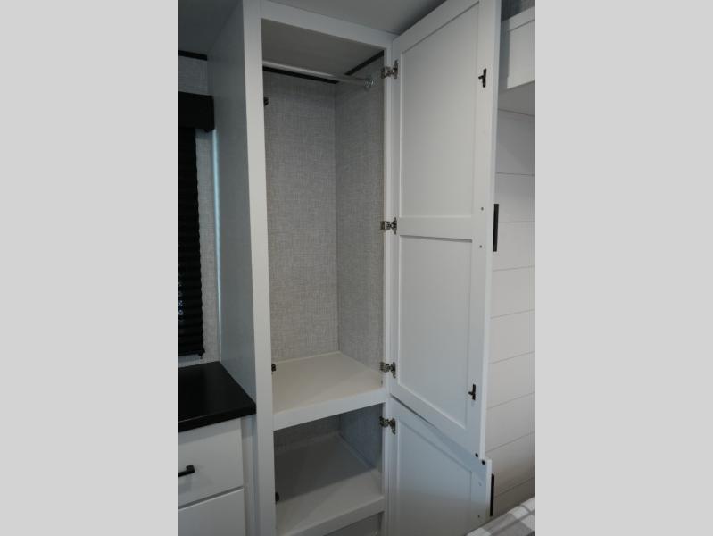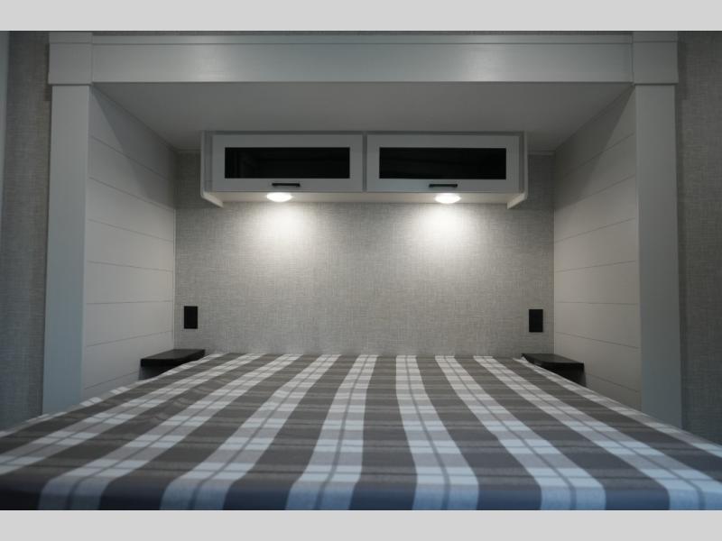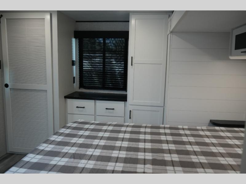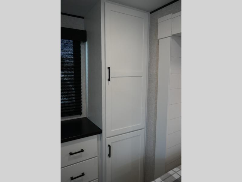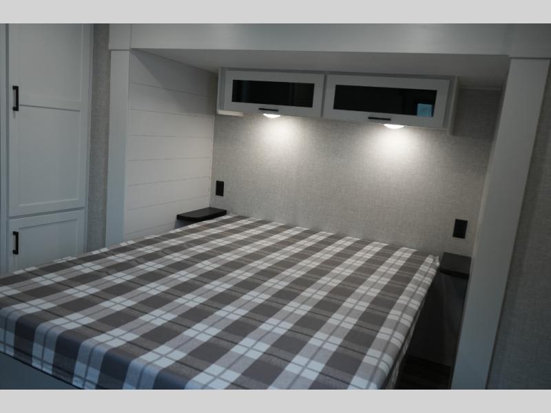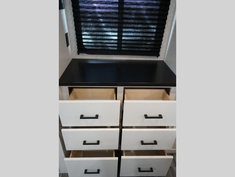 - Rear Master Bedroom – Includes a queen bed slide-out, two dressers, a wardrobe, and washer/dryer prep.