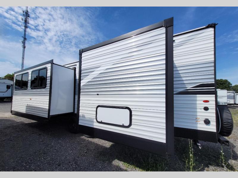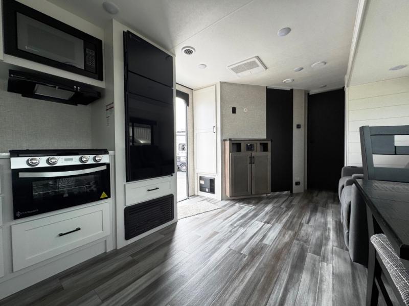 This front kitchen travel trailer is perfect for weekend trips or extended stays at the location of your choice! You'll love the ample counter space to prep meals, and there is a freestanding table and chairs where you can dine together each day. A theater seat is in great view of the entertainment center if you want to add a TV, or you may just find yourselves outdoors under the 20' power awning. This unit features a dual entry bath with a private entrance into the rear master bedroom. This room also includes a queen bed slide, a wardrobe and two dressers, plus additional storage with washer and dryer prep. And one of the dual entry doors is found here so you can slip out in the morning for some early fishing!