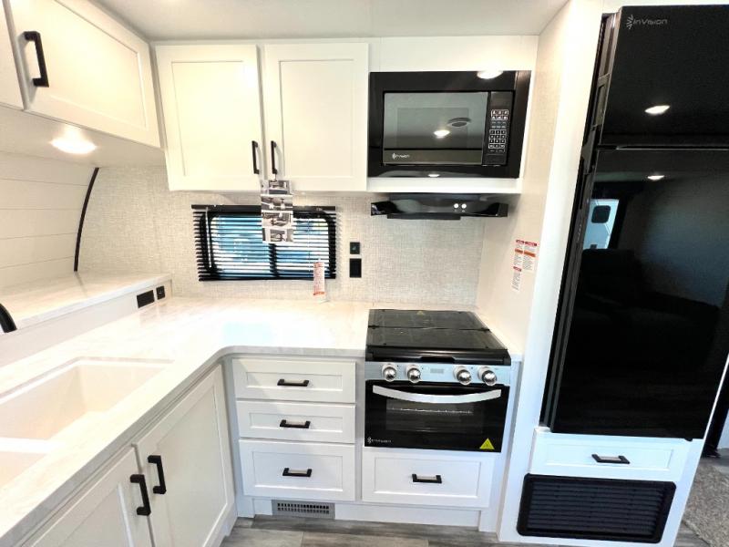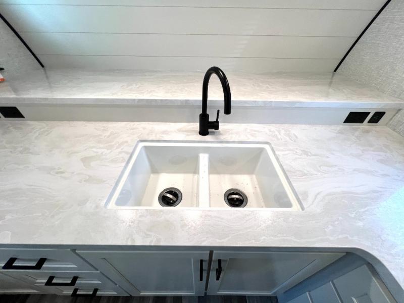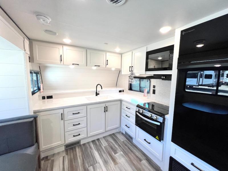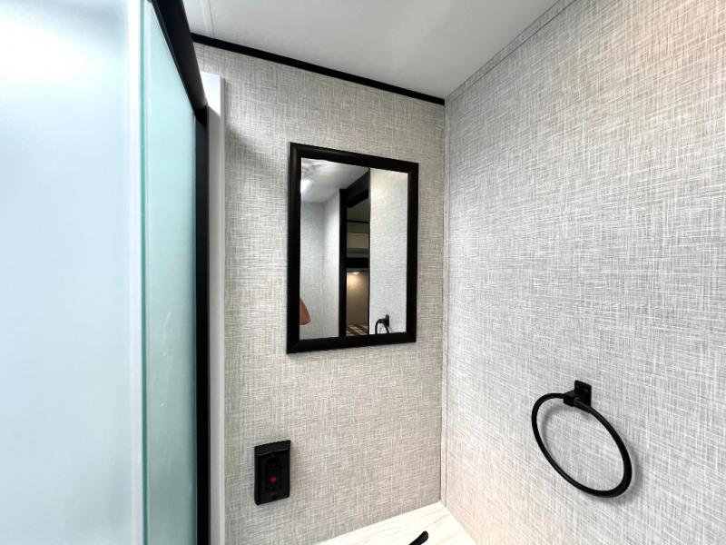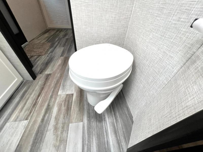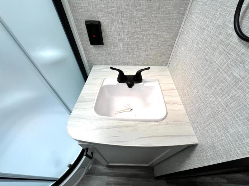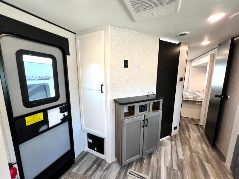 This front kitchen travel trailer is perfect for weekend trips or extended stays at the location of your choice! You'll love the ample counter space to prep meals, and there is a booth dinette where you can dine together each day. A theater seat is in great view of the entertainment center if you want to add a TV, or you may just find yourselves outdoors under the 20' power awning. This unit features a dual entry bath with a private entrance into the rear master bedroom. This room also includes a queen bed slide, a wardrobe and two dressers, plus additional storage with washer and dryer prep. And one of the dual entry doors is found here so you can slip out in the morning for some early fishing!
