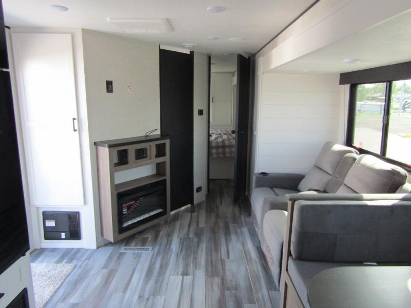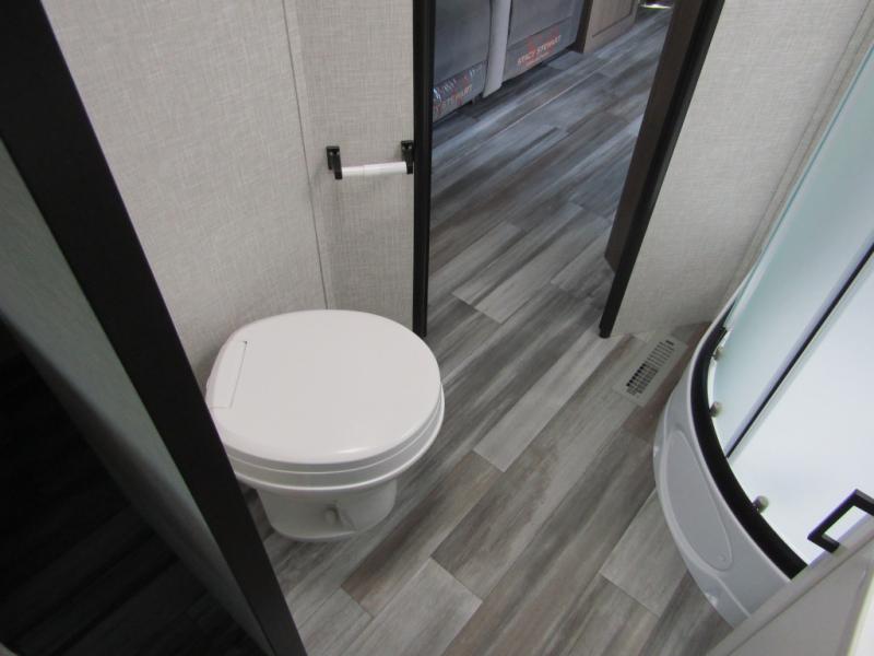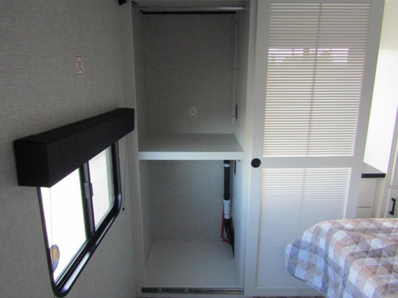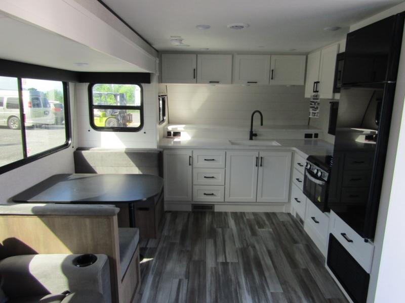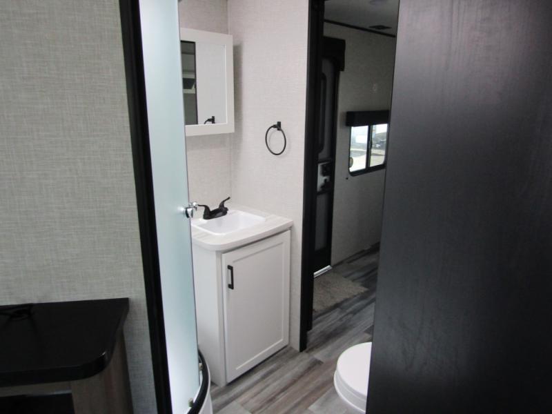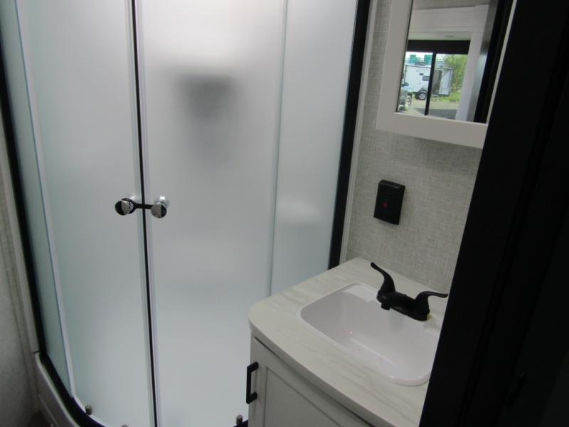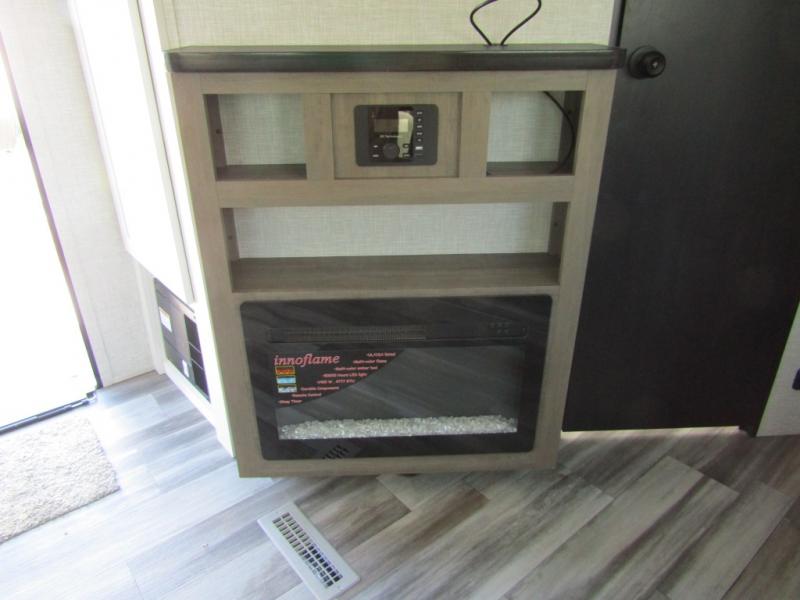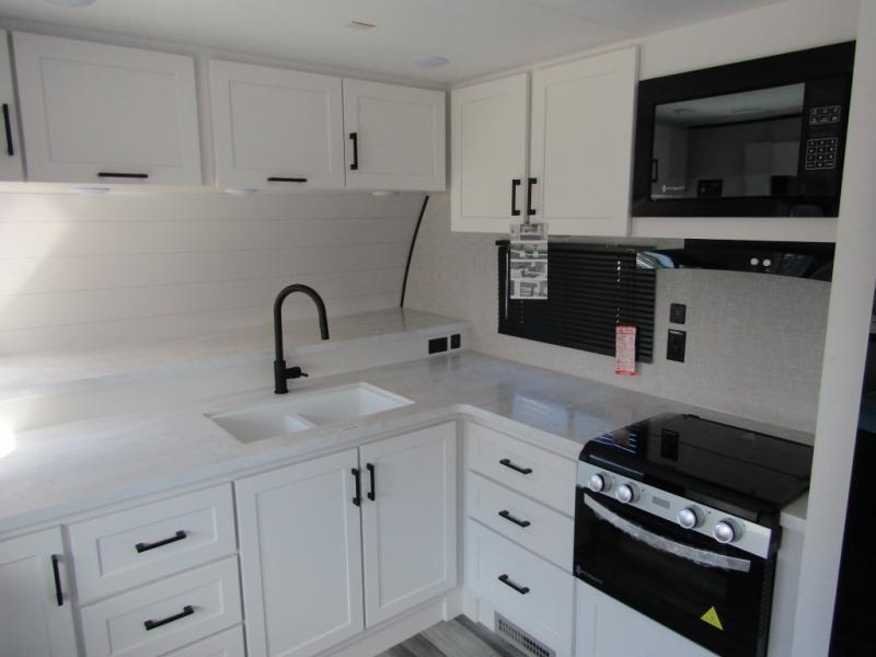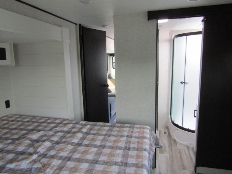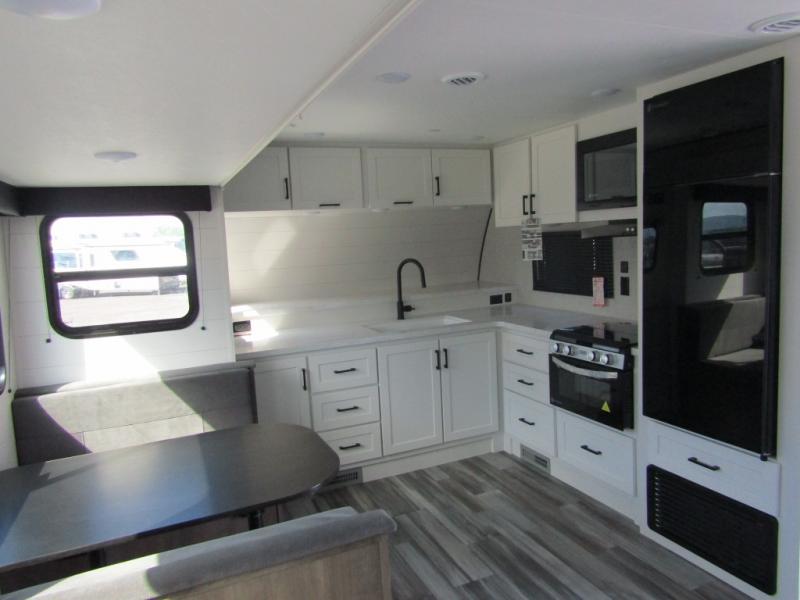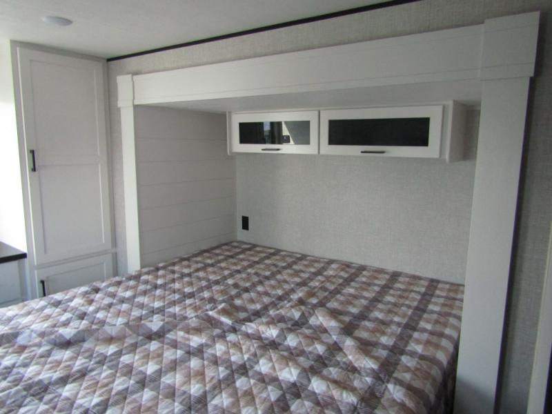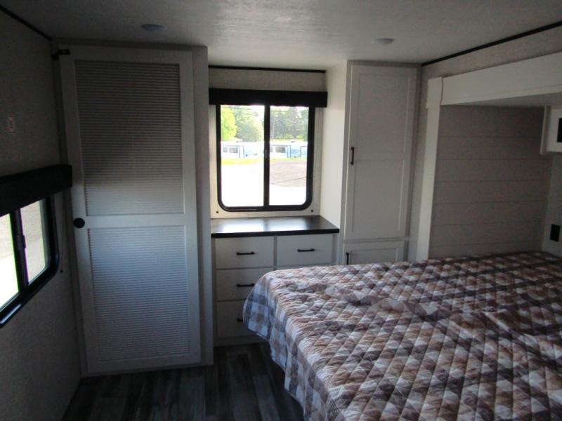 This front kitchen travel trailer is perfect for weekend trips or extended stays at the location of your choice! You'll love the ample counter space to prep meals, and there is a booth dinette where you can dine together each day. A theater seat is in great view of the entertainment center if you want to add a TV, or you may just find yourselves outdoors under the 20' power awning. This unit features a dual entry bath with a private entrance into the rear master bedroom. This room also includes a queen bed slide, a wardrobe and two dressers, plus additional storage with washer and dryer prep. And one of the dual entry doors is found here so you can slip out in the morning for some early fishing!