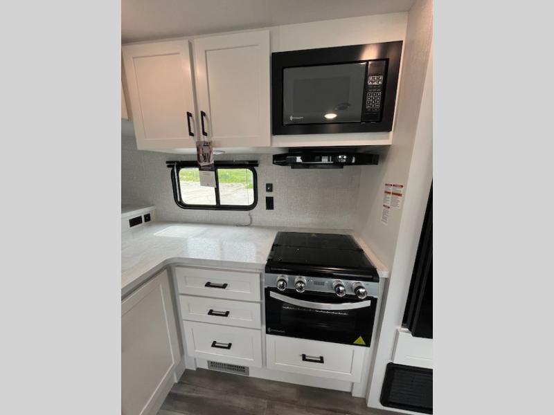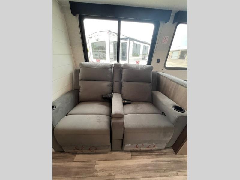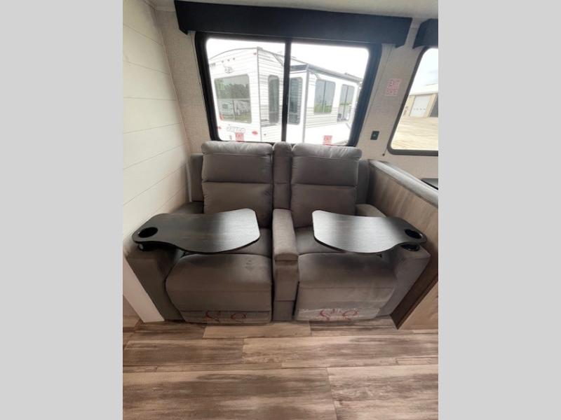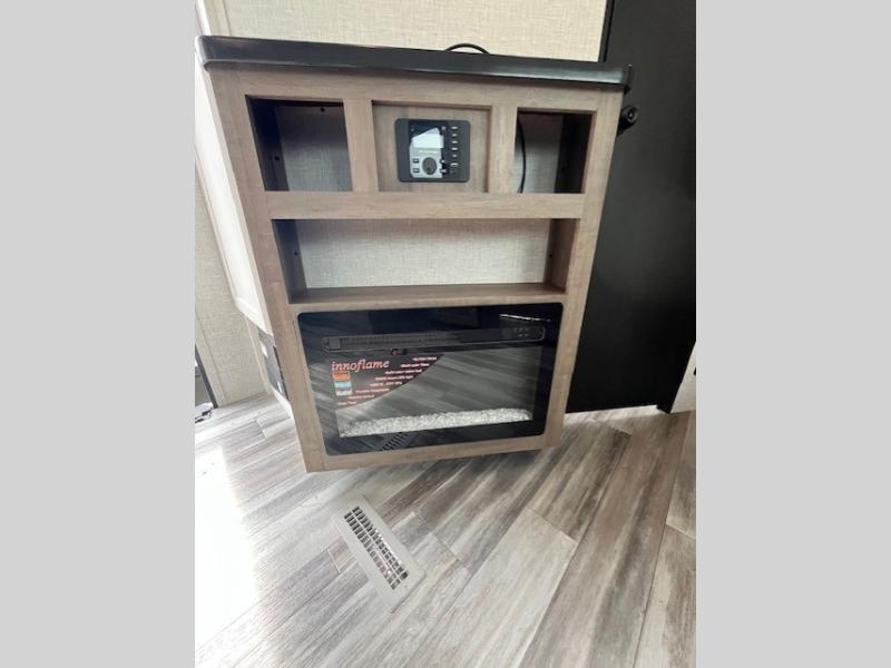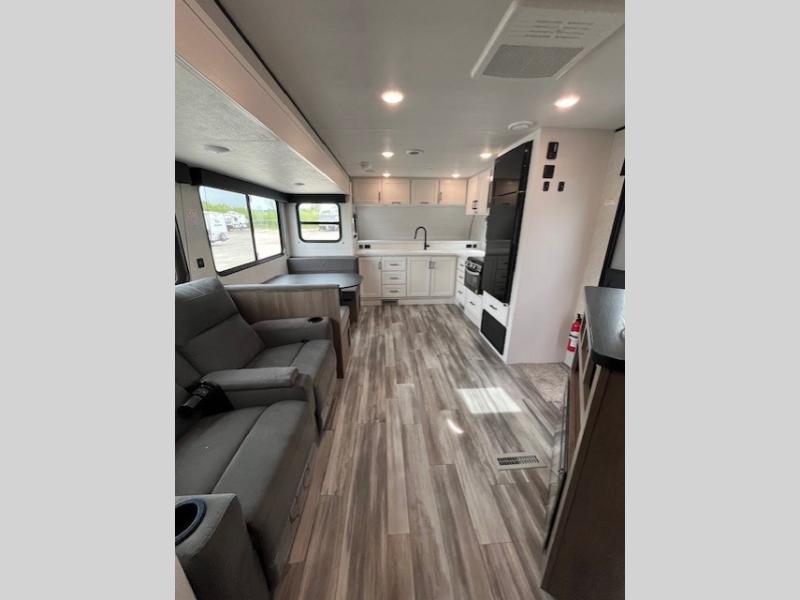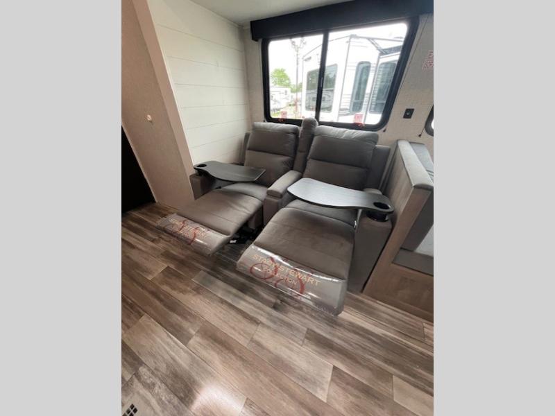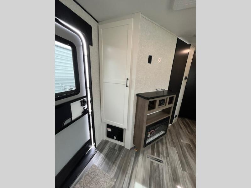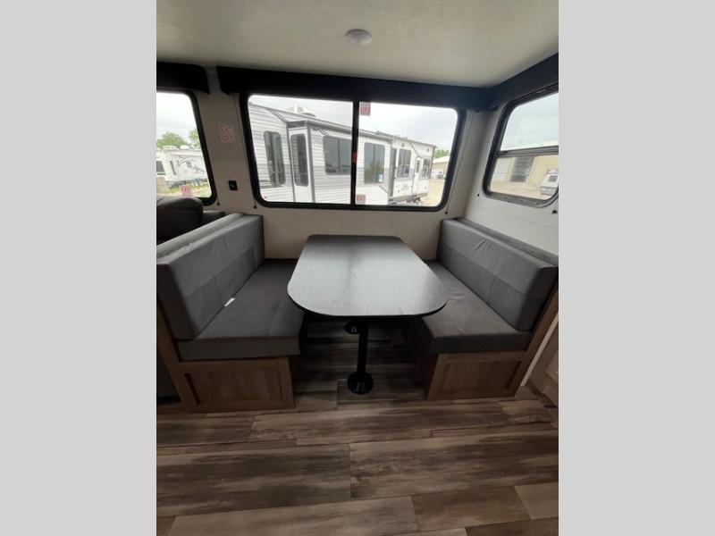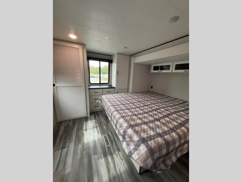 This front kitchen travel trailer is perfect for weekend trips or extended stays at the location of your choice! You'll love the ample counter space to prep meals, and there is a booth dinette where you can dine together each day. A theater seat is in great view of the entertainment center if you want to add a TV, or you may just find yourselves outdoors under the 20' power awning. This unit features a dual entry bath with a private entrance into the rear master bedroom. This room also includes a queen bed slide, a wardrobe and two dressers, plus additional storage with washer and dryer prep. And one of the dual entry doors is found here so you can slip out in the morning for some early fishing!
