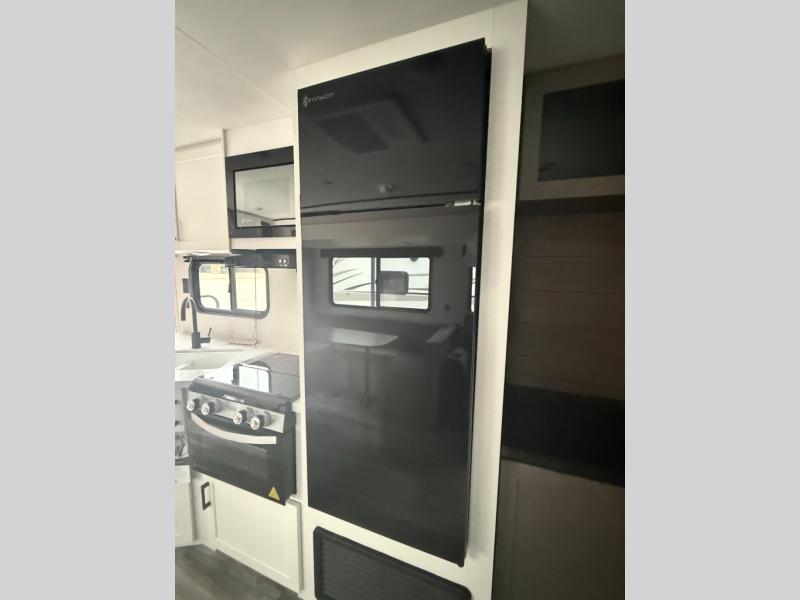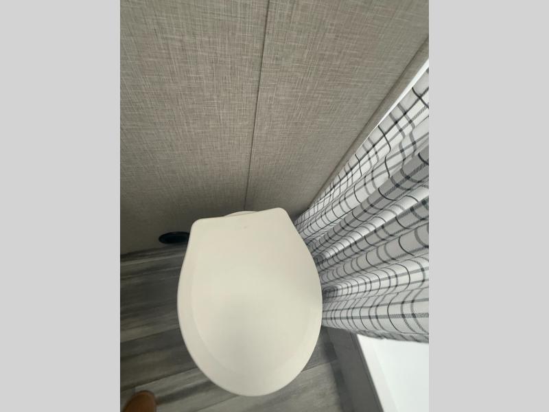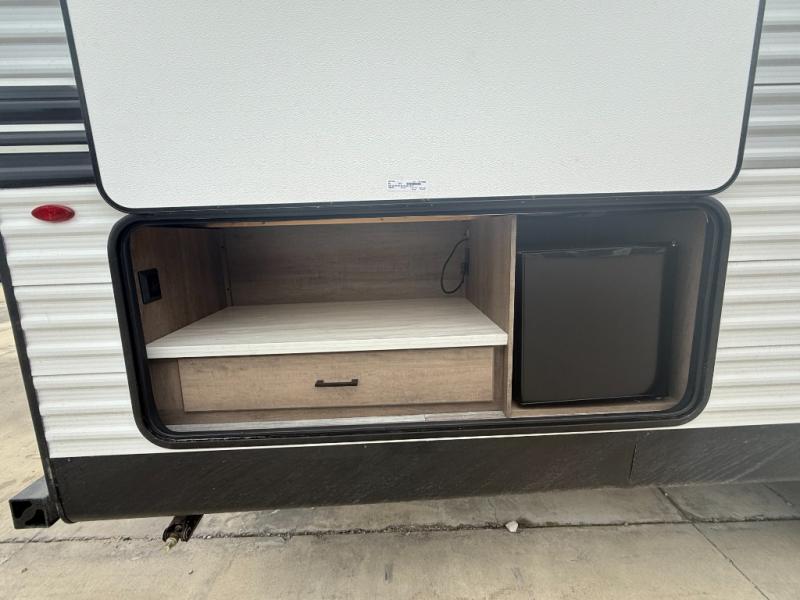 Loads of fun like hiking, fishing, and playing outdoor camping games are waiting for you to make that reservation, hitch up and head out! This trailer allows the owners to sleep in privacy behind the space saving sliding door on a 60" x 75" queen bed. And the kids or grandkids can sleep on the double-size bunks in the rear next to the full bathroom including a tub/shower. They even have a wardrobe nearby for their things. The slide out jackknife sofa and U-shaped dinette offers more floor space, a place to relax and dine, plus you can play games at the dinette. The kitchen includes full amenities at your fingertips, plus you all can enjoy the entertainment center with an LED Smart TV when inside. This model also includes an exterior pull-out griddle and a refrigerator to cook breakfast outdoors!