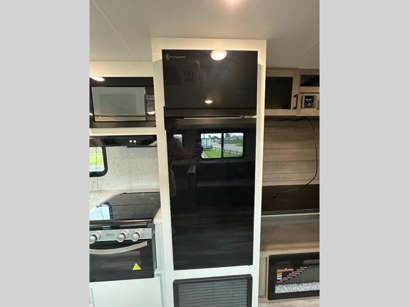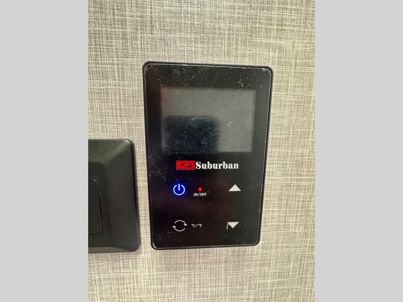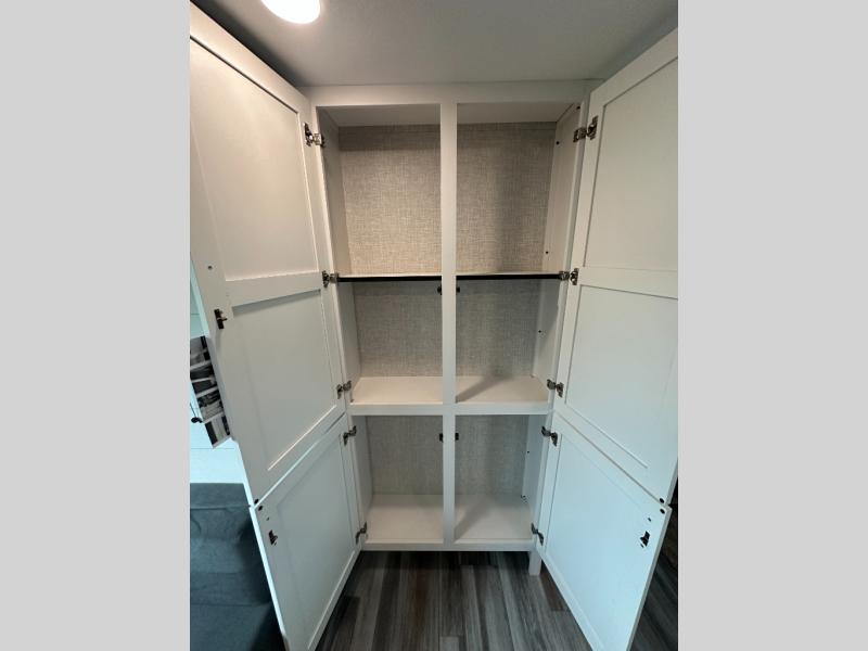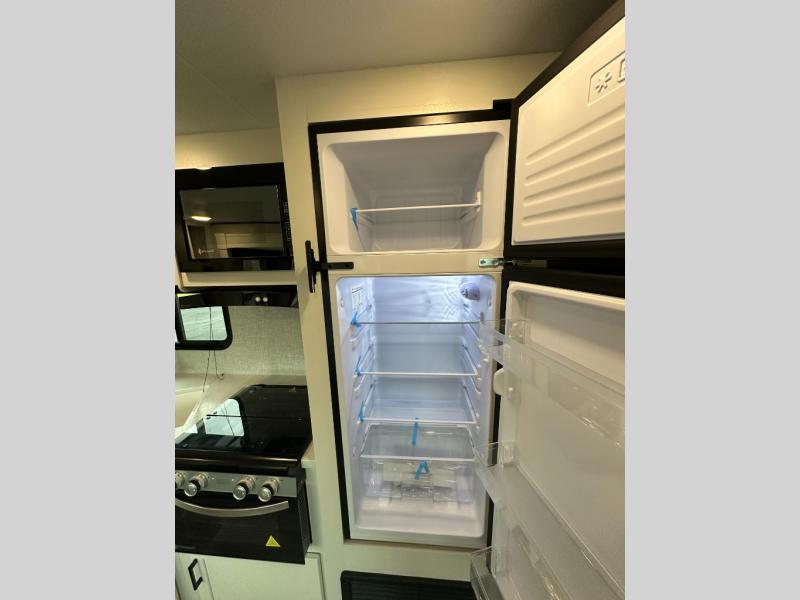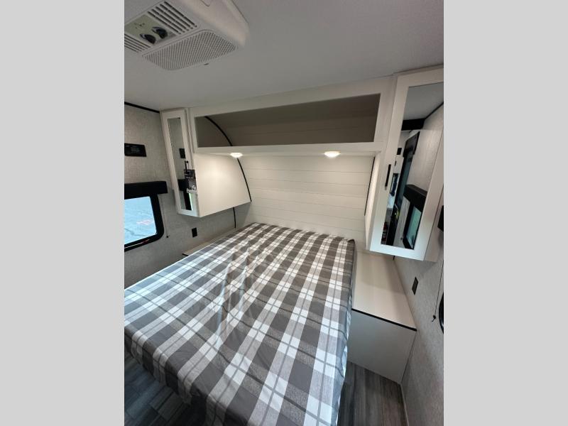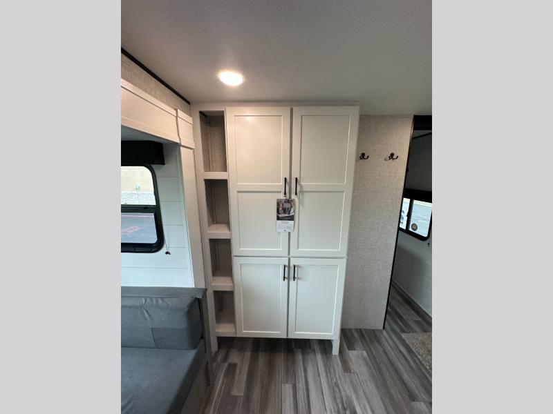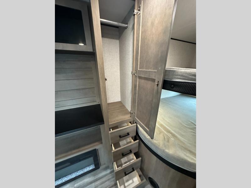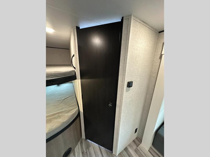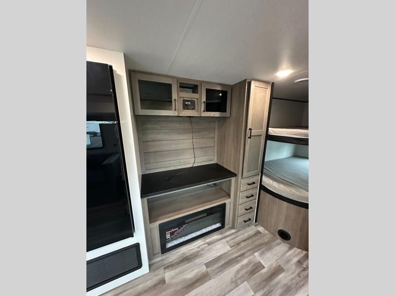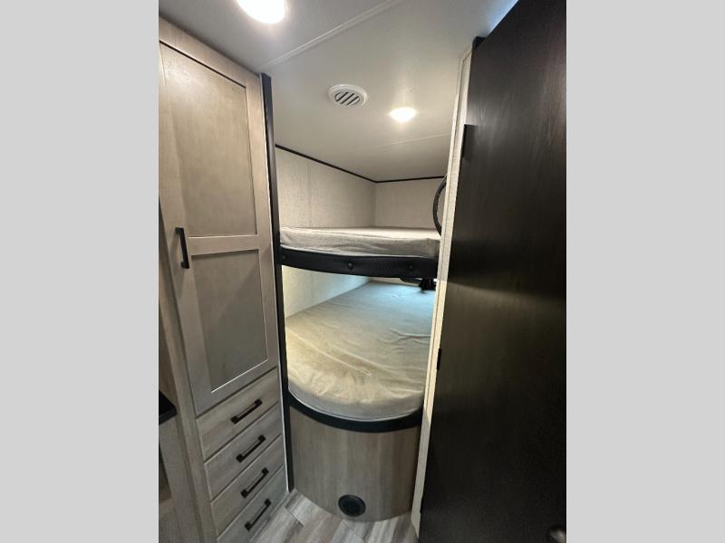 Loads of fun like hiking, fishing, and playing outdoor camping games are waiting for you to make that reservation, hitch up and head out! This trailer allows the owners to sleep in privacy behind the space saving sliding door on a 60" x 75" queen bed. And the kids or grandkids can sleep on the double-size bunks in the rear next to the full bathroom including a tub/shower. They even have a wardrobe nearby for their things. The slide out jackknife sofa and U-shaped dinette offers more floor space, a place to relax and dine, plus you can play games at the dinette. This model also includes an exterior refrigerator so you can grab a cold drink while under the 16' power awning!